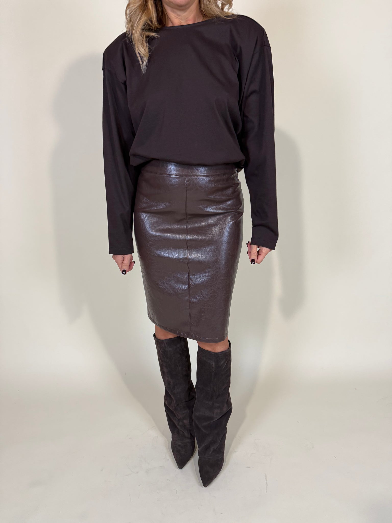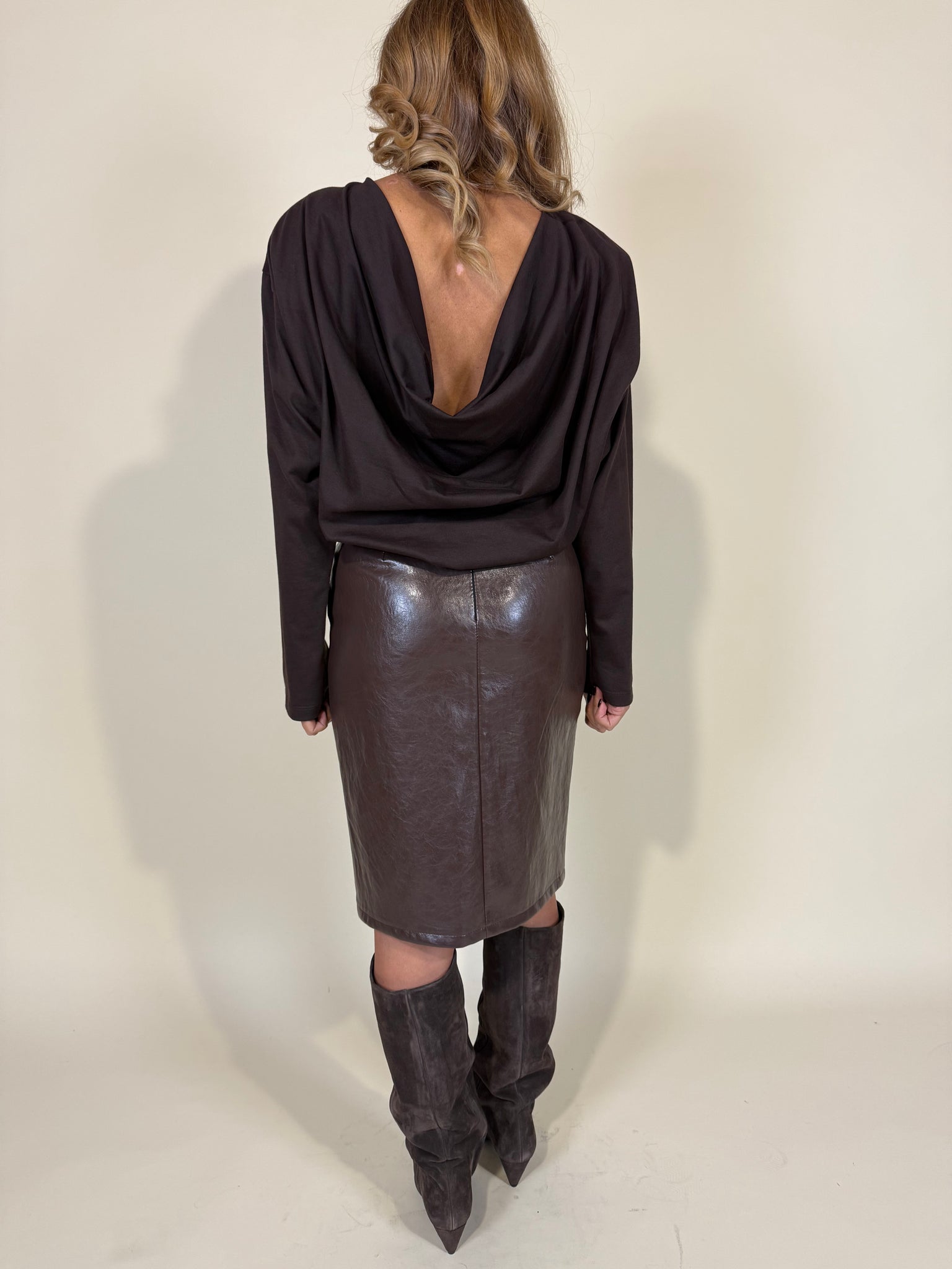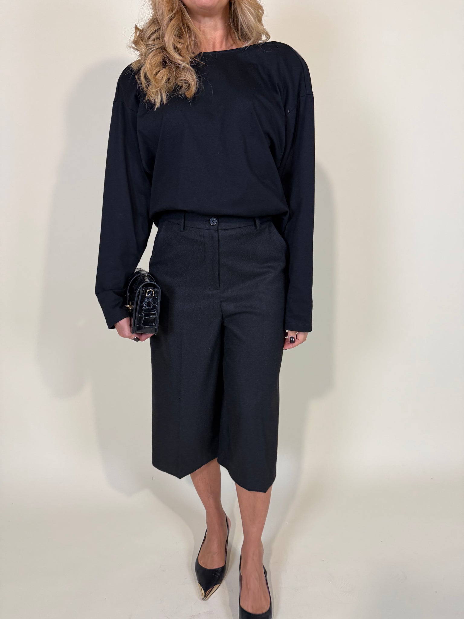 Maglia a manica lunga in 100% cotone disponibile nelle varianti colore moro e nero. Dettaglio spalla imbottita e modello con scollo morbido sulla schiena.