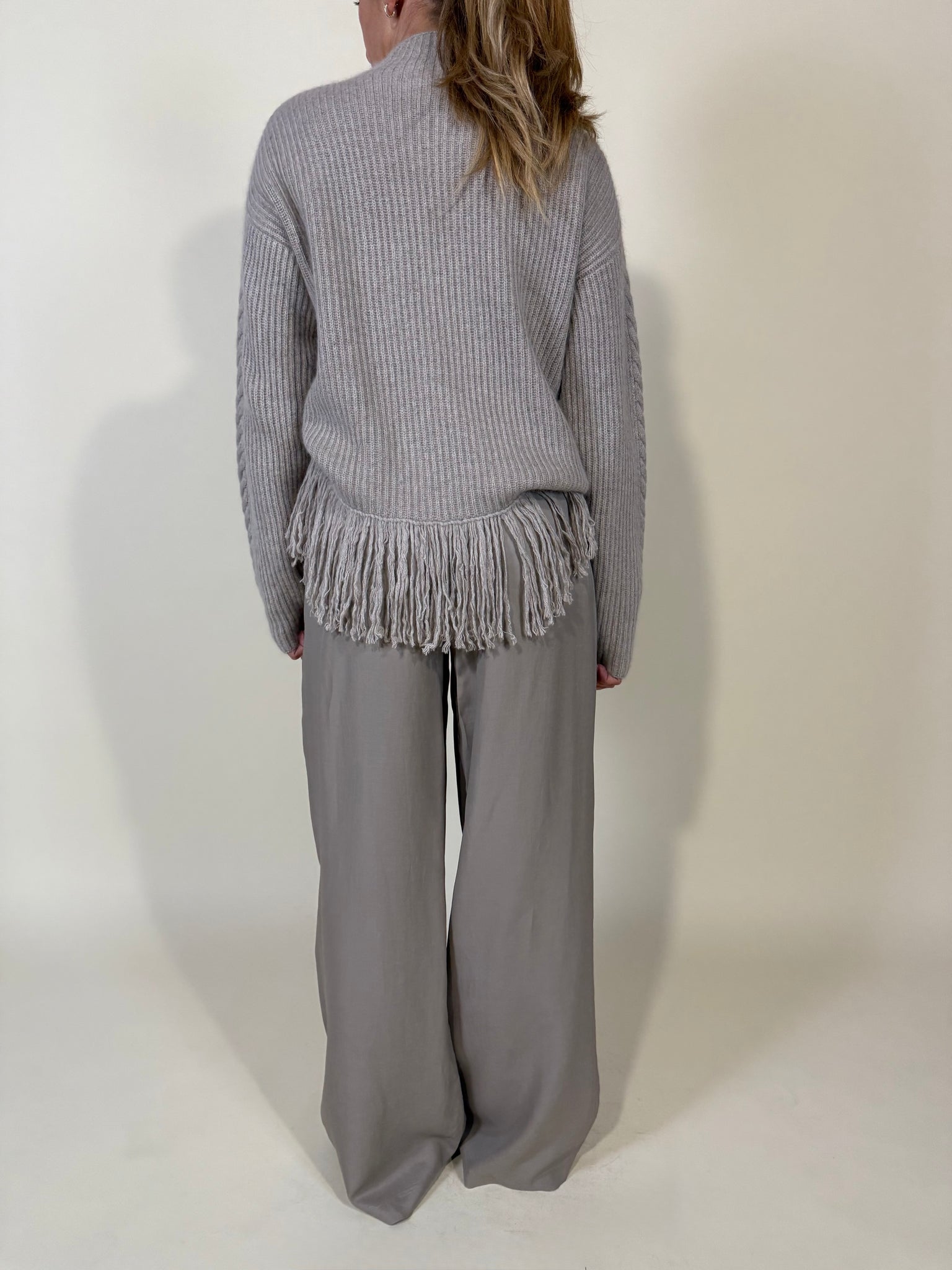 Maglione in filato medio spesso nella variante colore beige. Collo alto e fondo maglia a frangia tono su tono. Dettaglio trama a treccia sulla trama del filato. Modello morbido.
