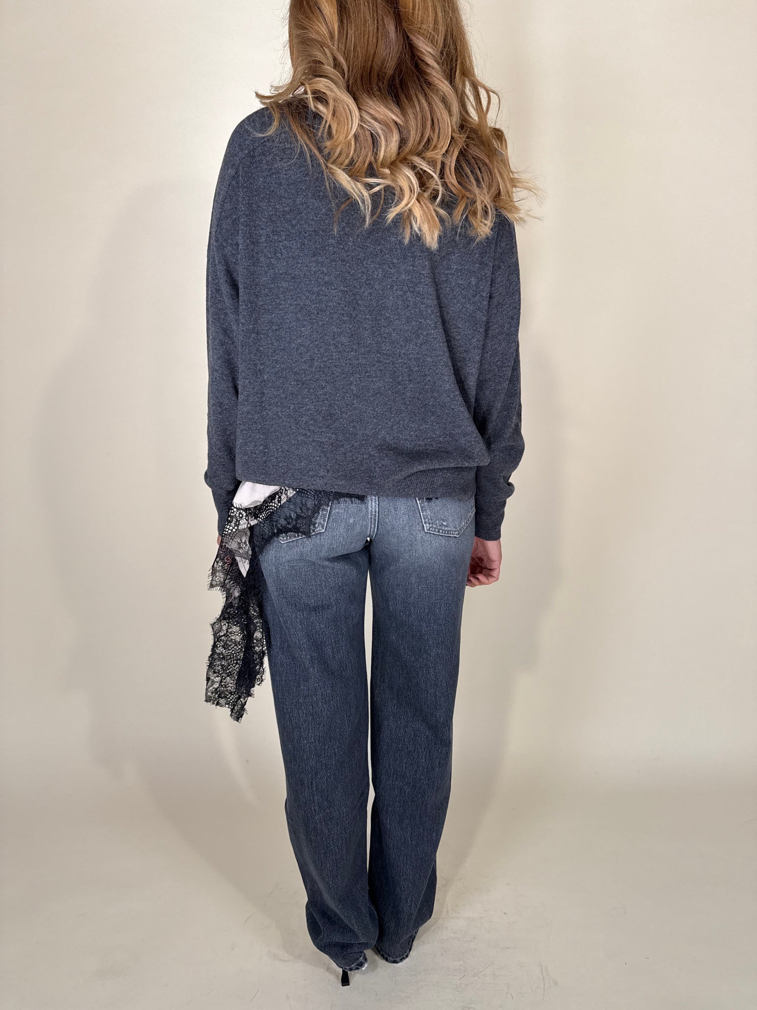 Maglia in pura lana morbida disponibile nella variante colore grigia antracite. Modello girocollo, variante morbida oversize e lunga. Fondo maglia con dettaglio spacchetto.
