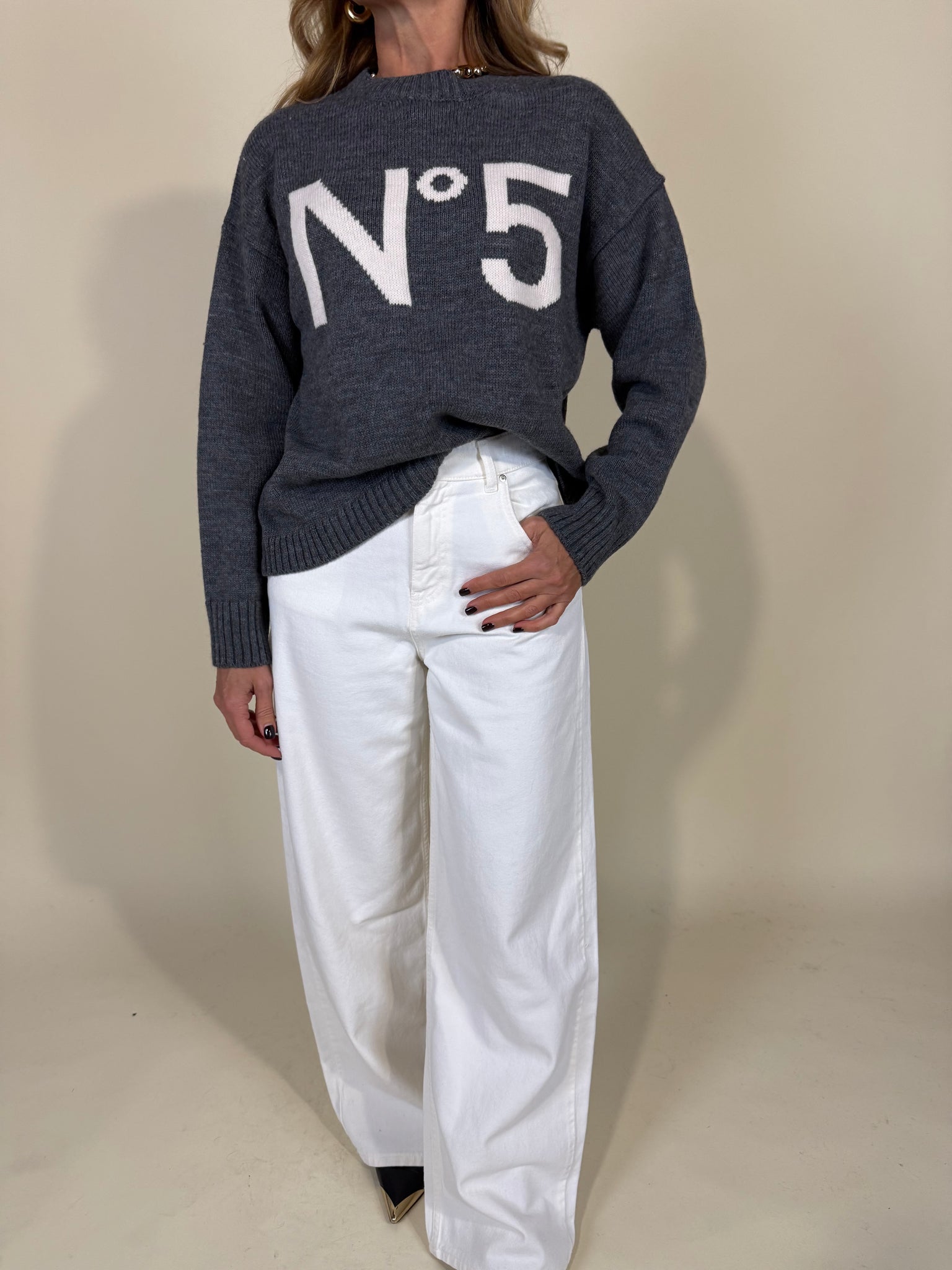 Maglia manica lunga disponibile nelle varianti colore nero e grigio. Modello girocollo con scritta applicata a ricamo a contrasto sui toni del bianco gesso N.5.