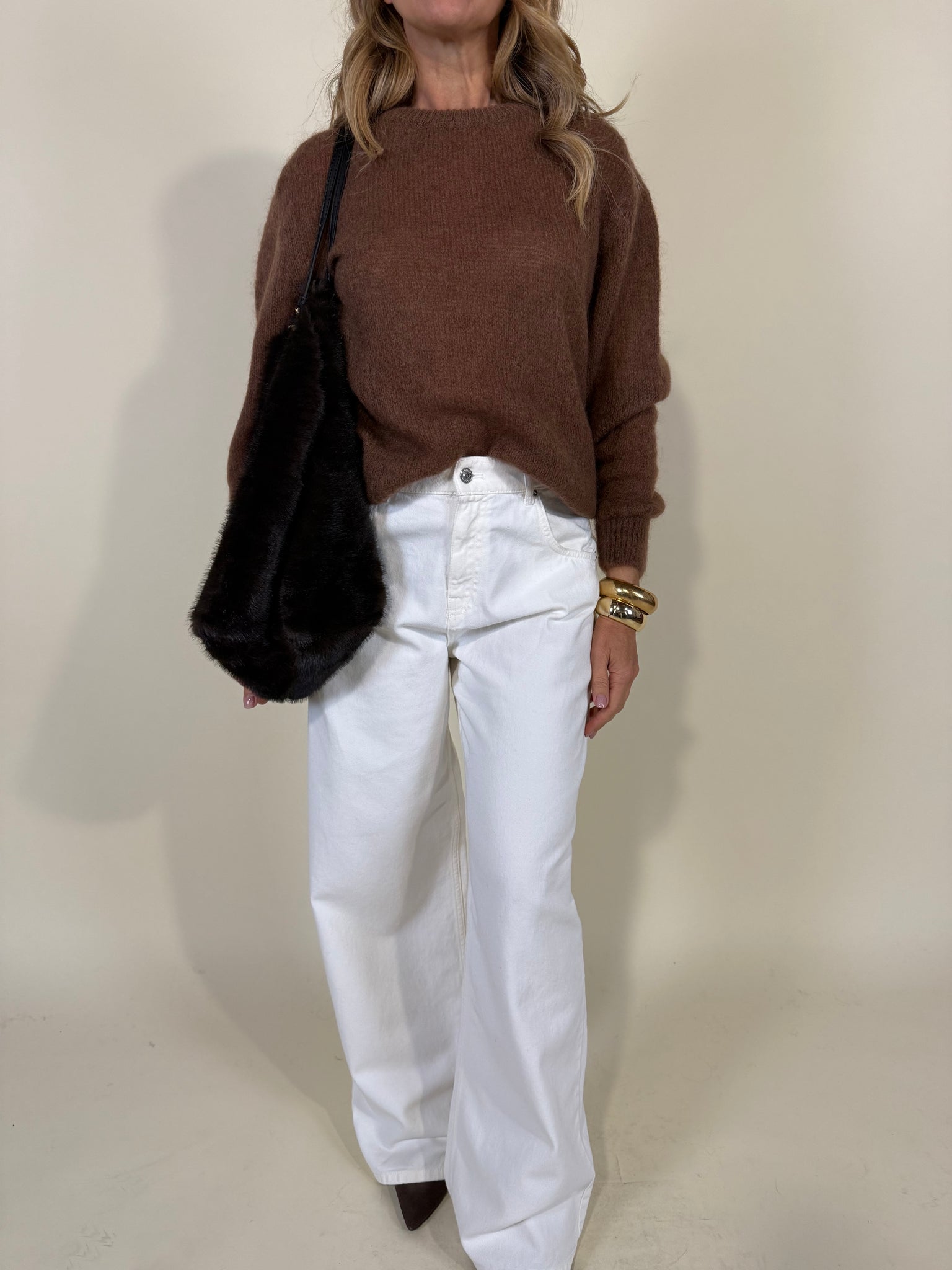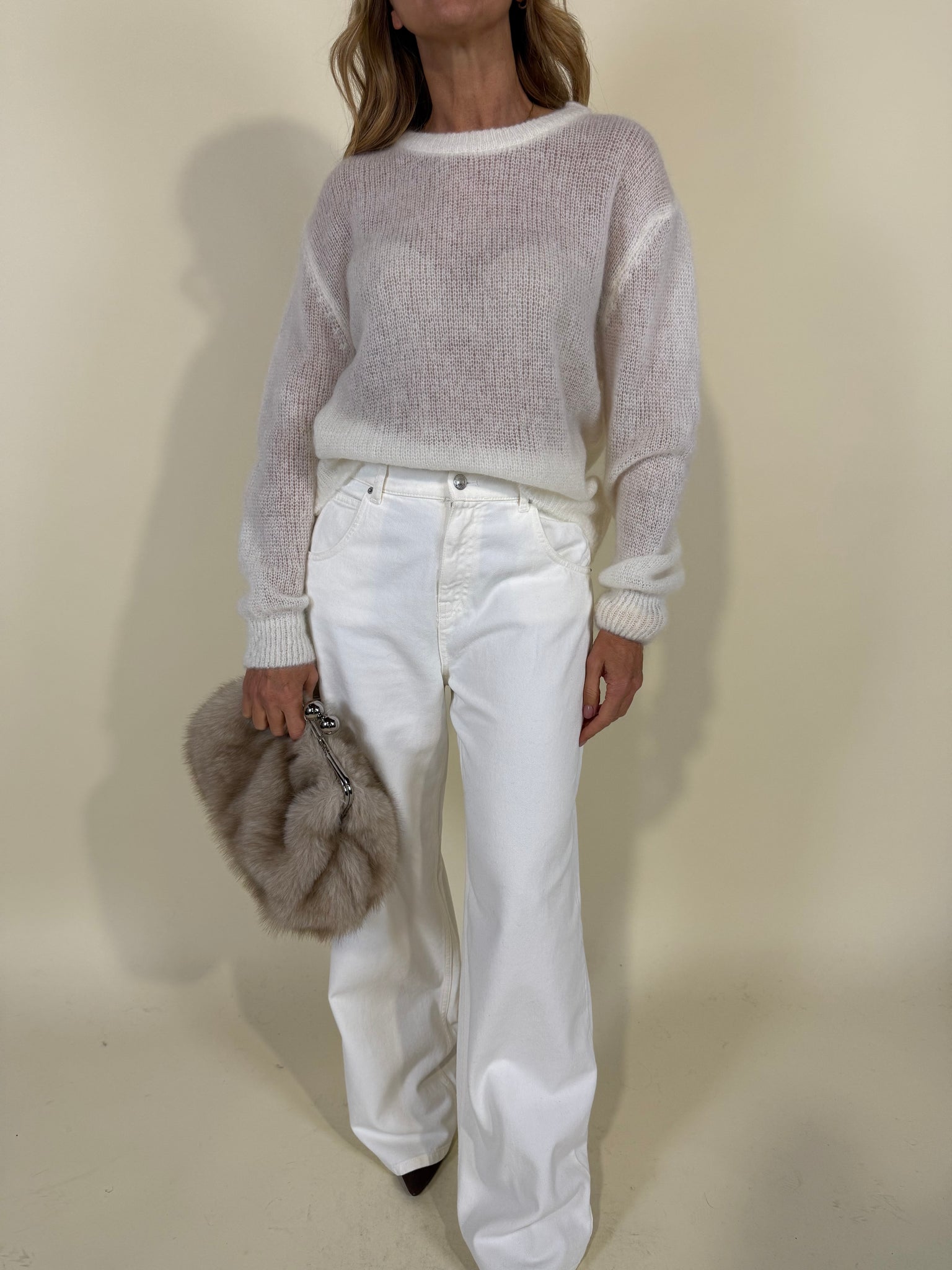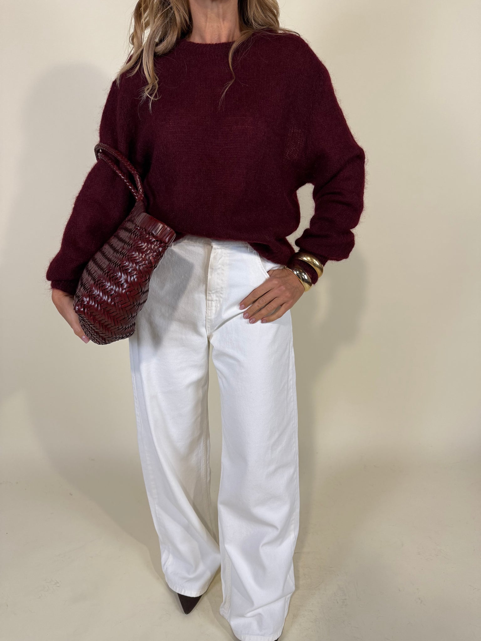 Maglione in filato sottile morbidissimo in misto mohair e lana girocollo nella variante colore panna (crema), latte, camel e bordeaux. Fondo maglia ad elastico e polsini ad elastico. Modello oversize morbido.