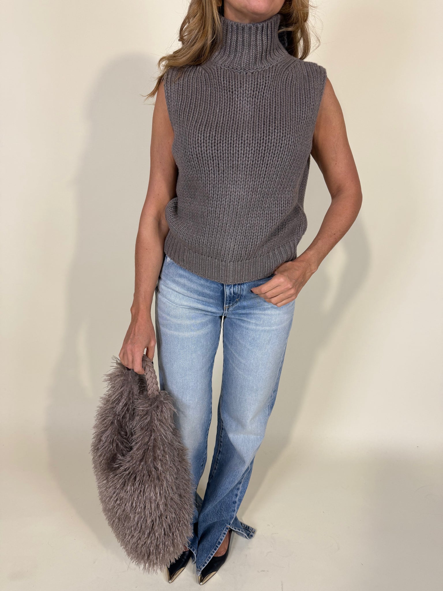 Maglia smanicata in trama filato spesso disponibile nella variante colore noce. Modello con collo alto e dettaglio oblò aperto sulla schiena, simil goccia. Fascia sul fondo maglia ad elastico in maxi costina.