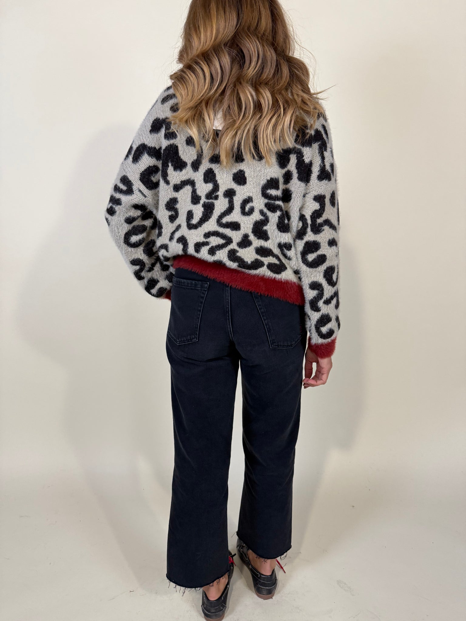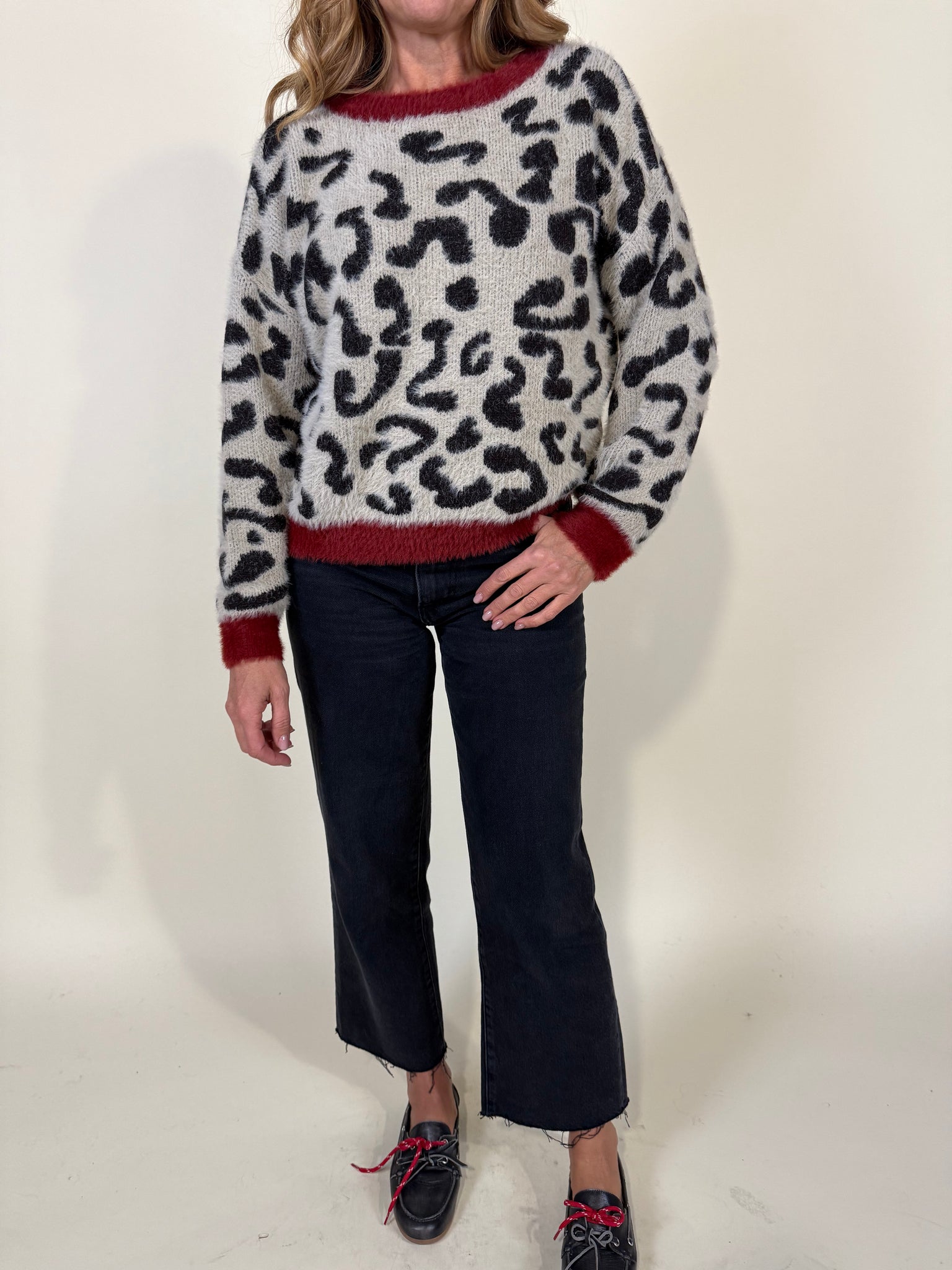 Maglia modello girocollo in stampa fantasia zebrata con dettaglio profili rosso acceso. Modello morbido con spalla scesa.