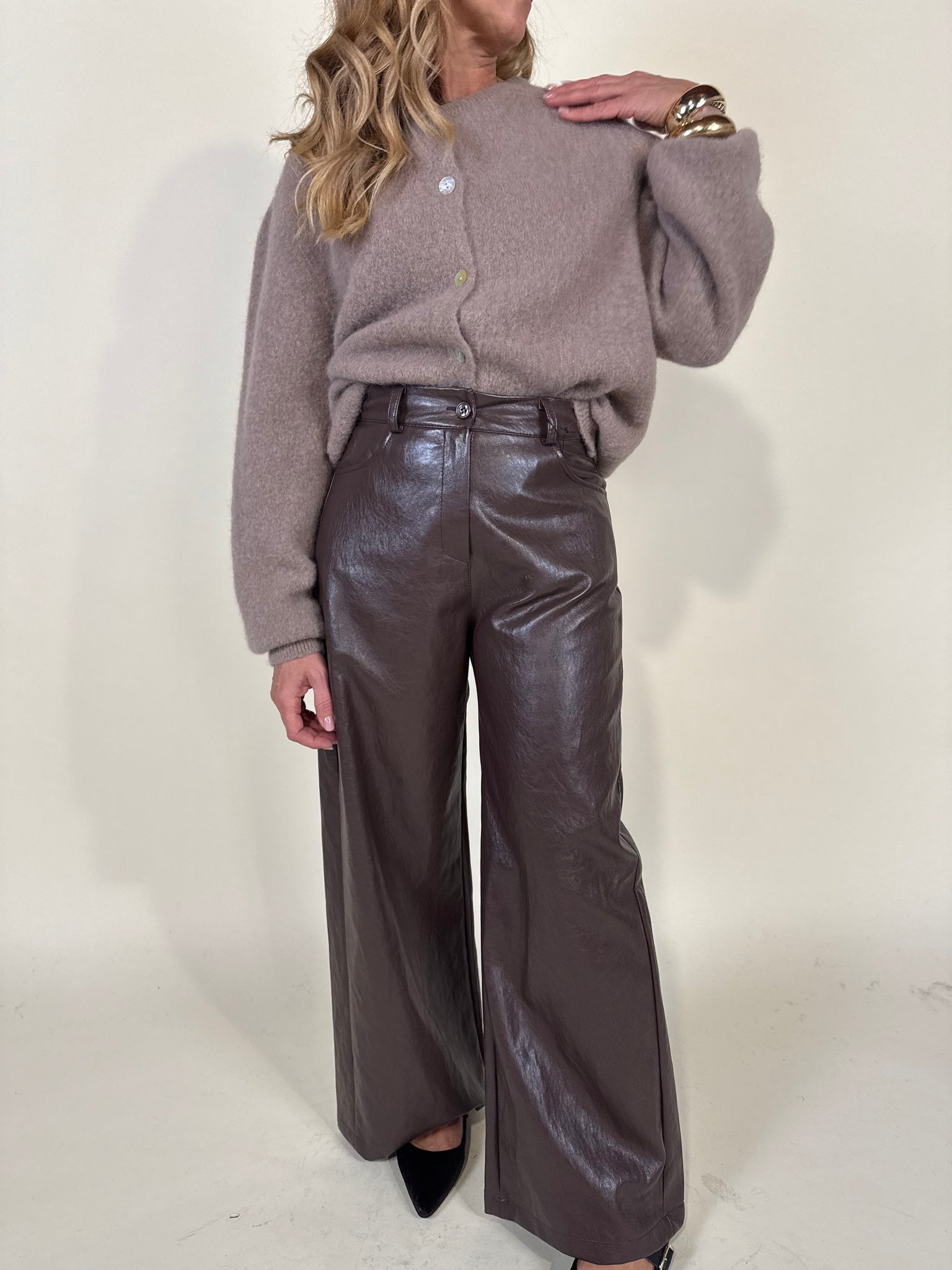 Pantalone modello ecopelle disponibile nella variante colore moro effetto invecchiato simil stropicciato. Modello gamba ampia morbida. Modello cinque tasche. Chiusura con zip centrale e bottone unico.
