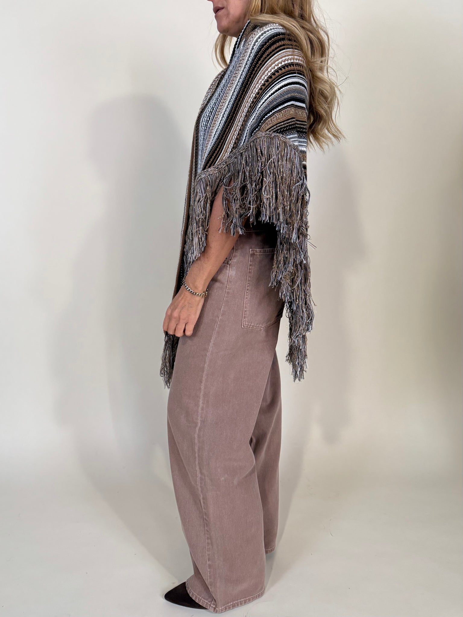 Scialle in maglia disponibile nella fantasia rigata multicolor sui toni del camel, nero, grigio e panna. Dettaglio filo di lurex dorato e dettaglio maxi frange tono su tono a profilo fondo scialle. Modello senza chiusura.