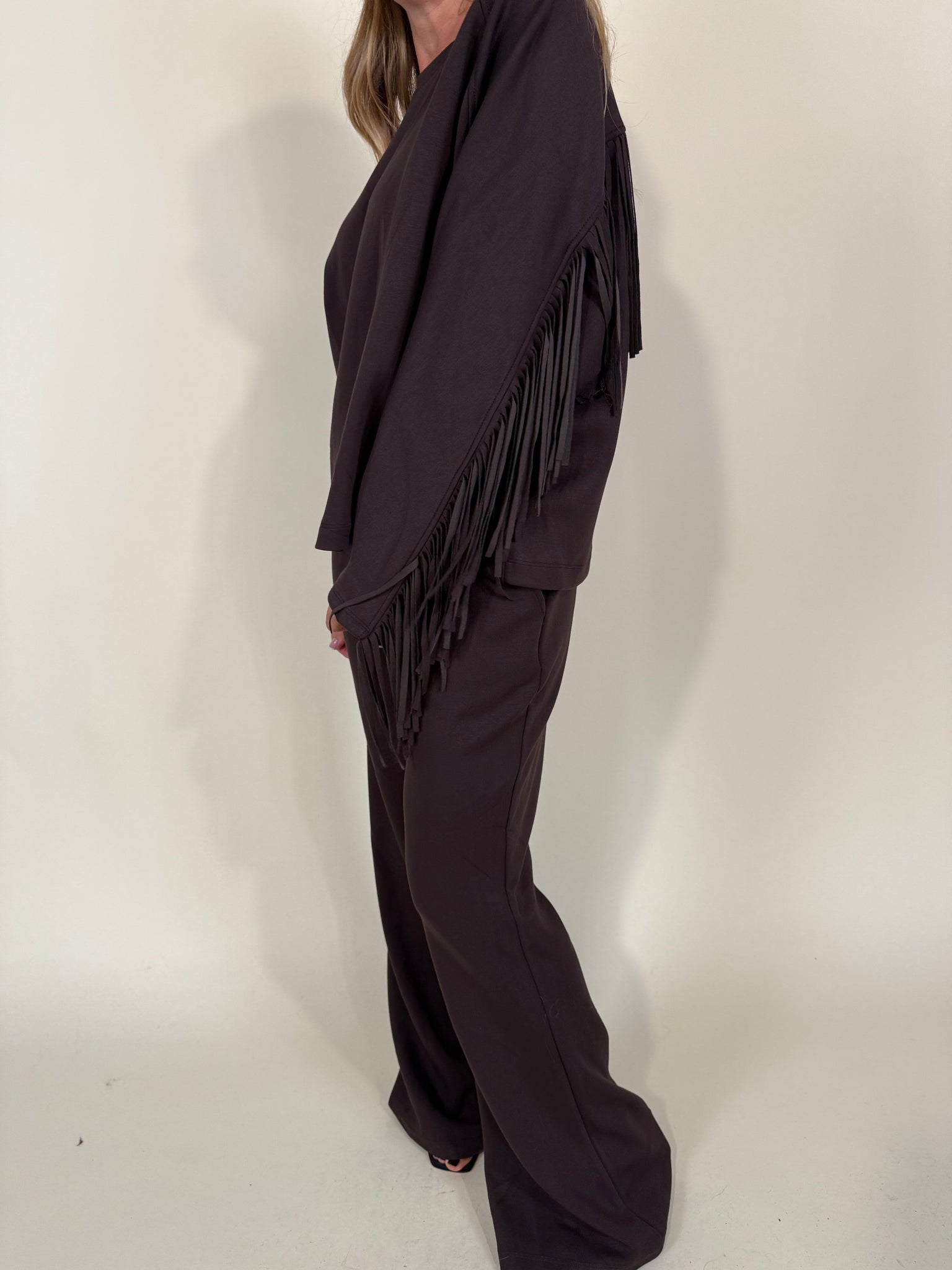 Pantalone modello jogger morbido con gamba appoggiata che svasa sul finale . Elastico in vita con coulisse tono su tono. Tessuto effetto modal. Disponibile vino, nero e moro.