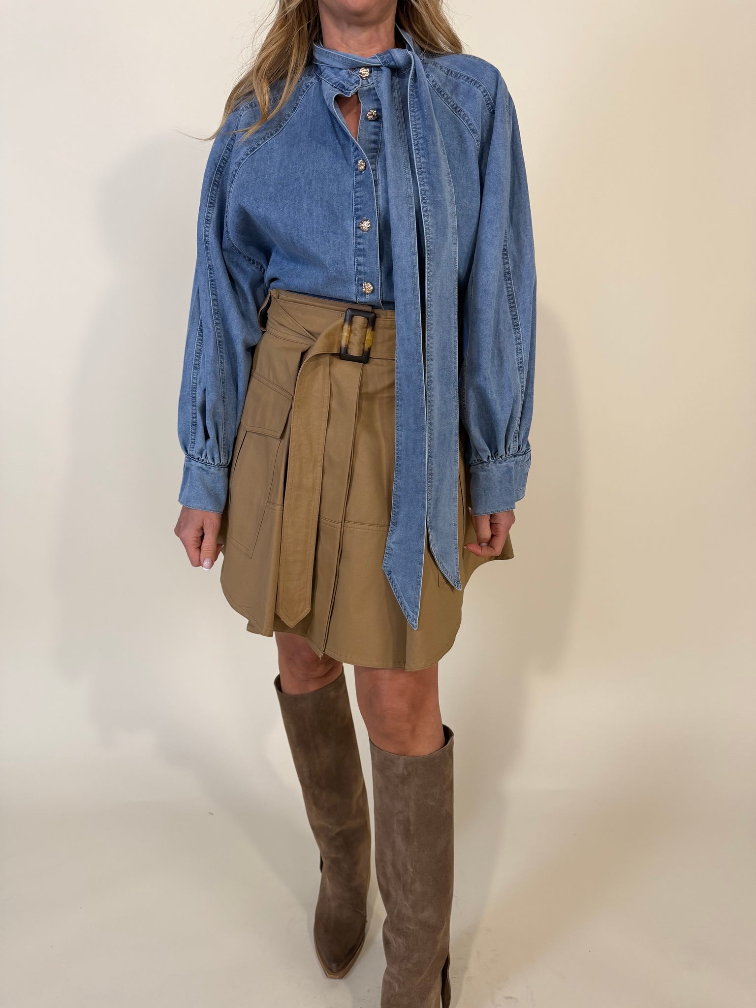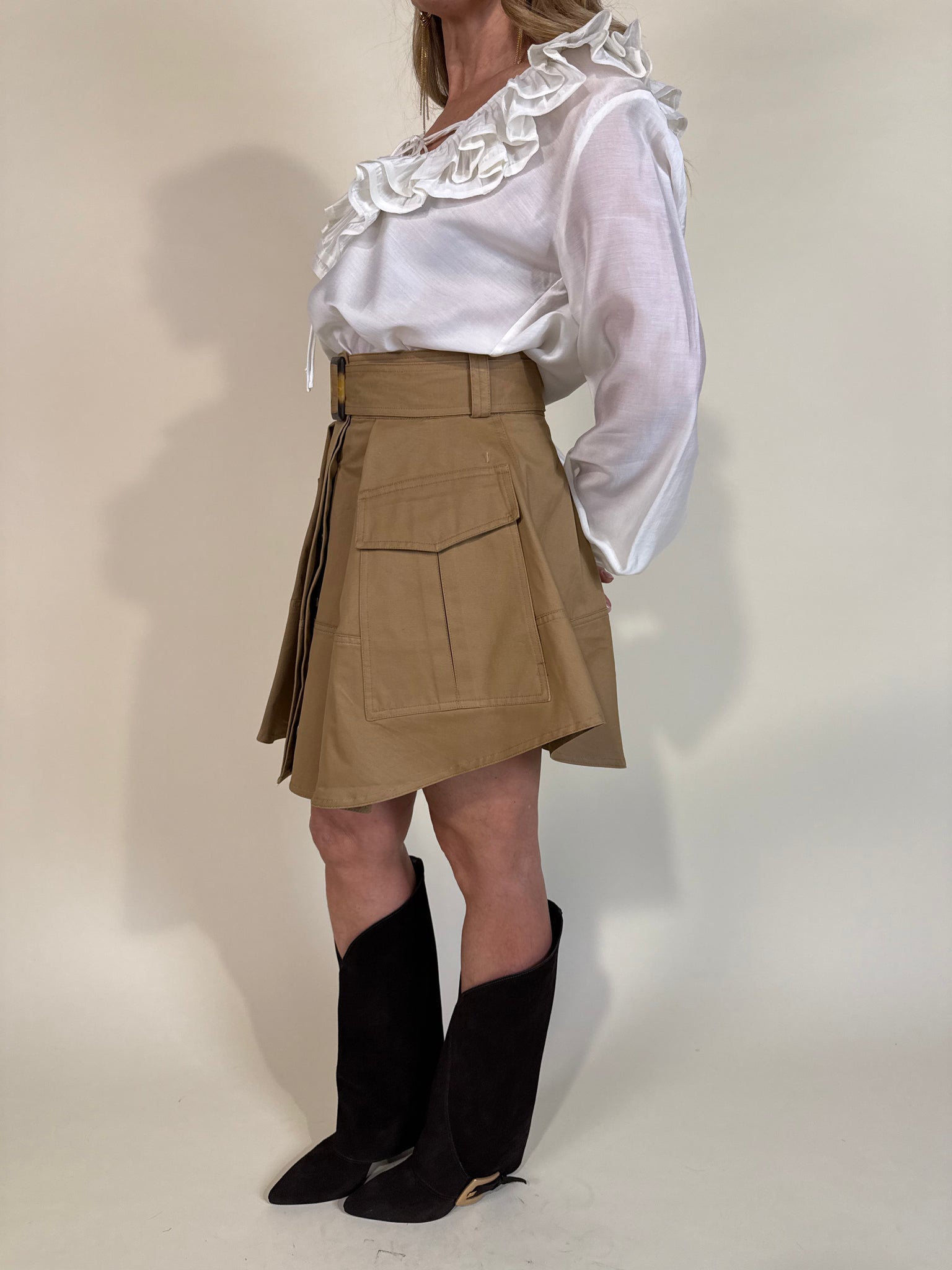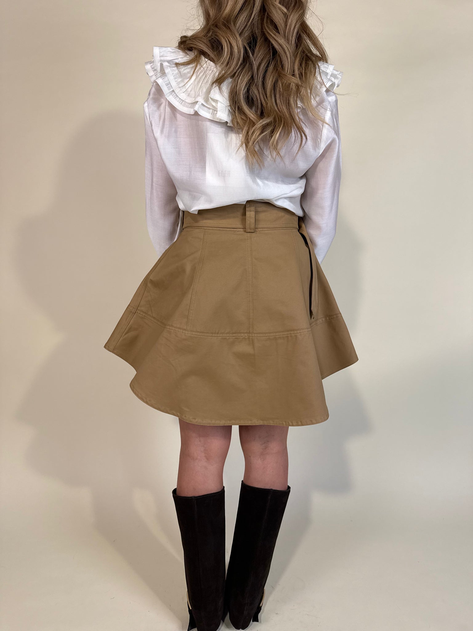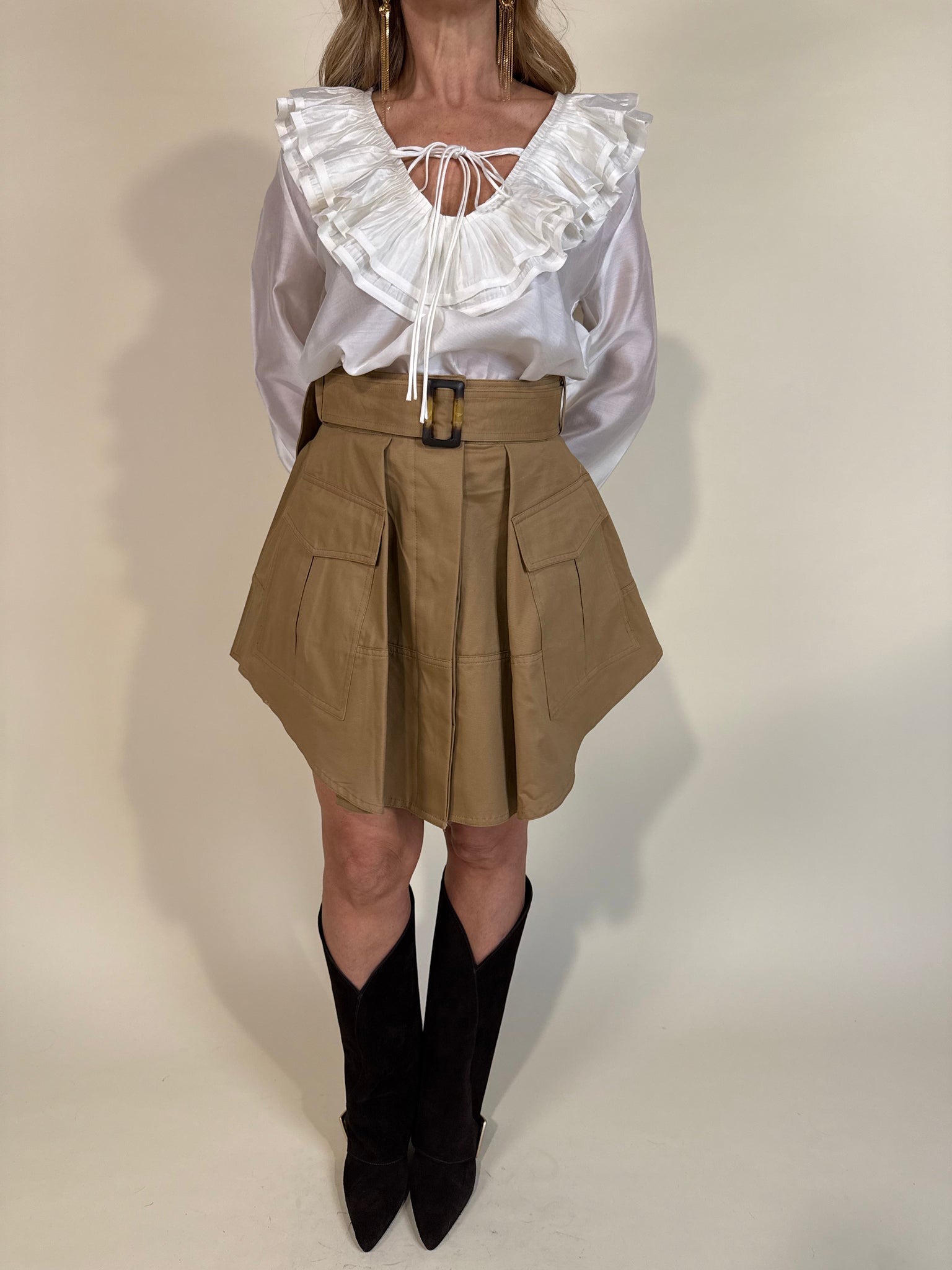 Gonna modello corto disponibile nella variante colore unica cammello. Modello con dettaglio bottoni tono su tono e tasche applicate. Modello con fondo semi svasato. Modello con cintura in vita.