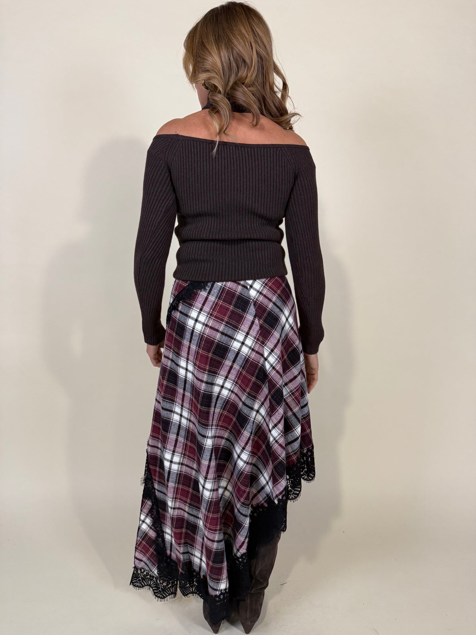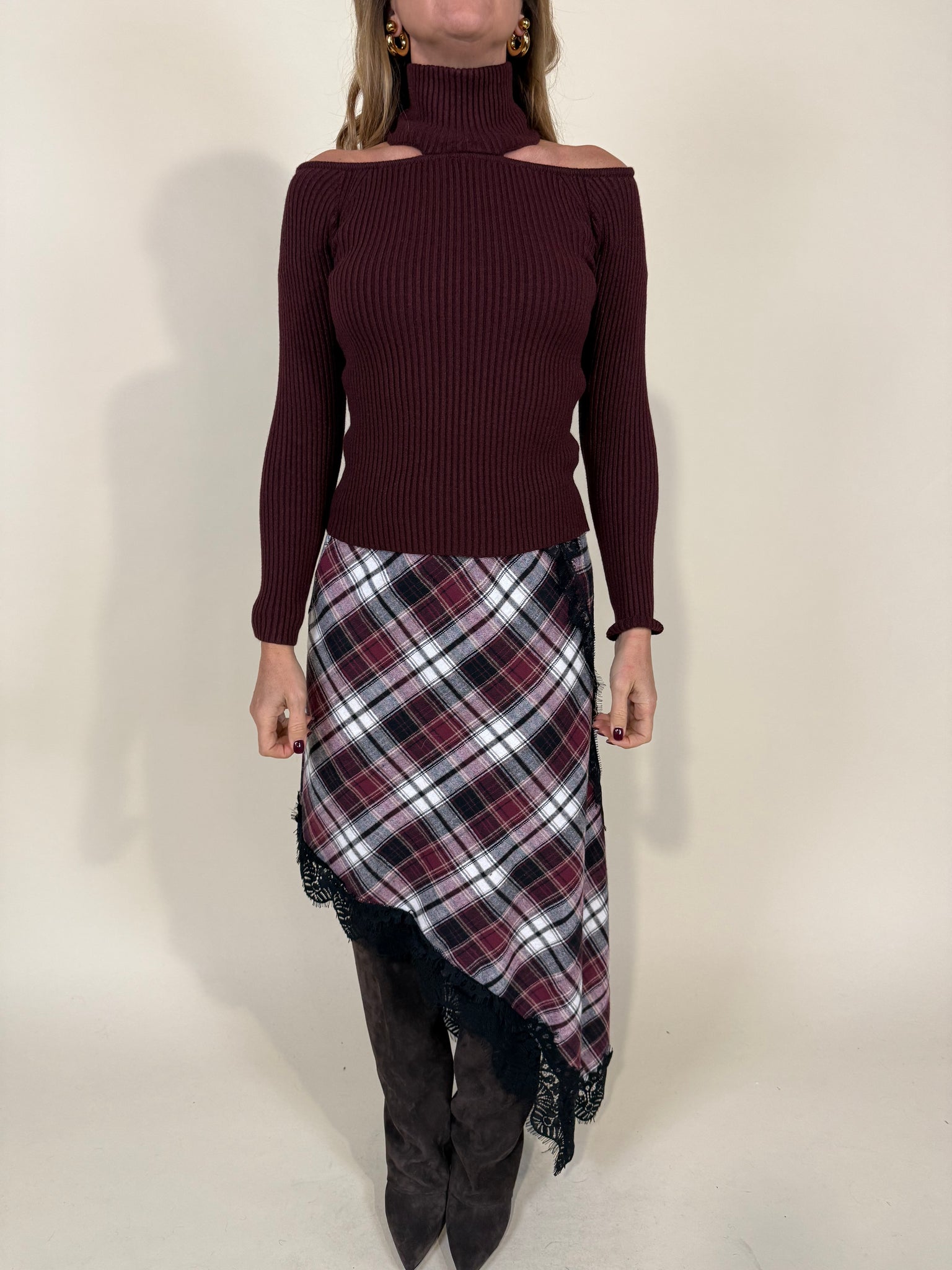 gonna in fantasia ceck disponibile nei colori del rosso. Gonna con dettaglio pizzo e spacco laterale. Elastico in vita. Tessuto in 25% cotone e 75% poliestere.
