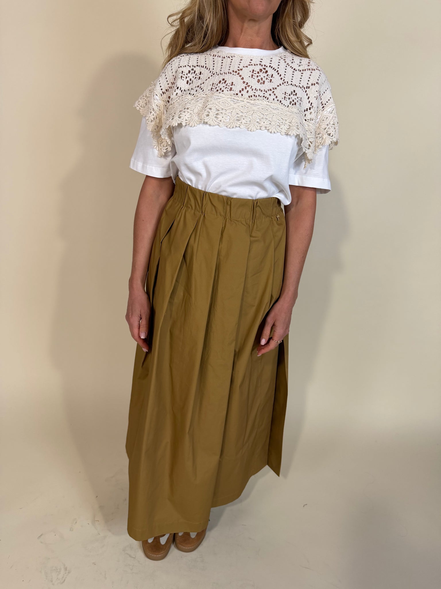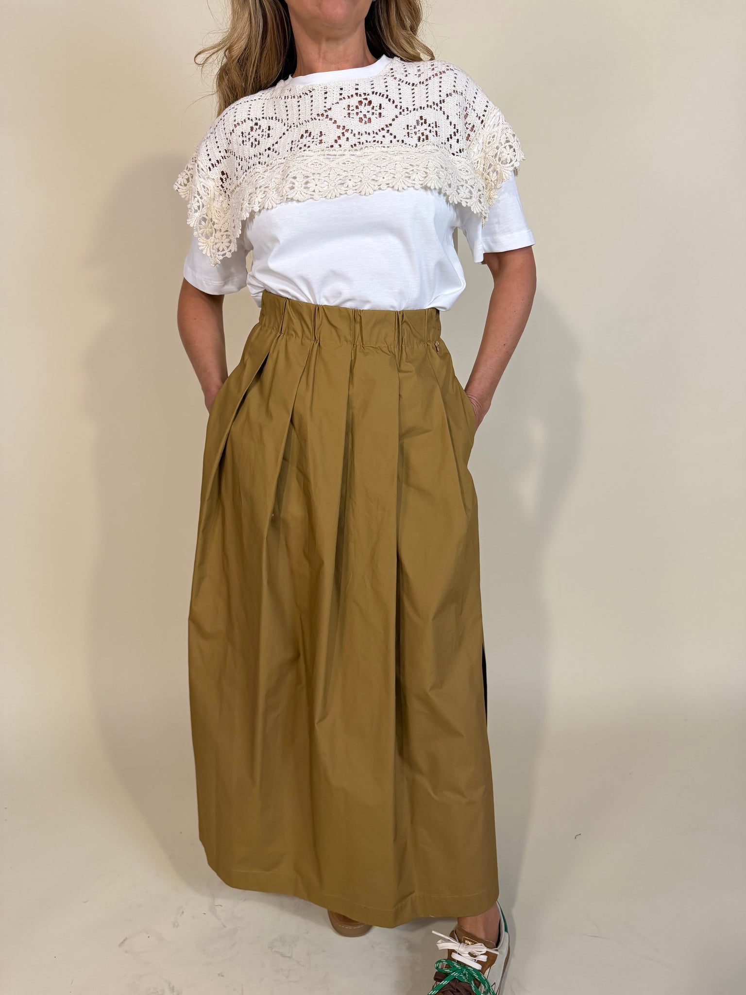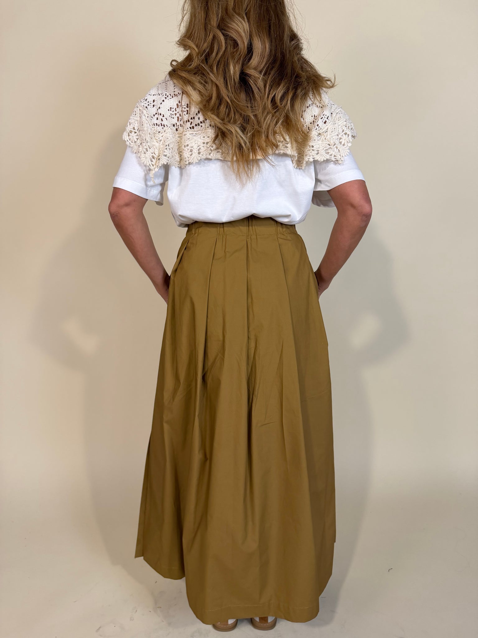 Gonna ampia con elastico in vita disponibile nella variante colore unico cognac. Modello super ampio morbido con pences. Modello con spacchi laterali.