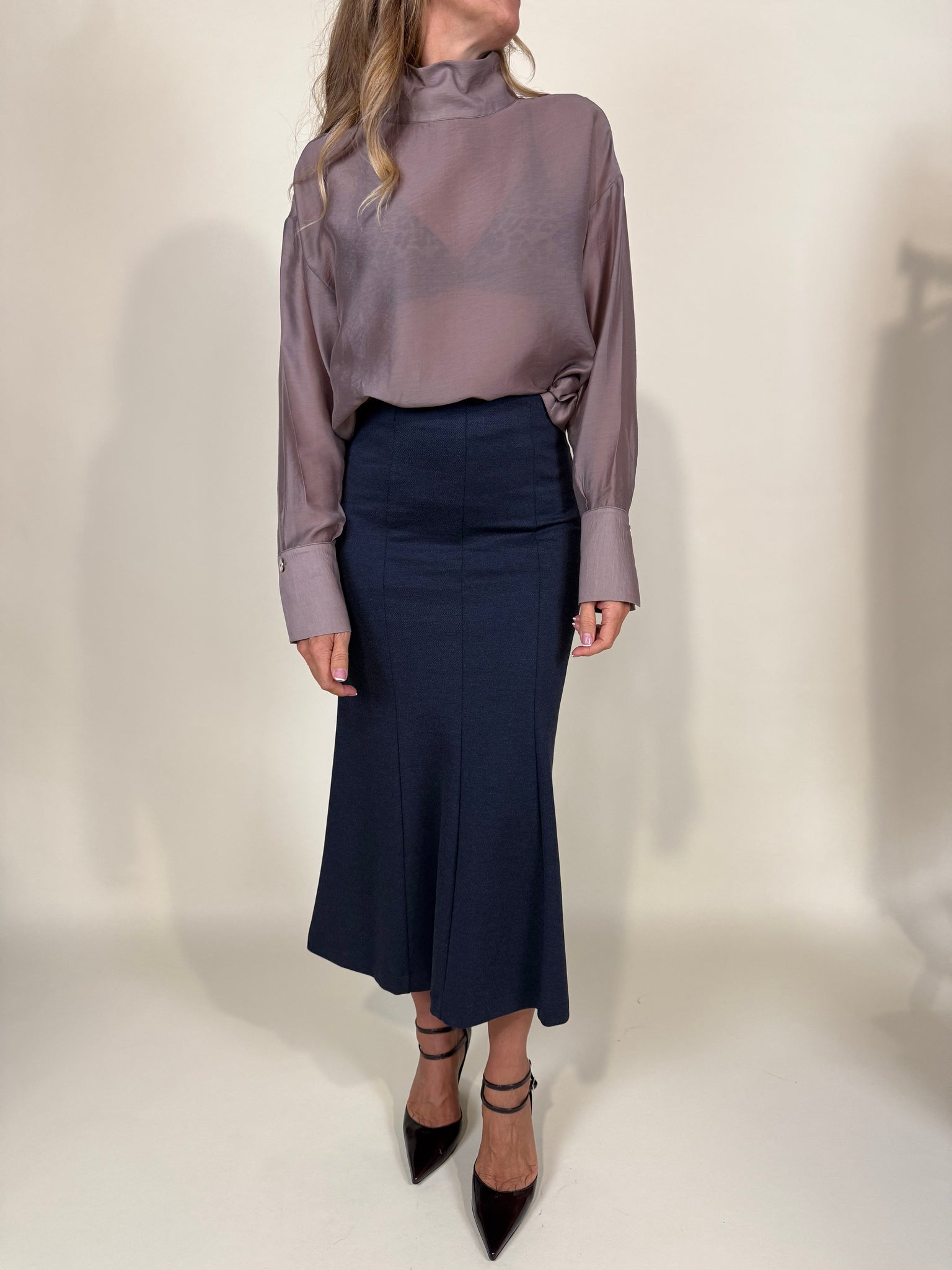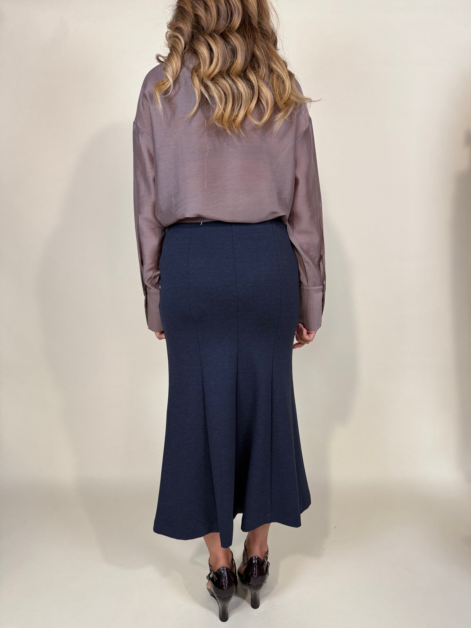 Gonna sartoriale modello longuette lunghezza sopra la caviglia nella variante unica blu notte. Modello vita ferma e svasatura sul fondo gonna. Fondo morbido irregolare. Dettaglio profilatura gonna a cucitura a vista frontale e sul retro. Chiusura con zip laterale tono su tono.