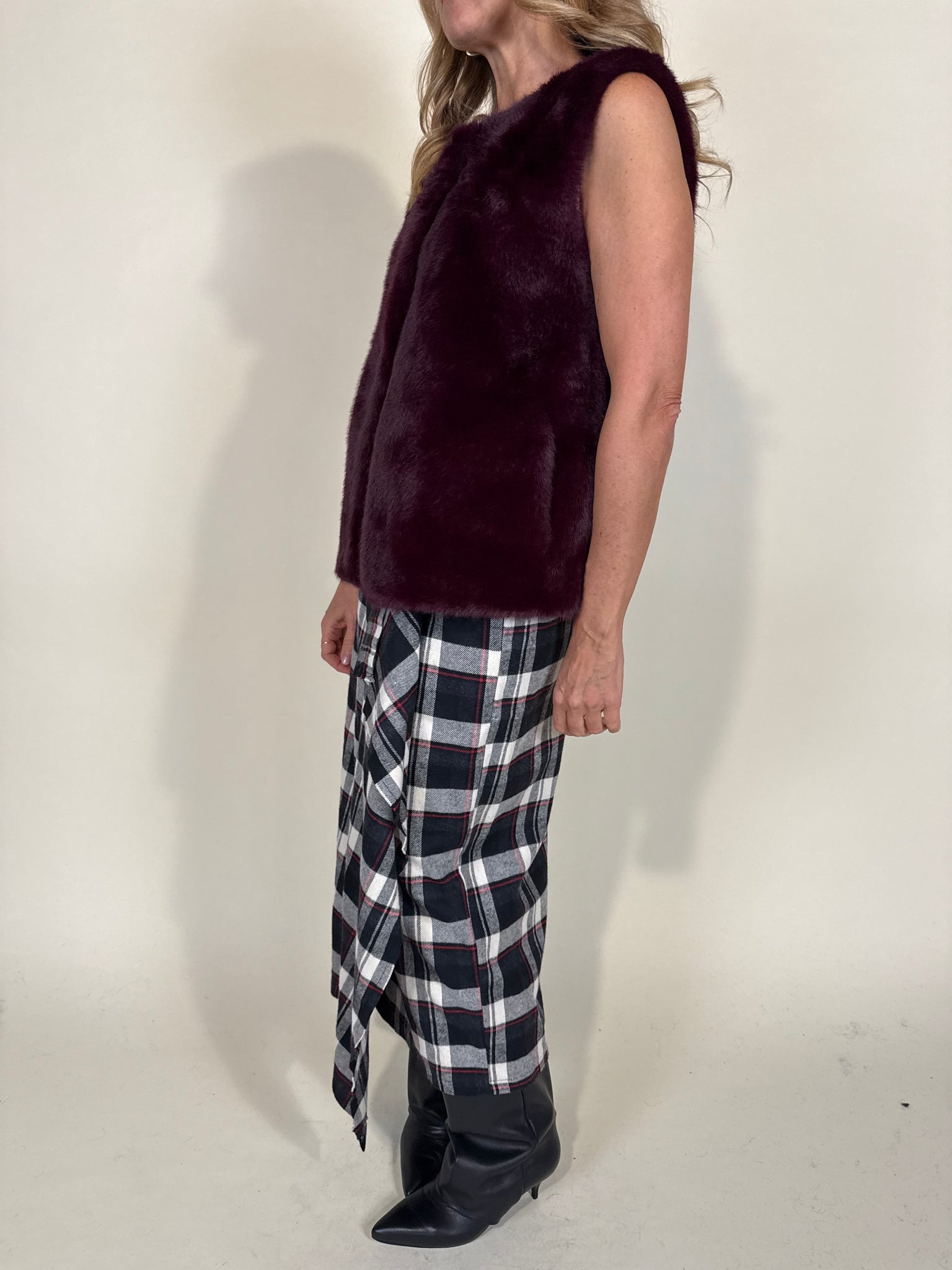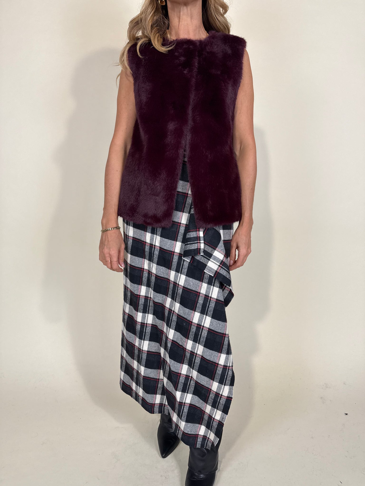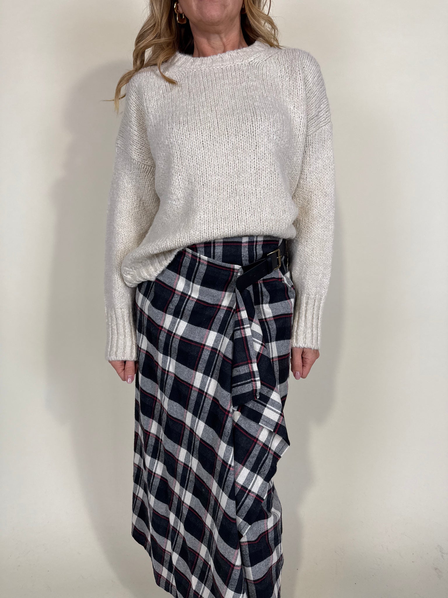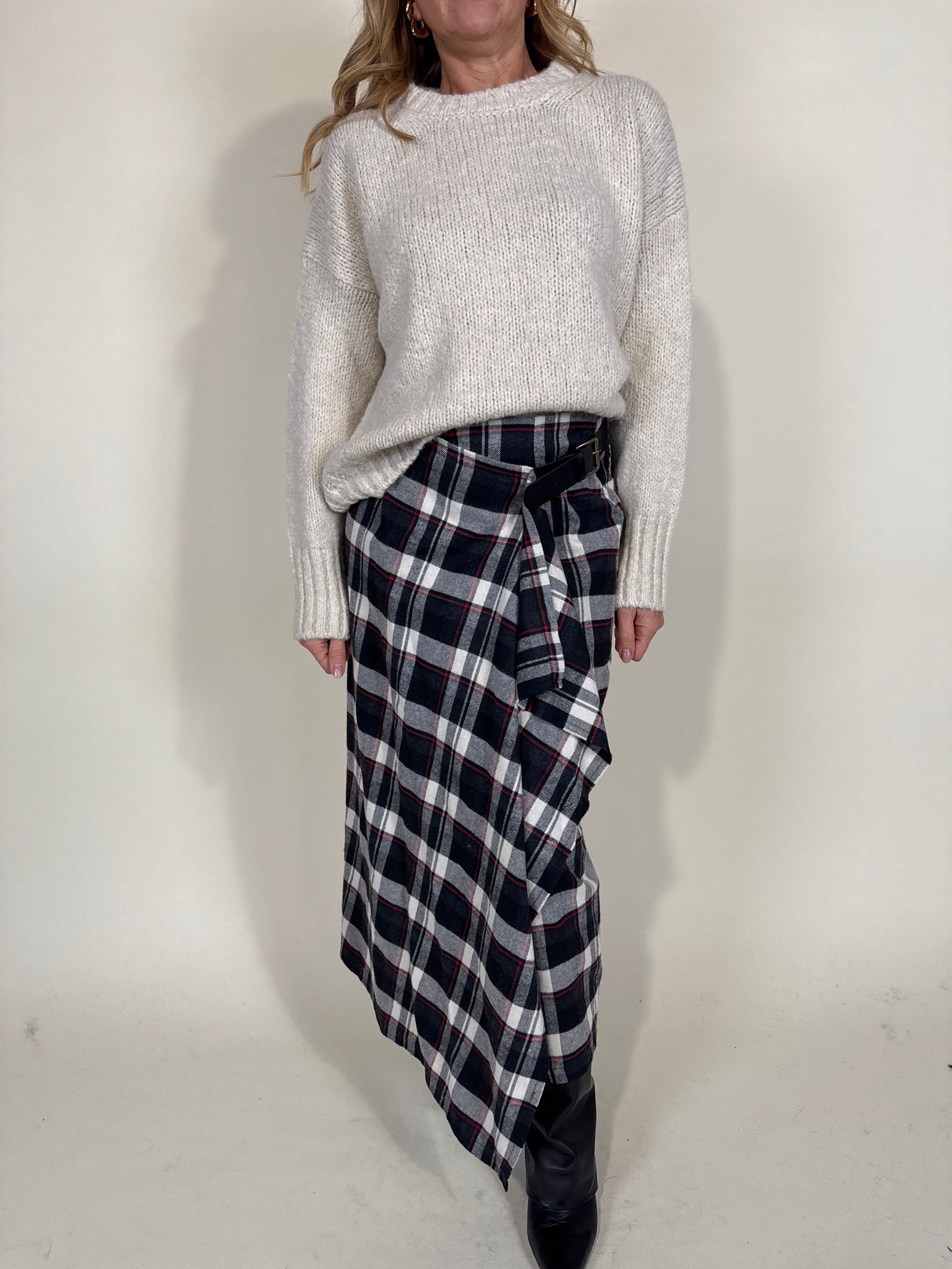 Gonna modello longuette disponibile nella stampa in trama fantasia check sui toni del nero e del rosso classico. Modello a portafoglio con chiusura con cinturina laterale in vita con fibbia dorata. Tessuto simil flanella spalmata.