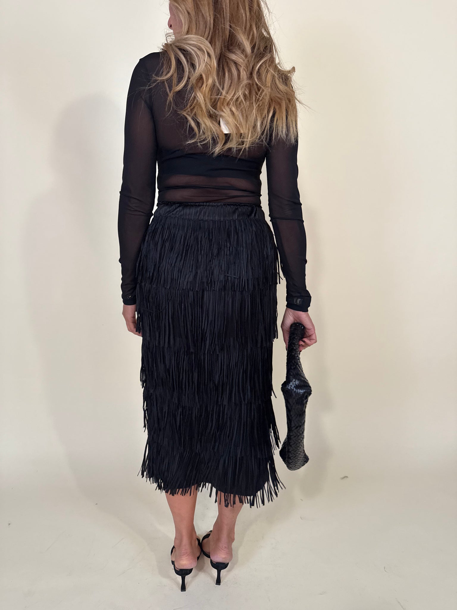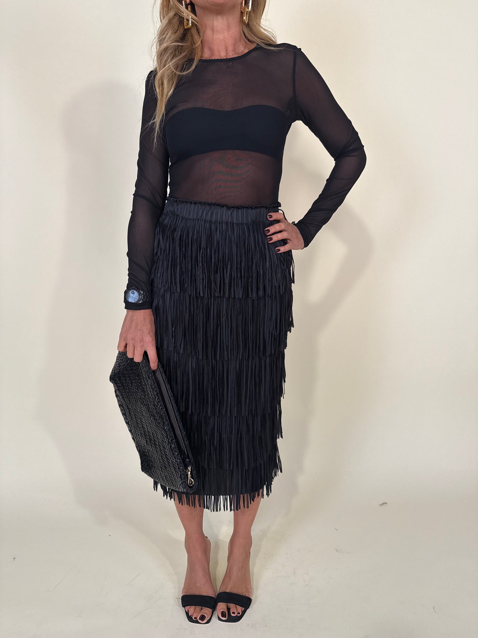 Gonna modello longuette disponibile nella variante colore unica nera. Dettaglio frange a balza sulla lunghezza gonna. Elastico in vita.
