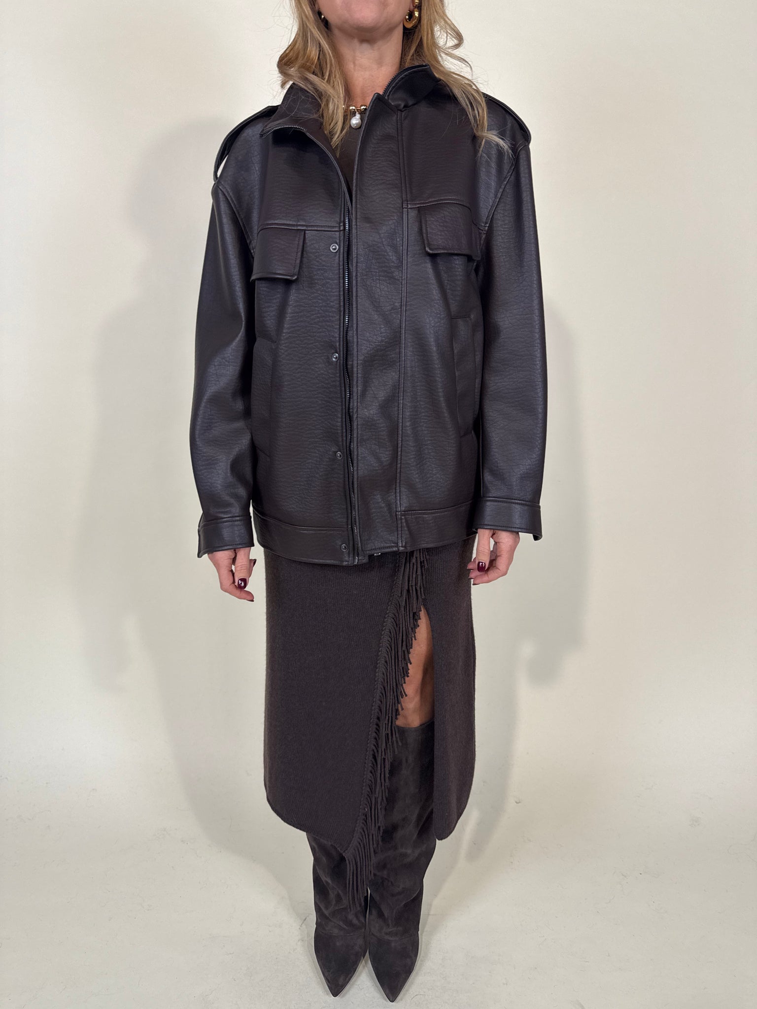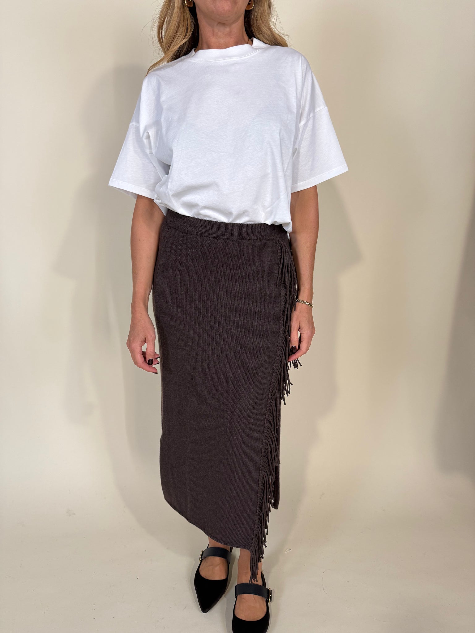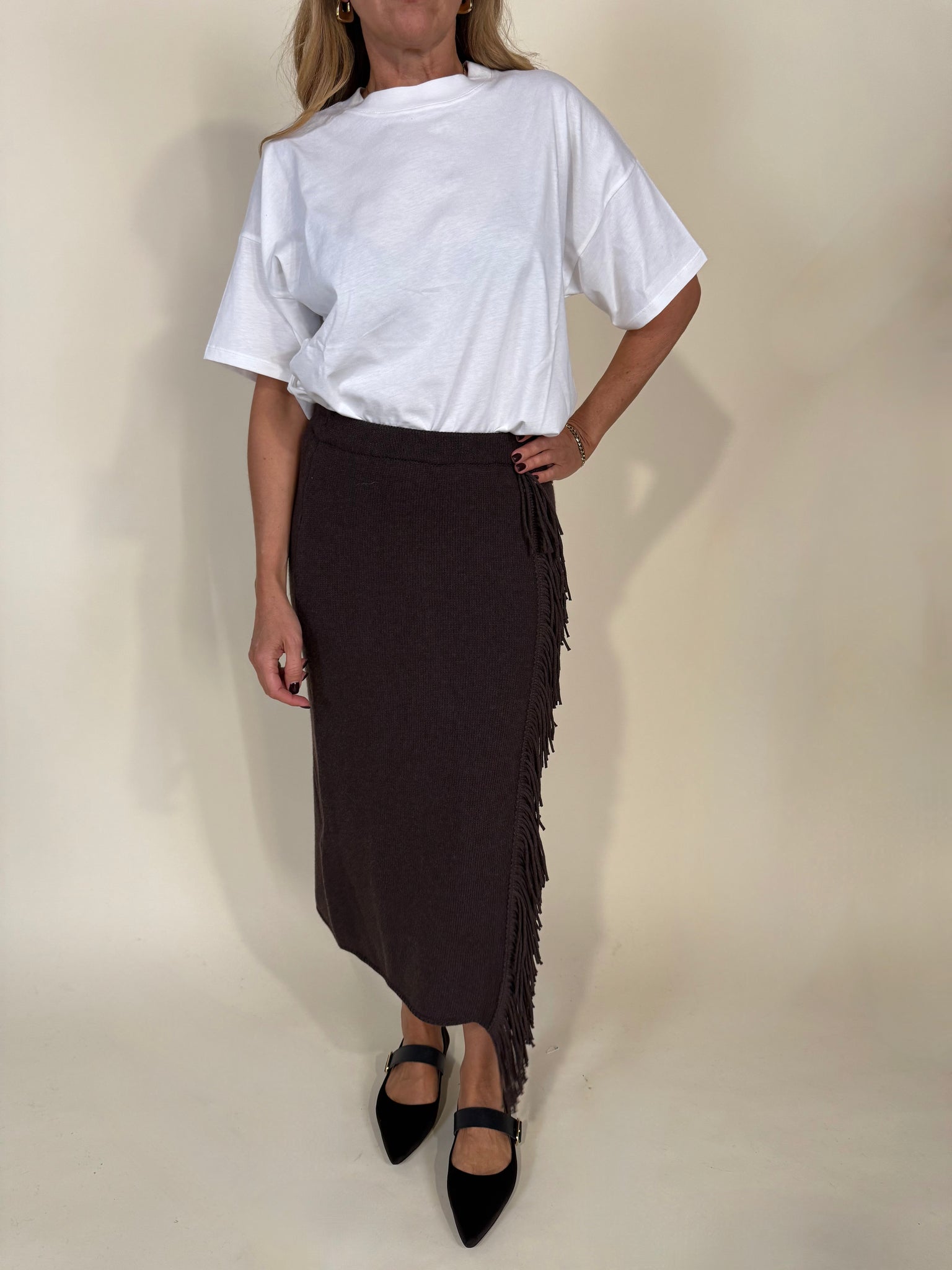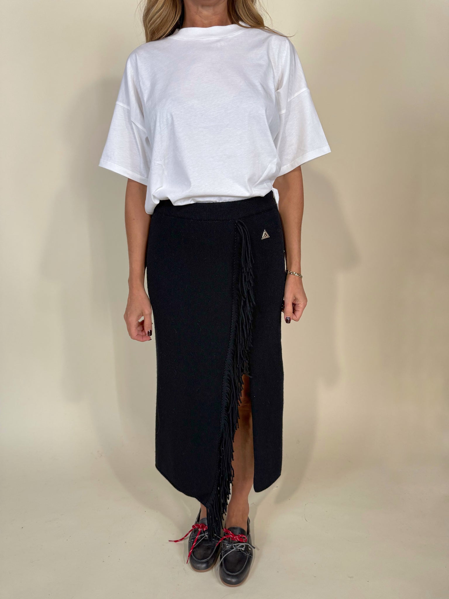 Gonna lunga in maglia rasata disponibile nelle varianti colore nero e moro. Dettaglio modello simil pareo con spacco e profilo a dettaglio con frange tono su tono. Elastico in vita. Coprente.
