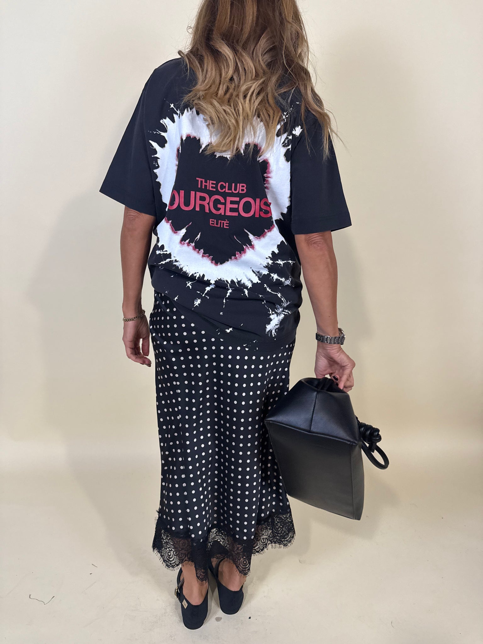Gonna midi in tessuto effetto satinato disponibile nella variante unica a fantasia a pois bianco su nero. Dettaglio fondo gonna con inserto in pizzo tono su tono. Elastico in vita.