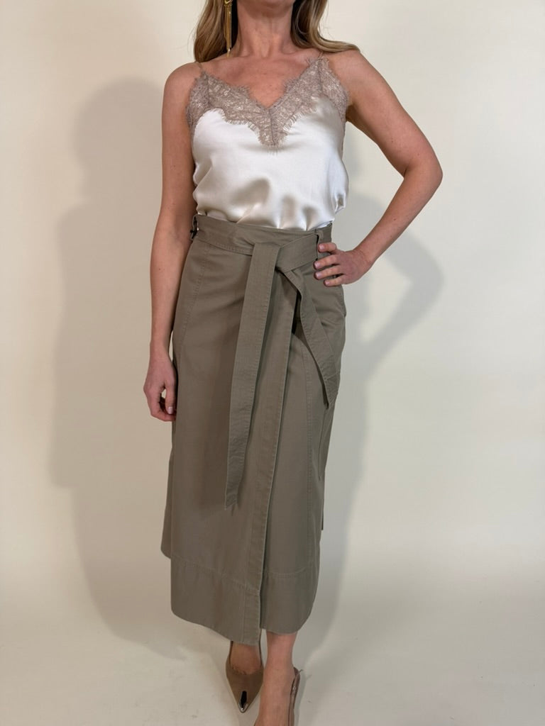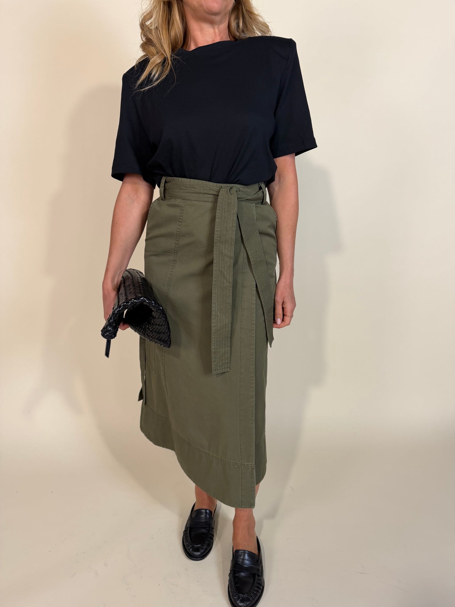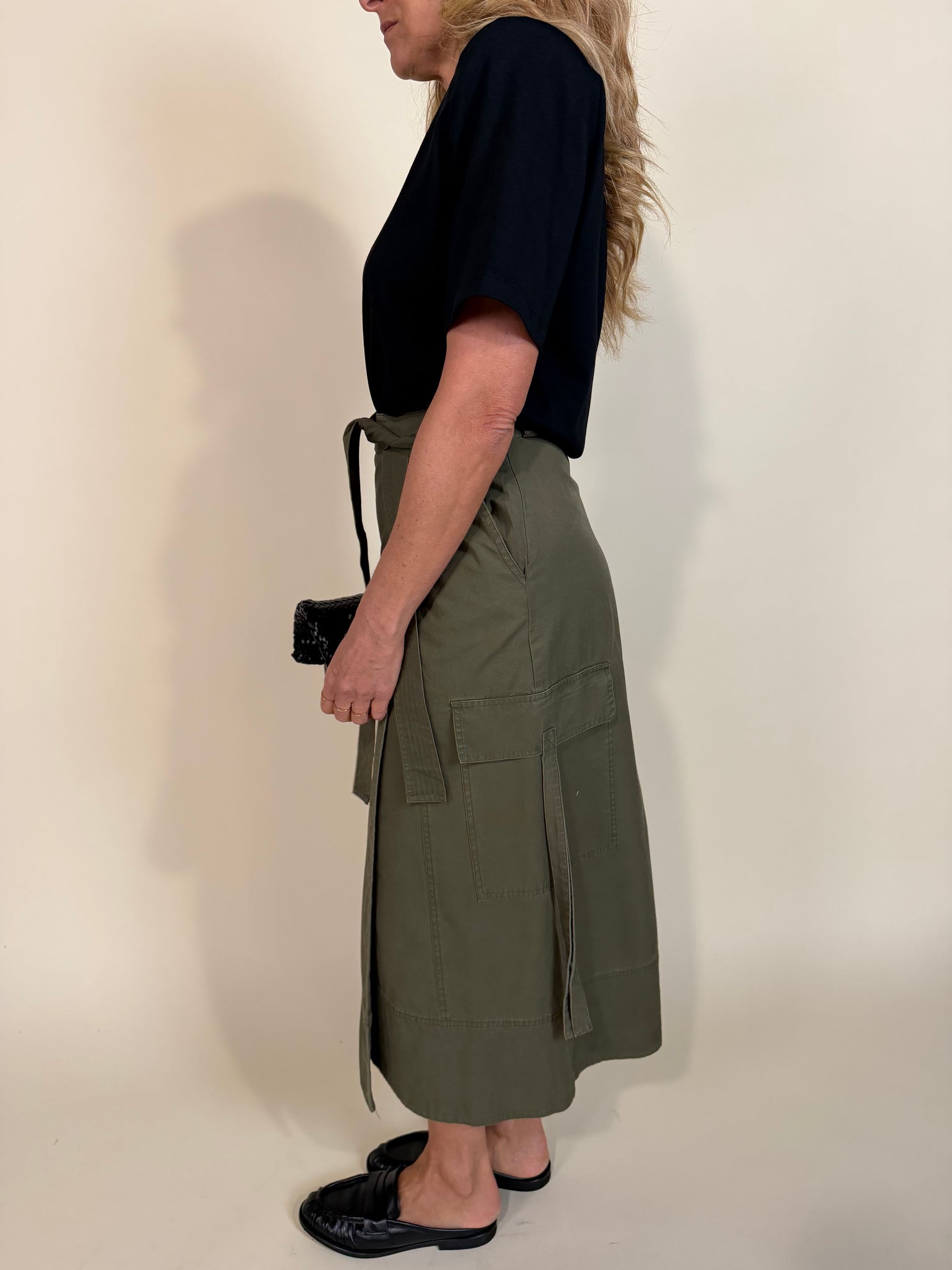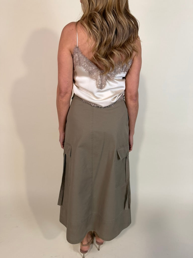 Gonna modello longuette disponibile nella variante colore verde militare o fango. Modello cargo con spacco a pareo con dettagli tasche applicate e cintura a passanti tono su tono. Tasche applicate.