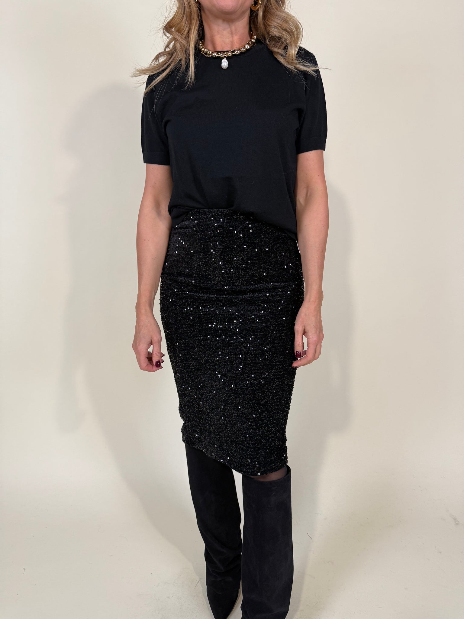 Gonna modello longuette con dettaglio piccolo spacco sul fondo interamente in paillettes disponibile nelle varianti colore tortora e nero. Modello con elastico in vita.
