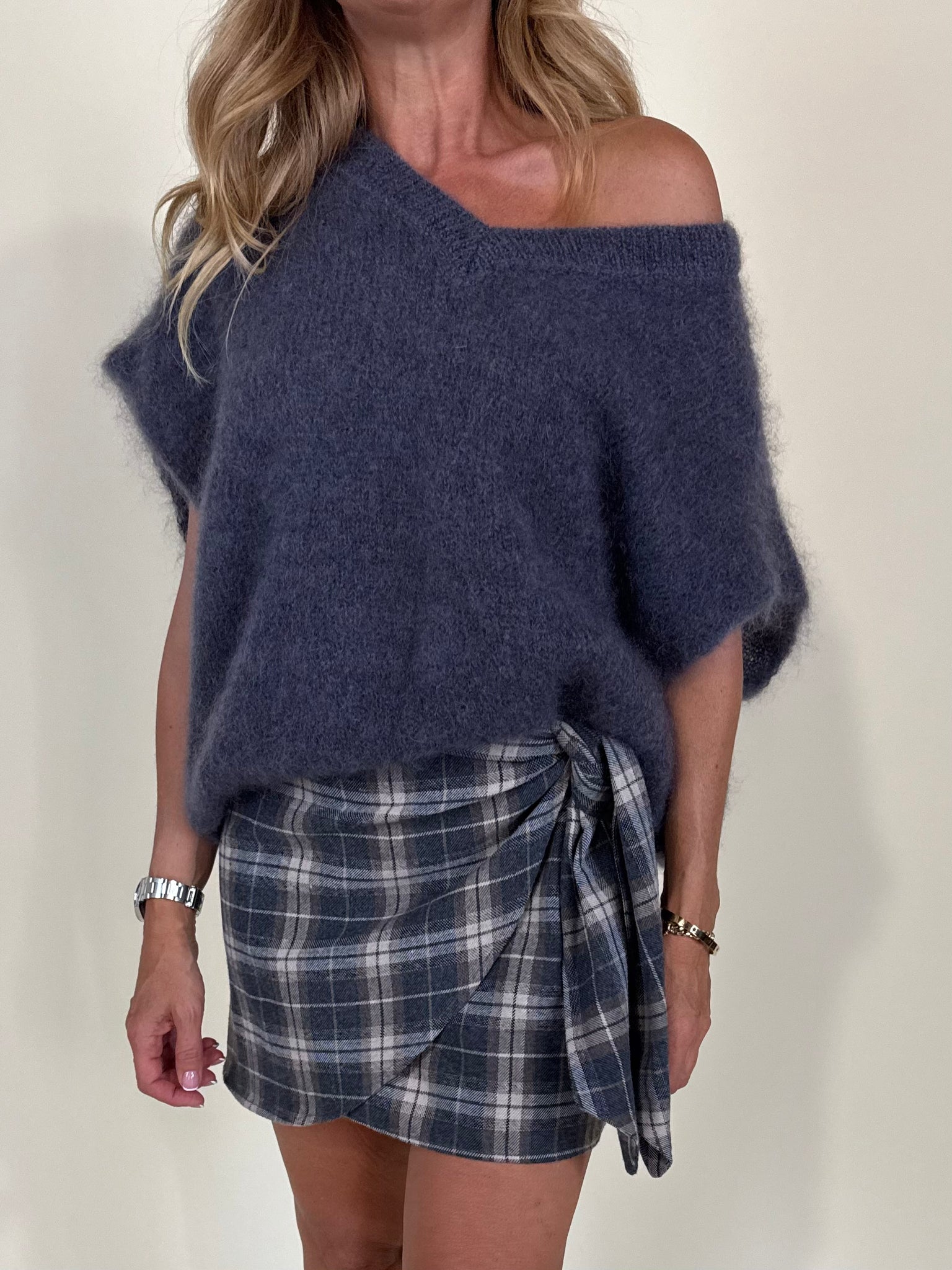 Mini gonna disponibile nella stampa in fantasia a check sui toni camel e grigio. Dettaglio chiusura frontale a portafoglio con nodo. Coprente. La parte a portafoglio si chiude sopra alla gonna, non rimane in trasparenza.