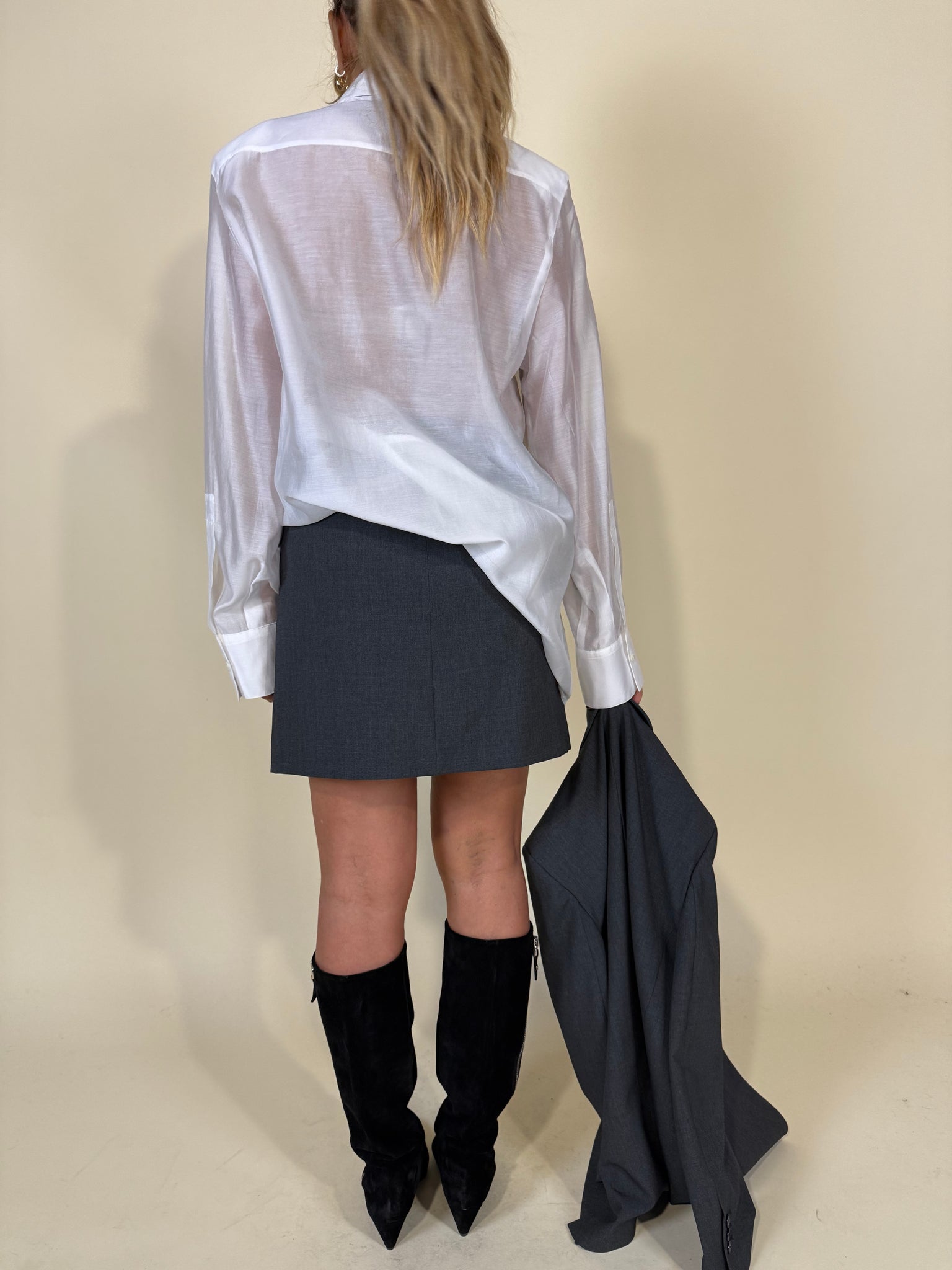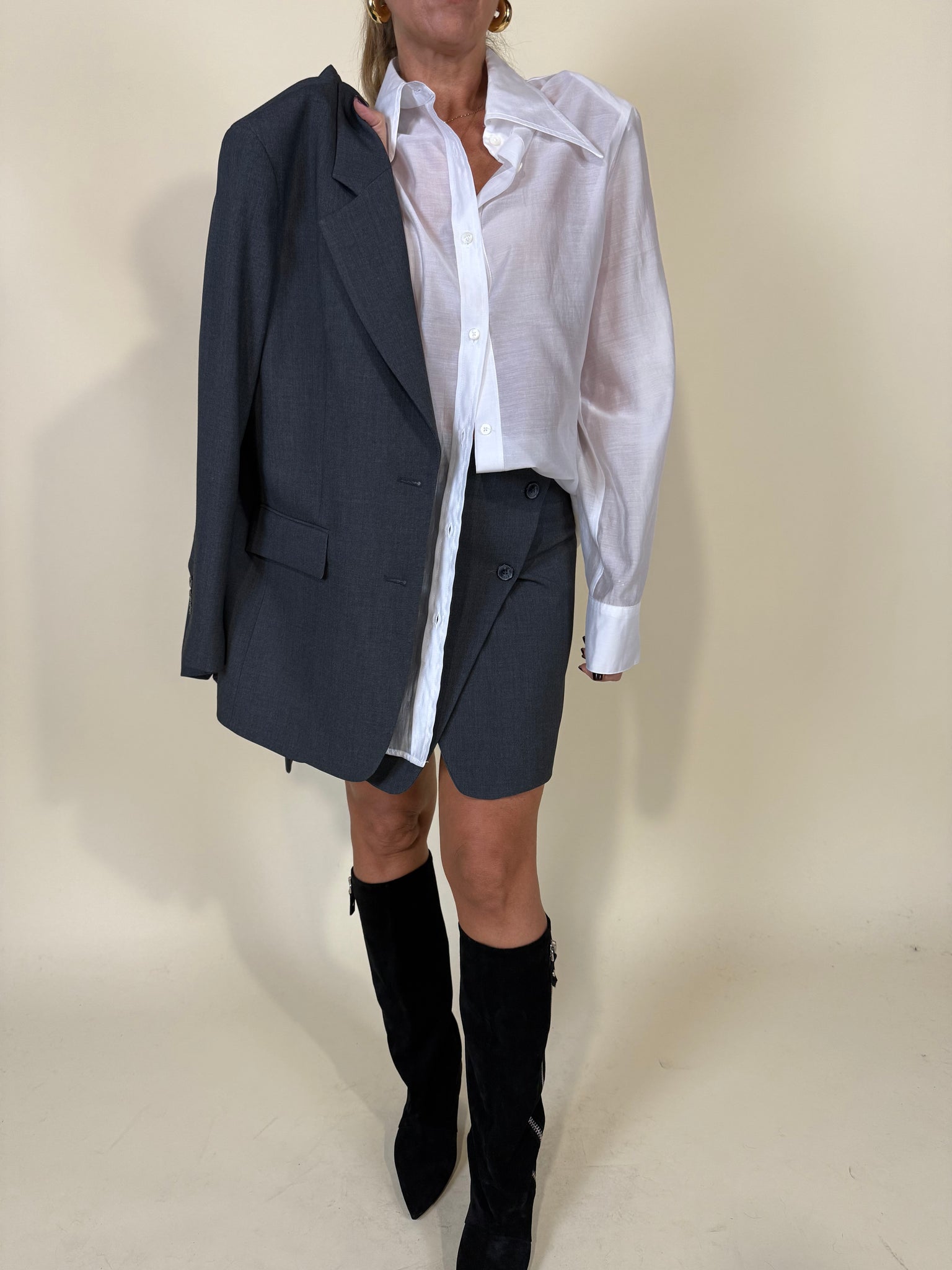 Gonna corta sartoriale a portafoglio nella variante colore grigia antracite con chiusura doppi bottoni frontali. Due tasche applicate con pattina.