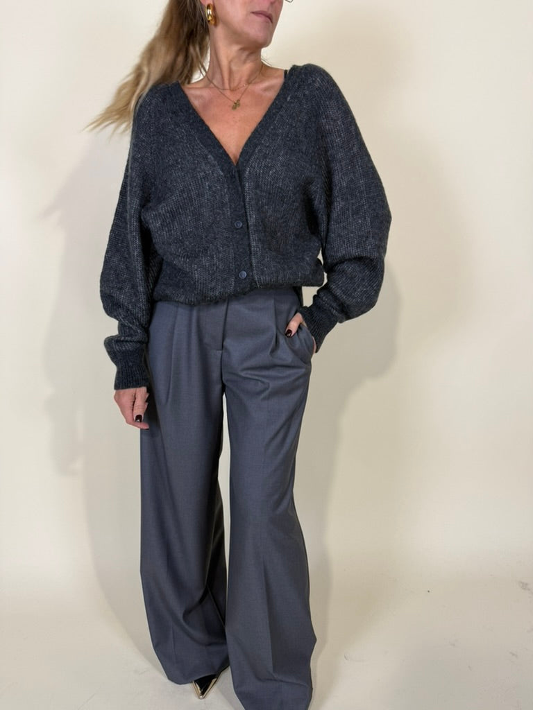 Cardigan sartoriale in filato morbido con scollo a V disponibile nelle varianti crystal grey e grigio antracite. Linea morbida con maniche lunghe e spalla scesa. Chiusura frontale e posteriore con bottoni. Fondo e polsini rifiniti a coste.