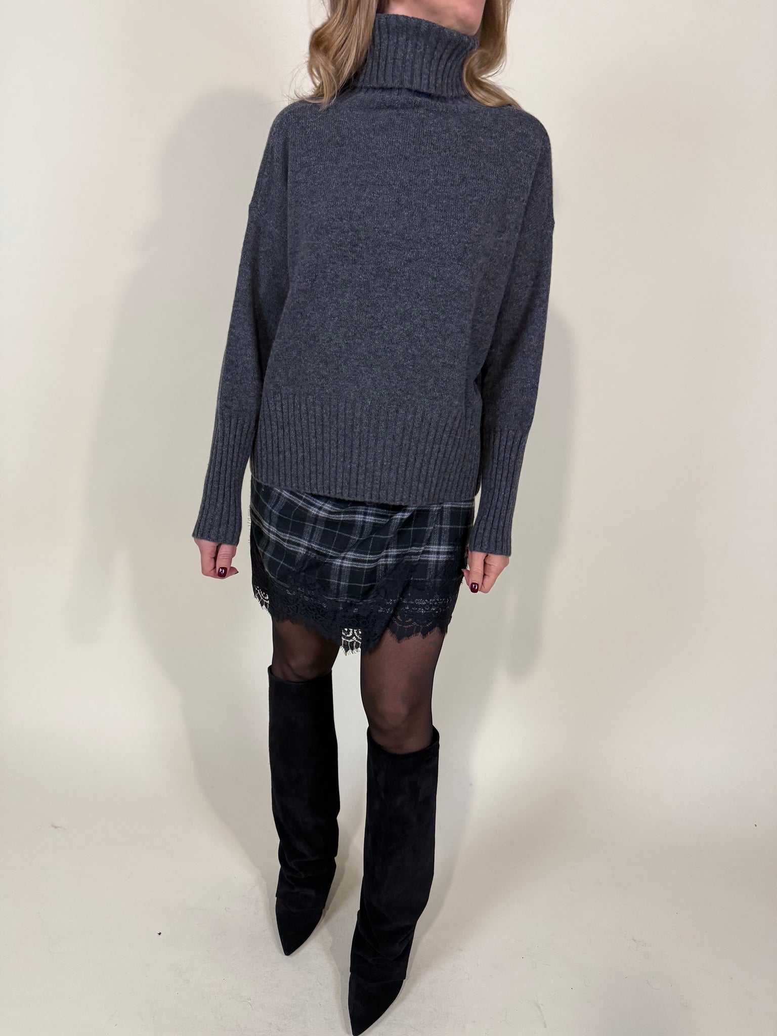 Dolcevita disponibile nel colore grigio con collo alto a costine. Dettaglio sui polsini e maniche a coste. Tessuto in 100% lana