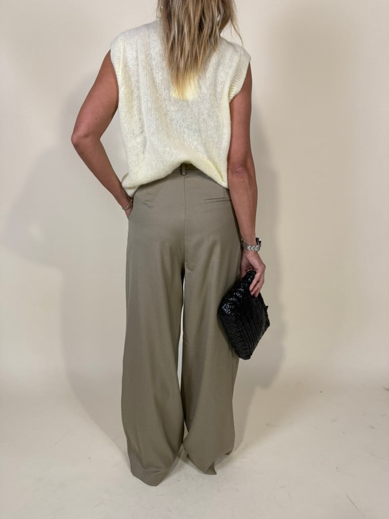 Maglia smanicata modello gilet in filato misto alpaca e lana merino extrafine disponibile nelle varianti colore giallo pastello, camel e bordeaux. Modello girocollo e dettagli trama a costina a profilo collo e manica.