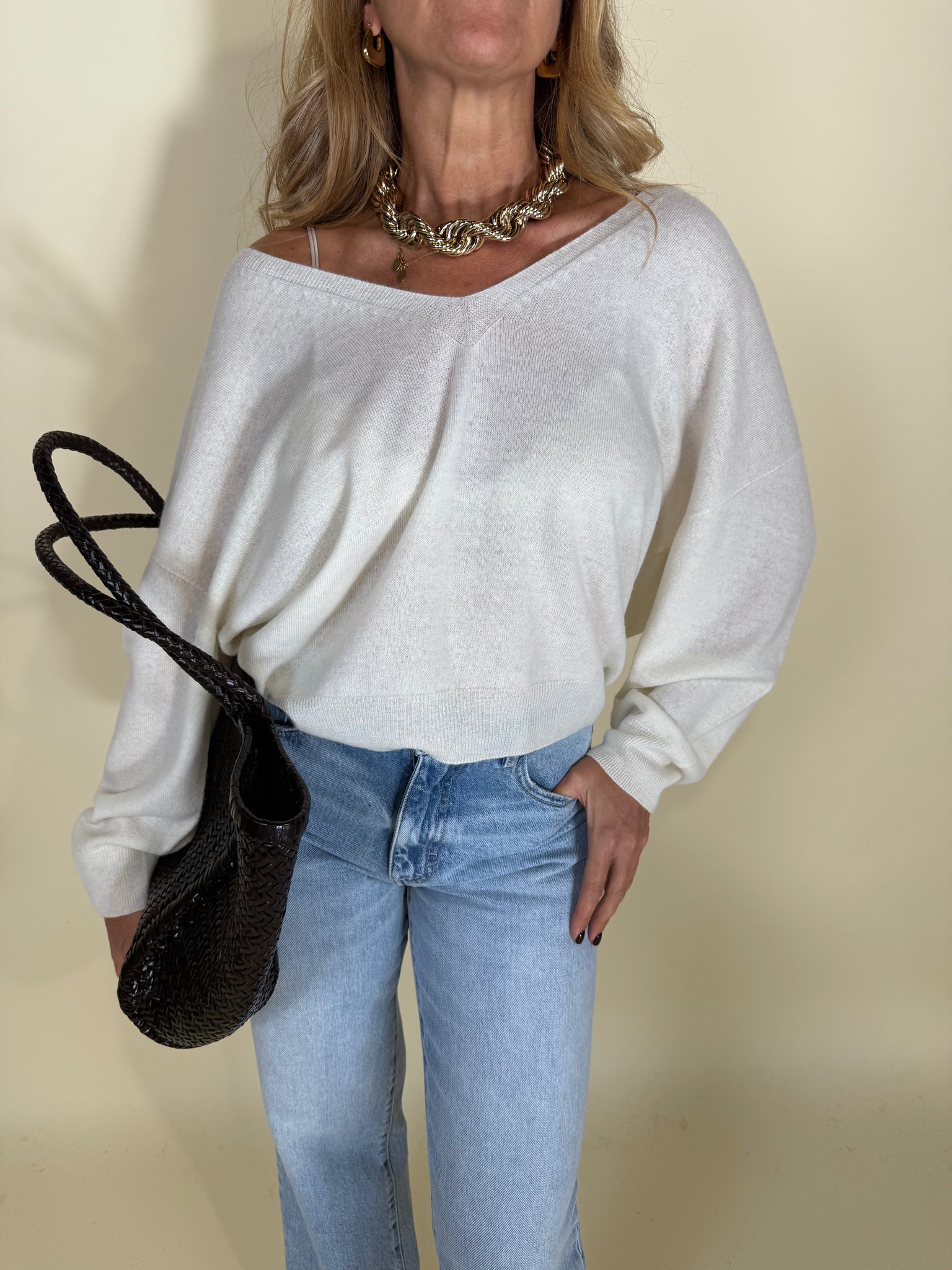 Maglia in filato sottile in misto lana e cashmere disponibile nelle varianti colore moro, verde militare, panna e verde acqua. Dettaglio scollo a V profondo. Profili a piccola costina tono su tono.