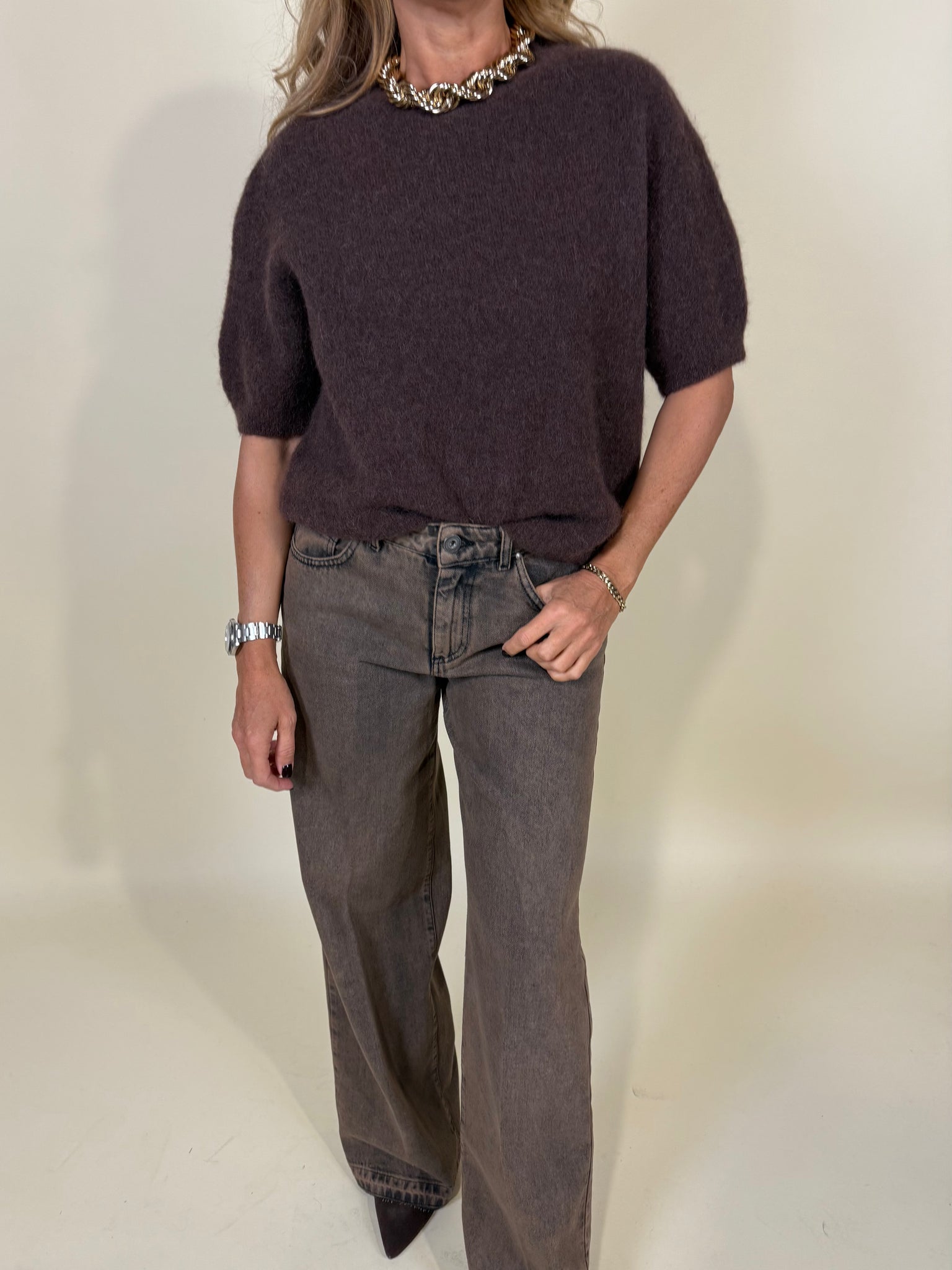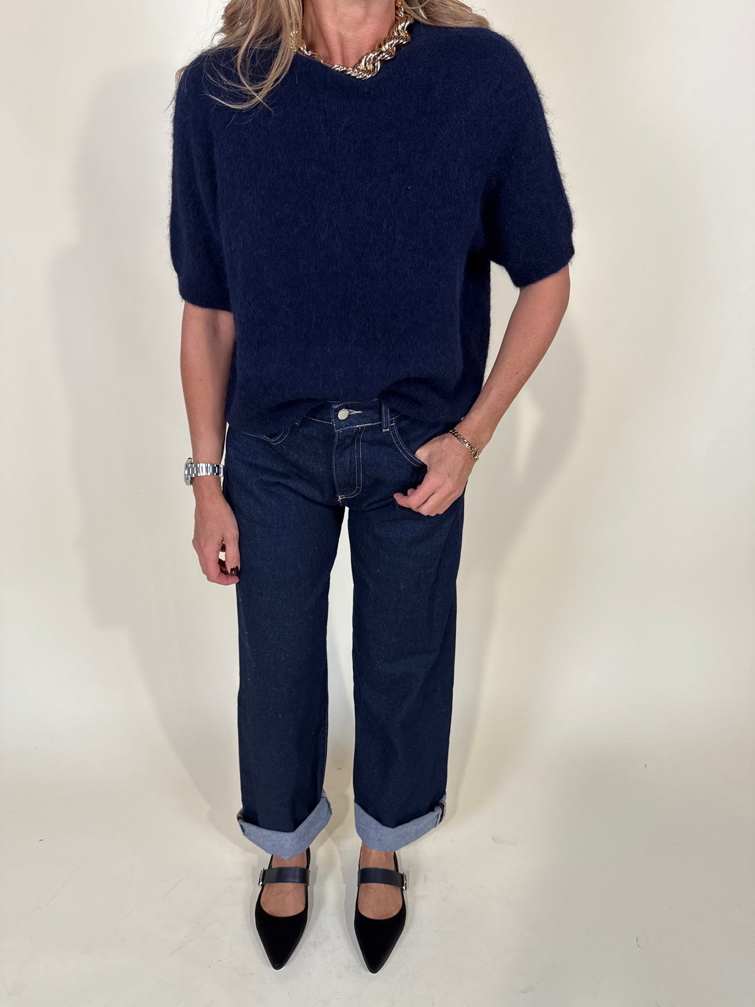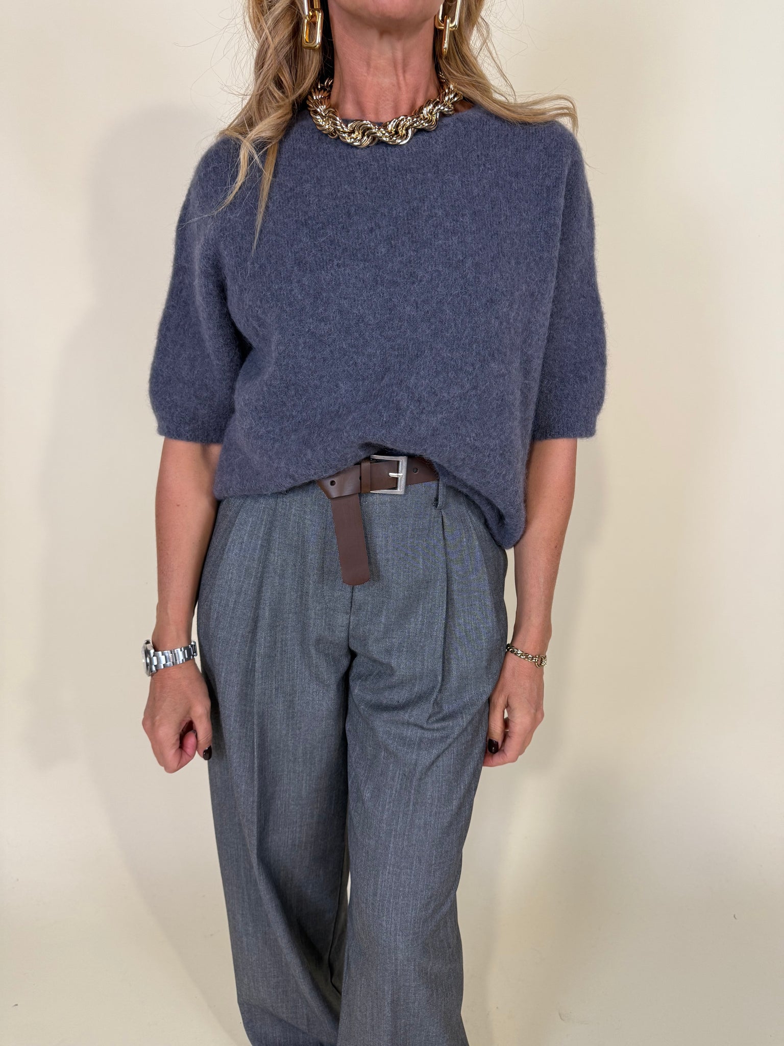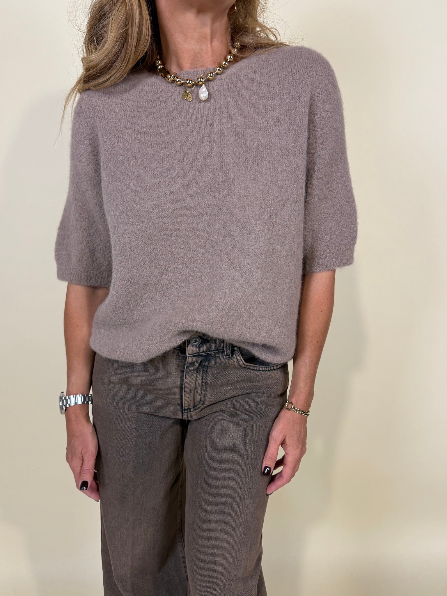 Maglia a mezza manica girocollo morbida in misto alpaca disponibile nelle varianti colore camel, moro, nero, grigio e blu notte.