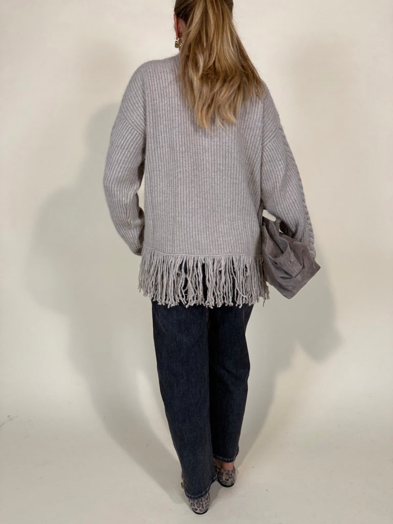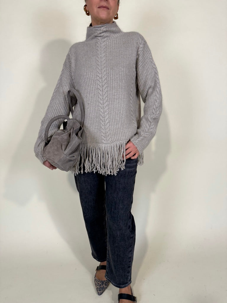 Maglione in filato medio spesso nella variante colore beige. Collo alto e fondo maglia a frangia tono su tono. Dettaglio trama a treccia sulla trama del filato. Modello morbido.