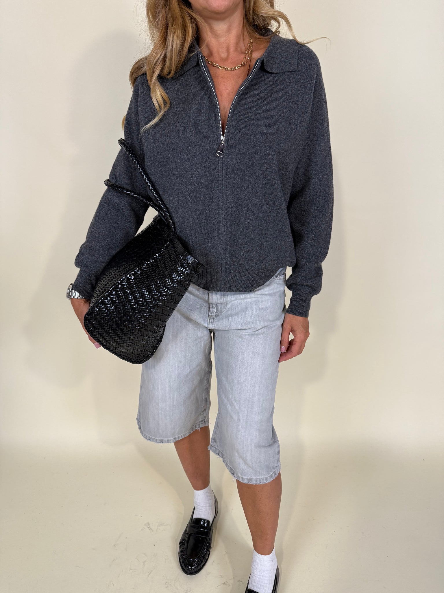 Maglia modello cardigan nella variante colore unica grigio catrame. Dettaglio colletto a camicia con chiusura a zip centrale in acciaio a contrasto. Fondo polso a elastico. Modello morbido.