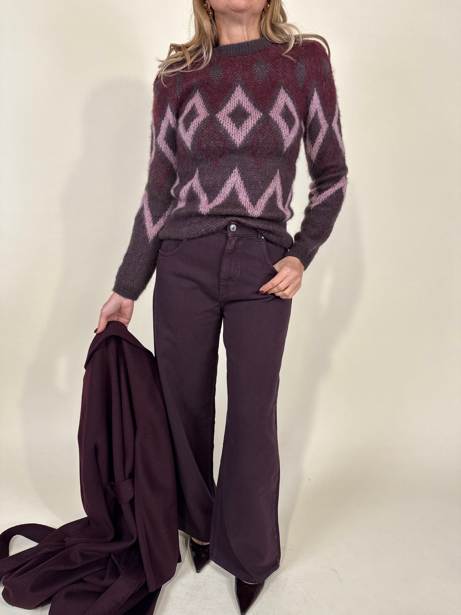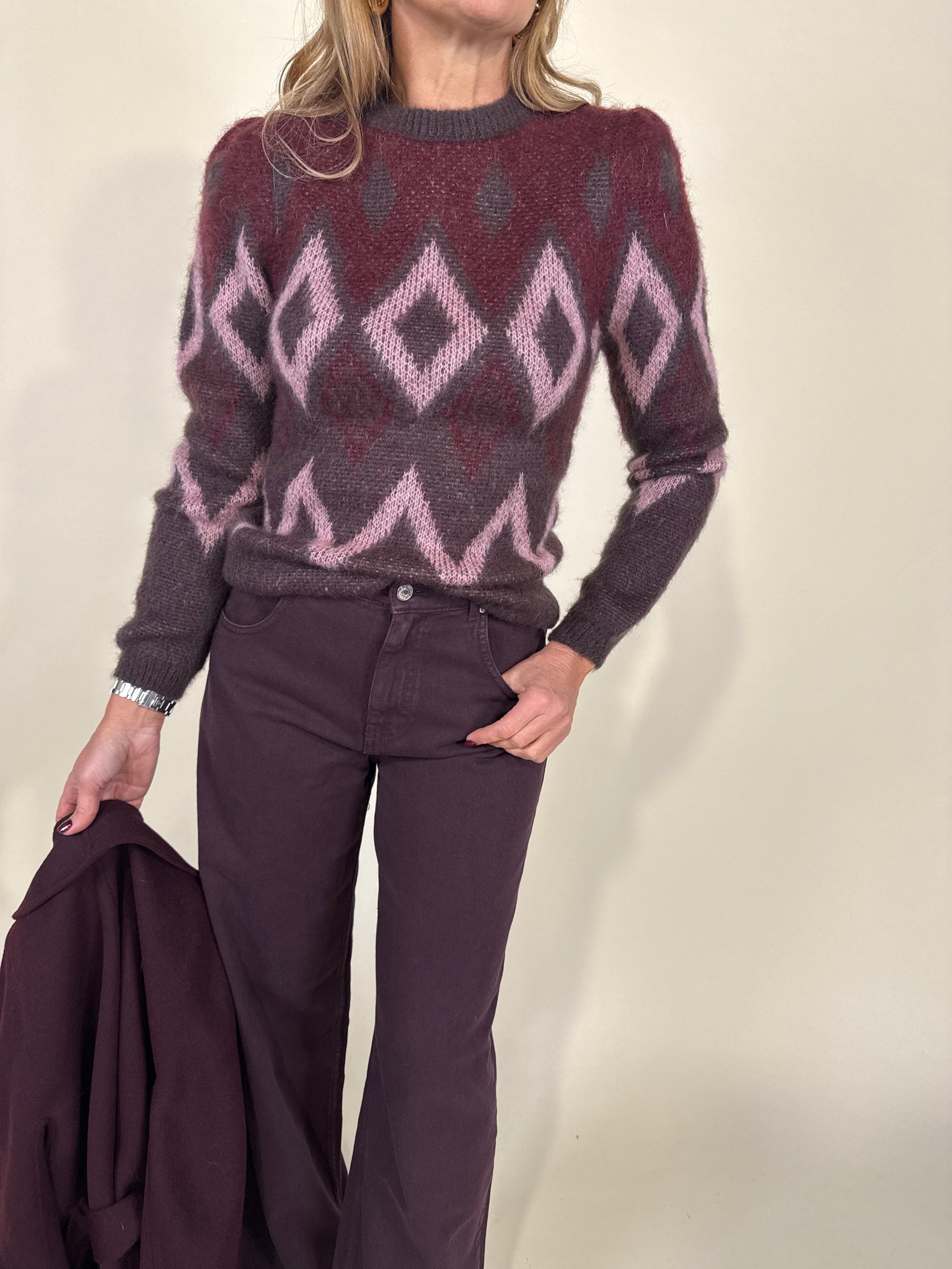 Maglia disponibile nel colore vino in fantasia a rombi nei colori del rosa e moro. Maglia con spalline imbottite a girocollo e dettaglio con costine sul collo. Tessuto in 30% mohair 42% acrilico e 28% poliammide.