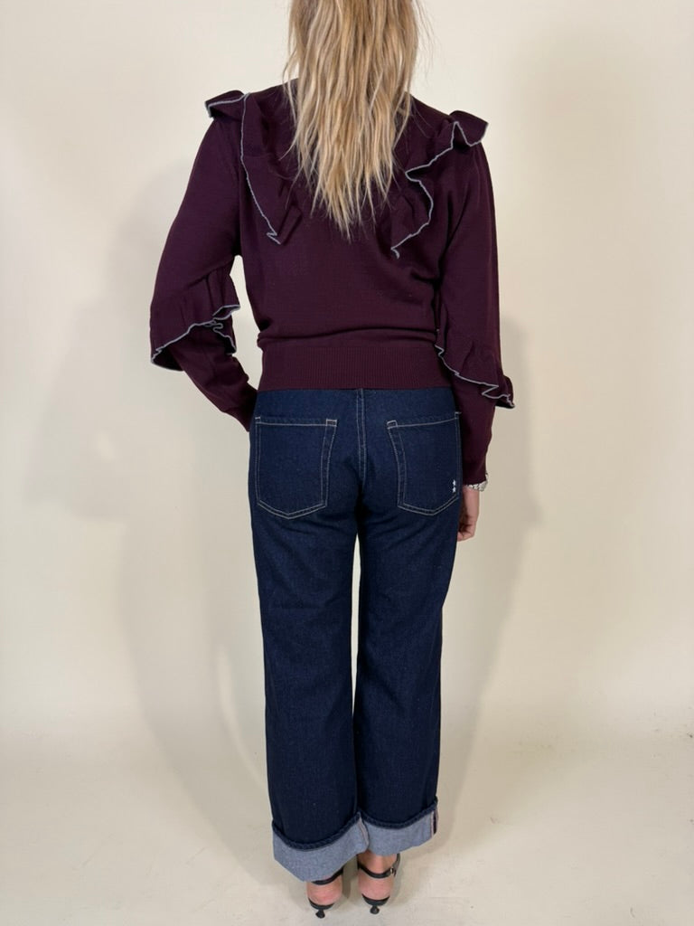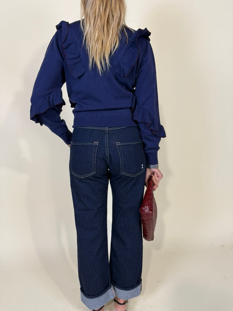 Maglia a manica lunga disponibile nelle varianti colore blu notte o vino. Dettaglio volant doppio frontale con profilo volant a contrasto. Modello girocollo. Fondo maglia e fondo polso con costine.