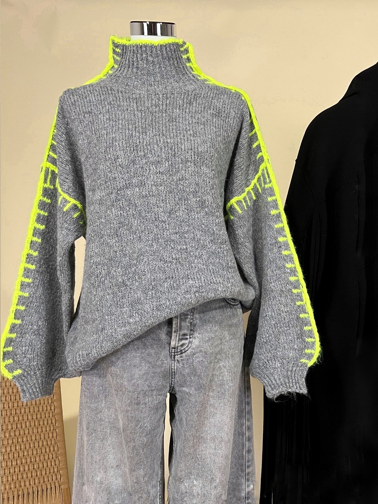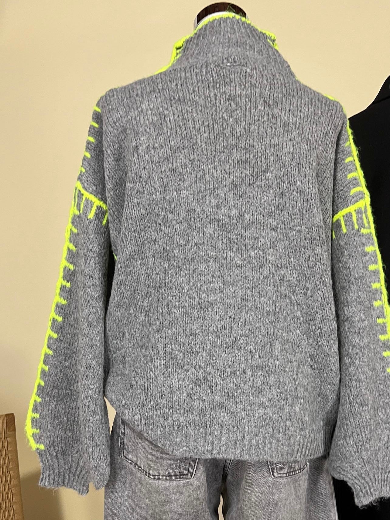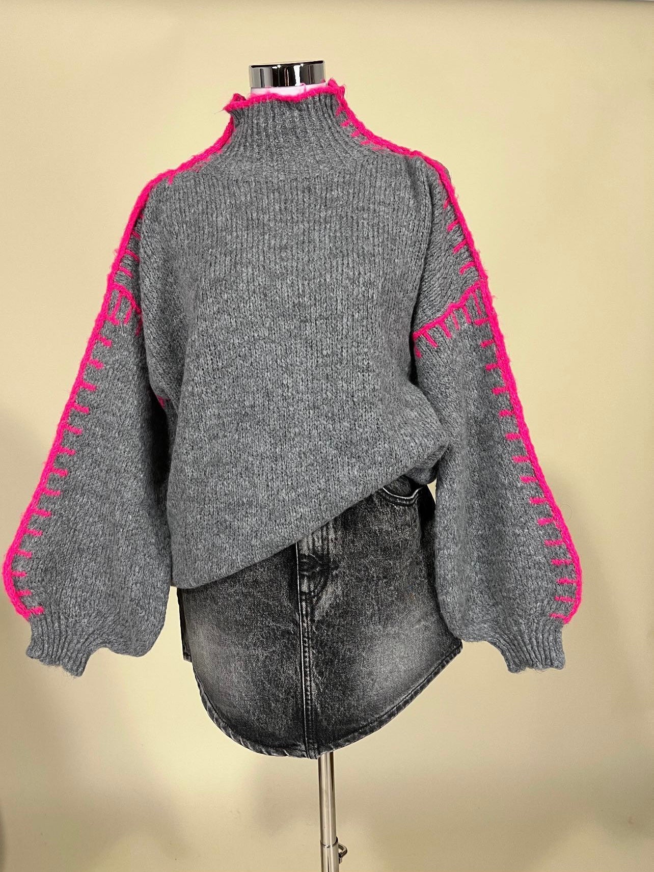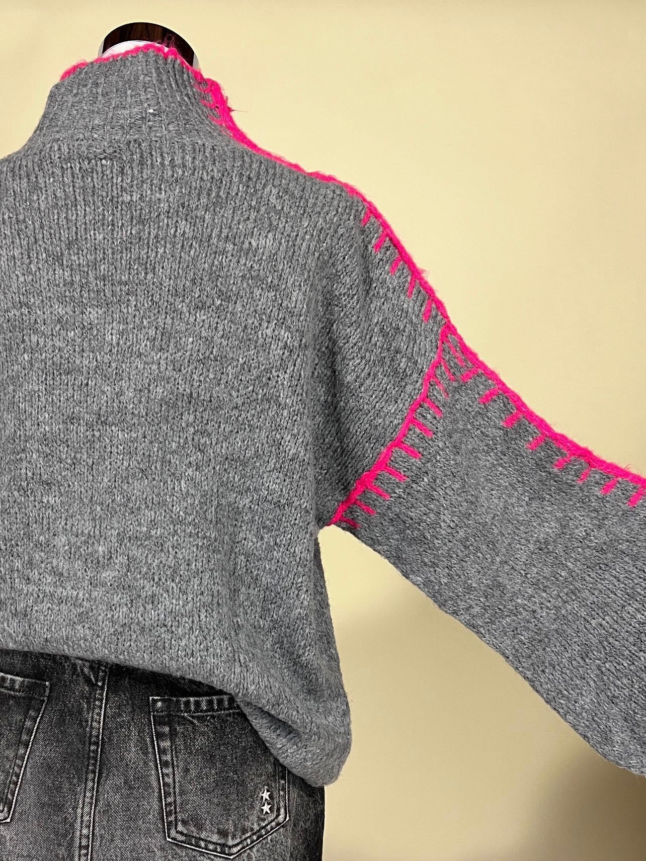 Maglione bestseller disponibile nella variante colore moro con impuntura fucsia, grigia con impuntura lime, grigia con impuntura fucsia con dettaglio impuntura a contrasto.