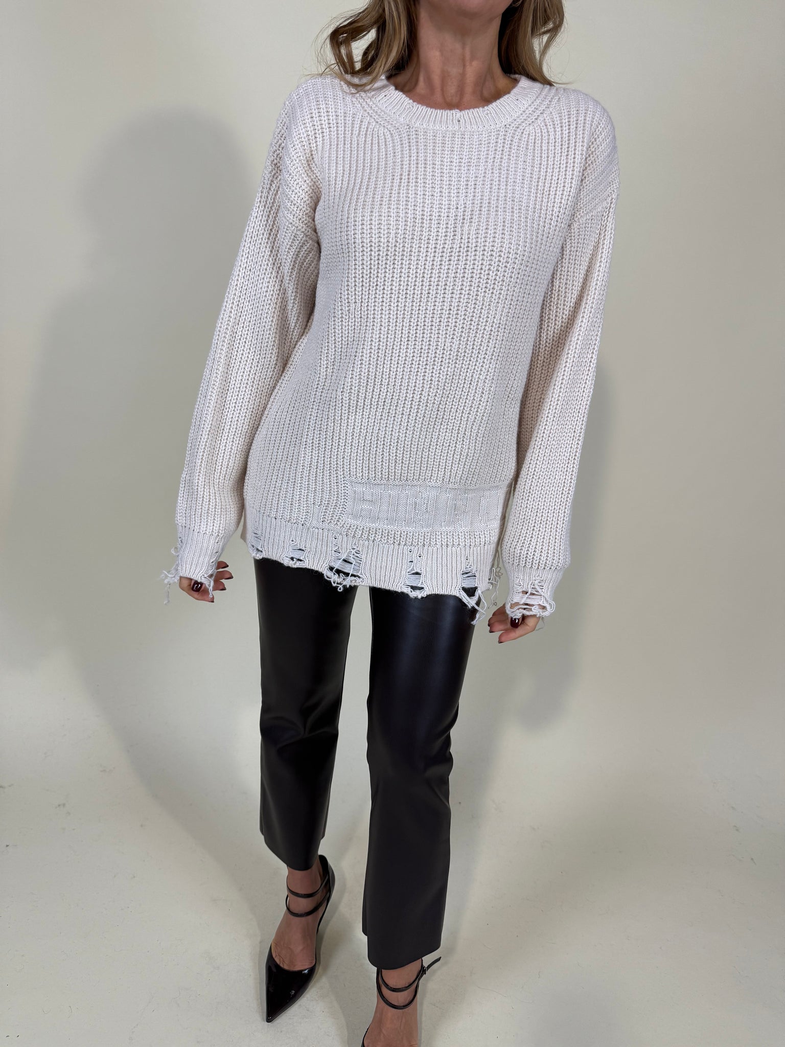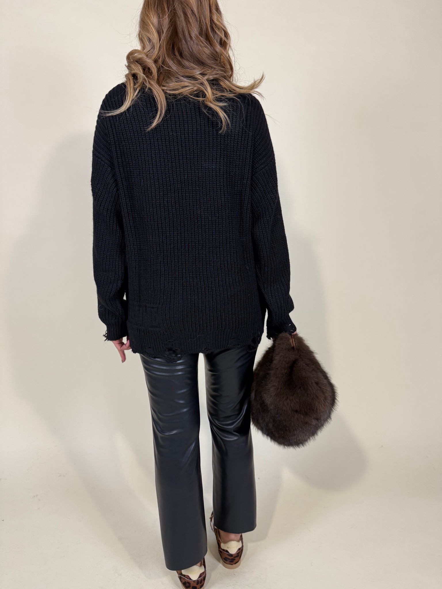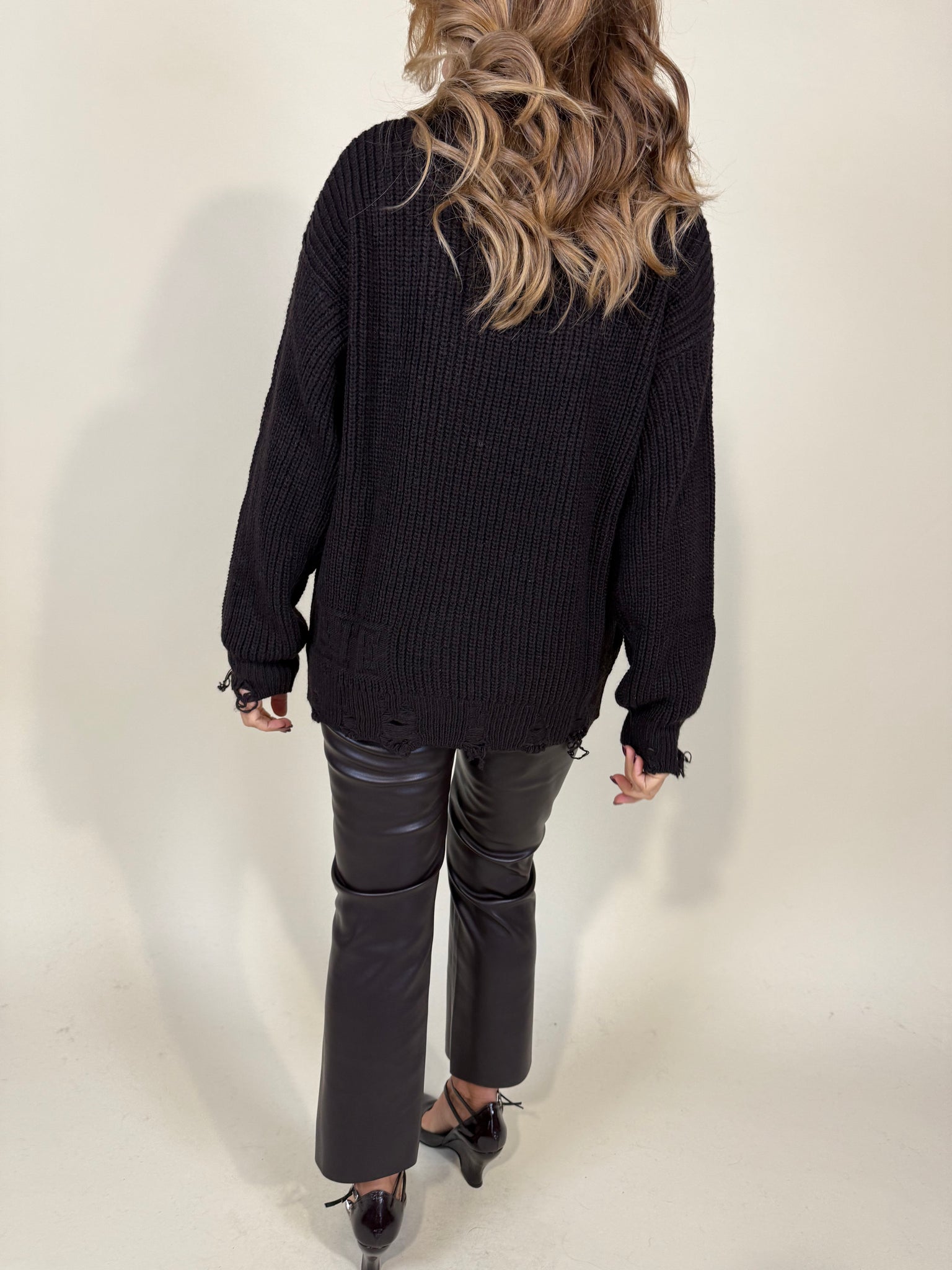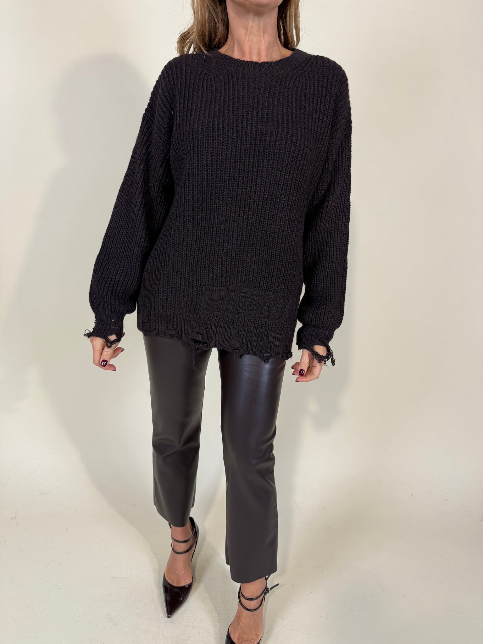 Maglione modello oversize disponibile nella variante colore nera, panna e moro in misto lana. Modello pariceollo in trama filato semi spesso. Dettaglio rotture sul fondo maglia e sul fondo polso. Modello lungo.