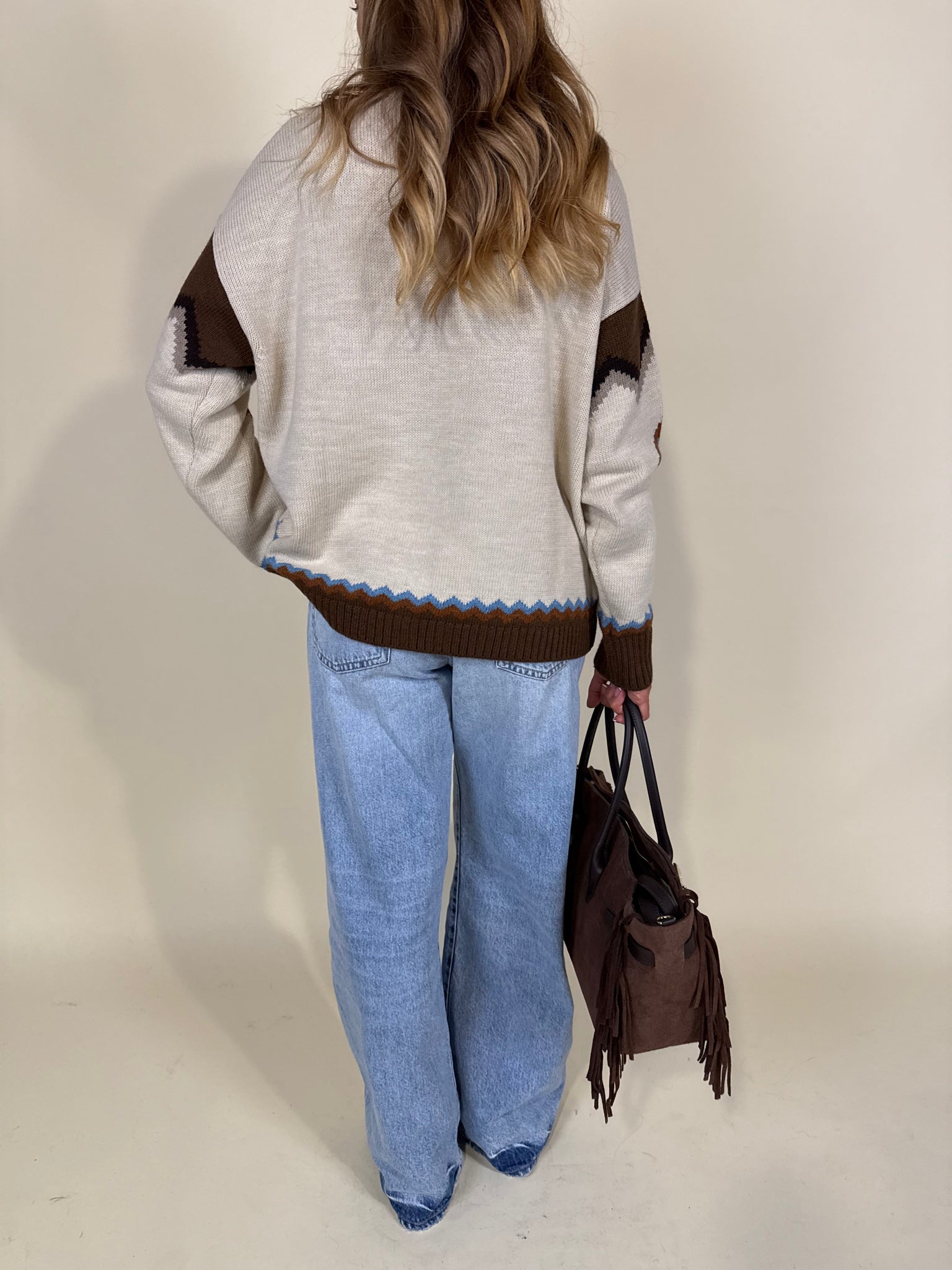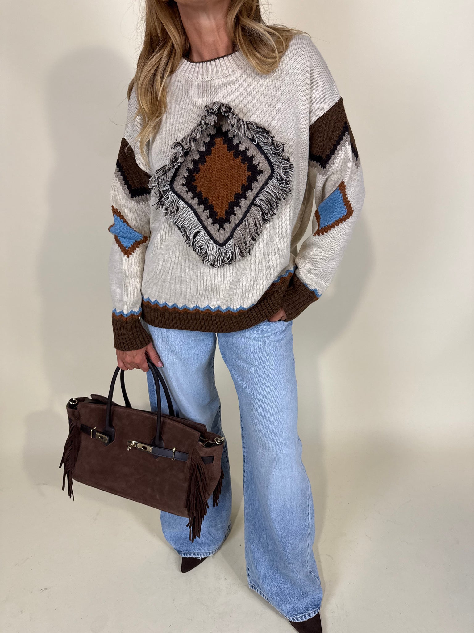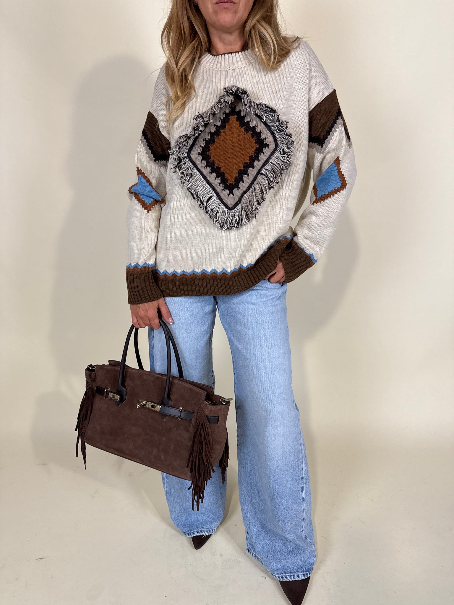 Maglione nella variante colore panna con dettagli moro a profilo e inserti. Maxi dettaglio a ricamo rombo centrale con sfrangiatura tono su tono a profilo. Manica lunga con dettagli etnici e a rombo sui colori del bruciato e del turchese.