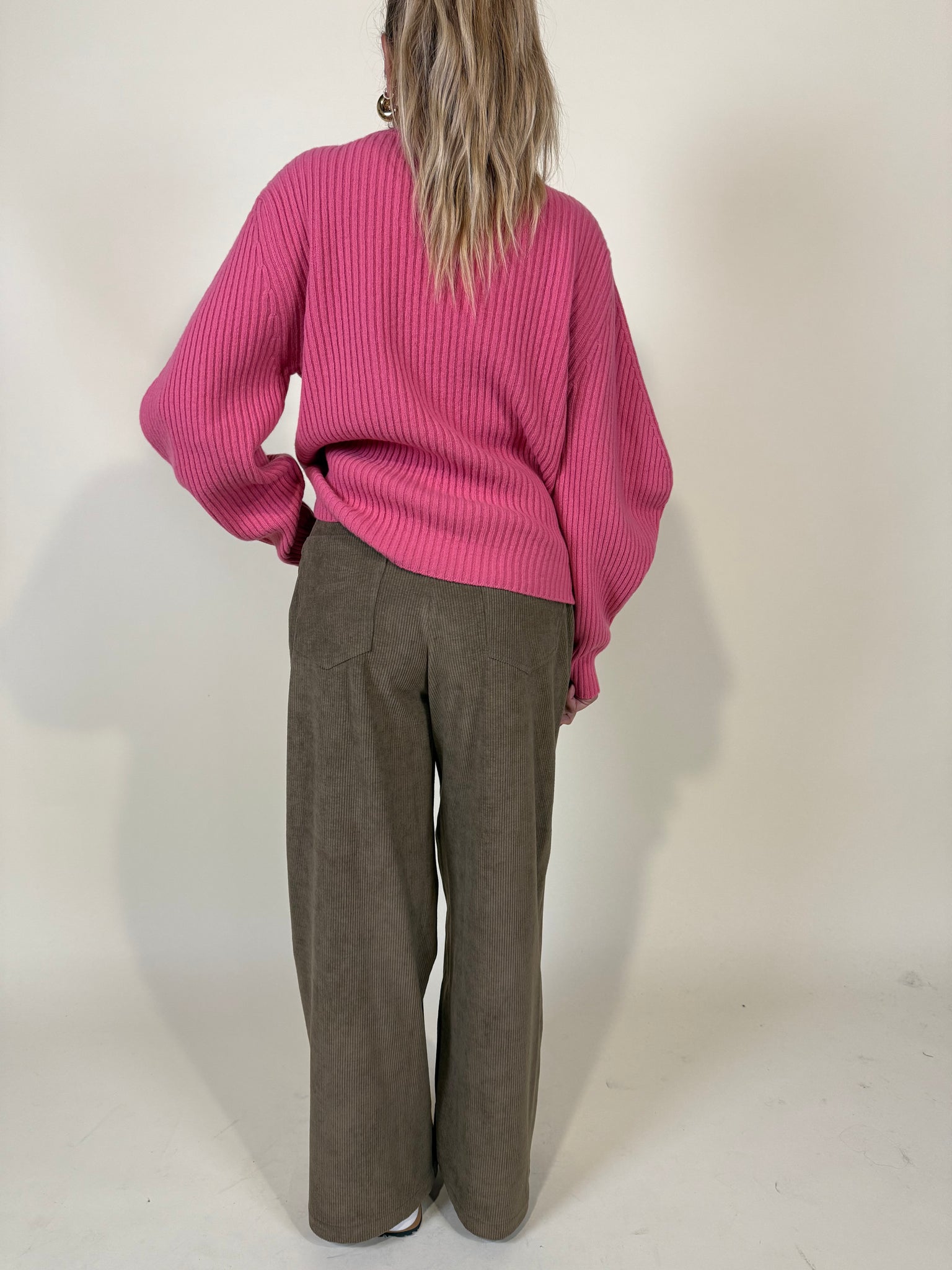 Maglione in mista lana vergine disponibile nella variante colore unica rosa. Modello girocollo a maxi coste. Manica a banana oversize. Fondo maglia morbido.