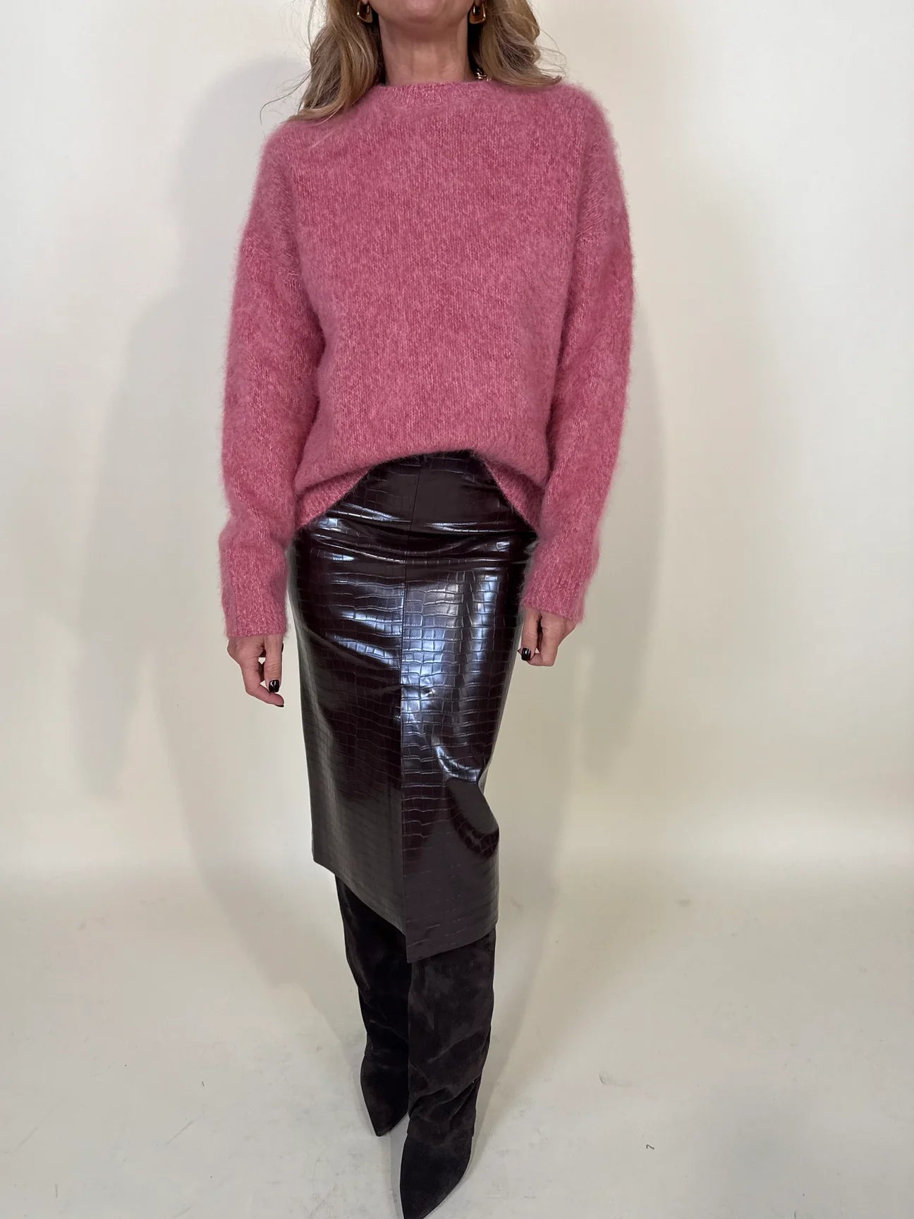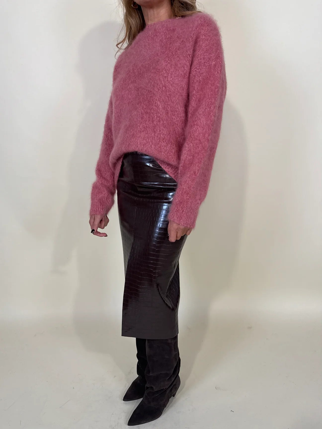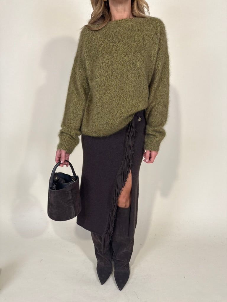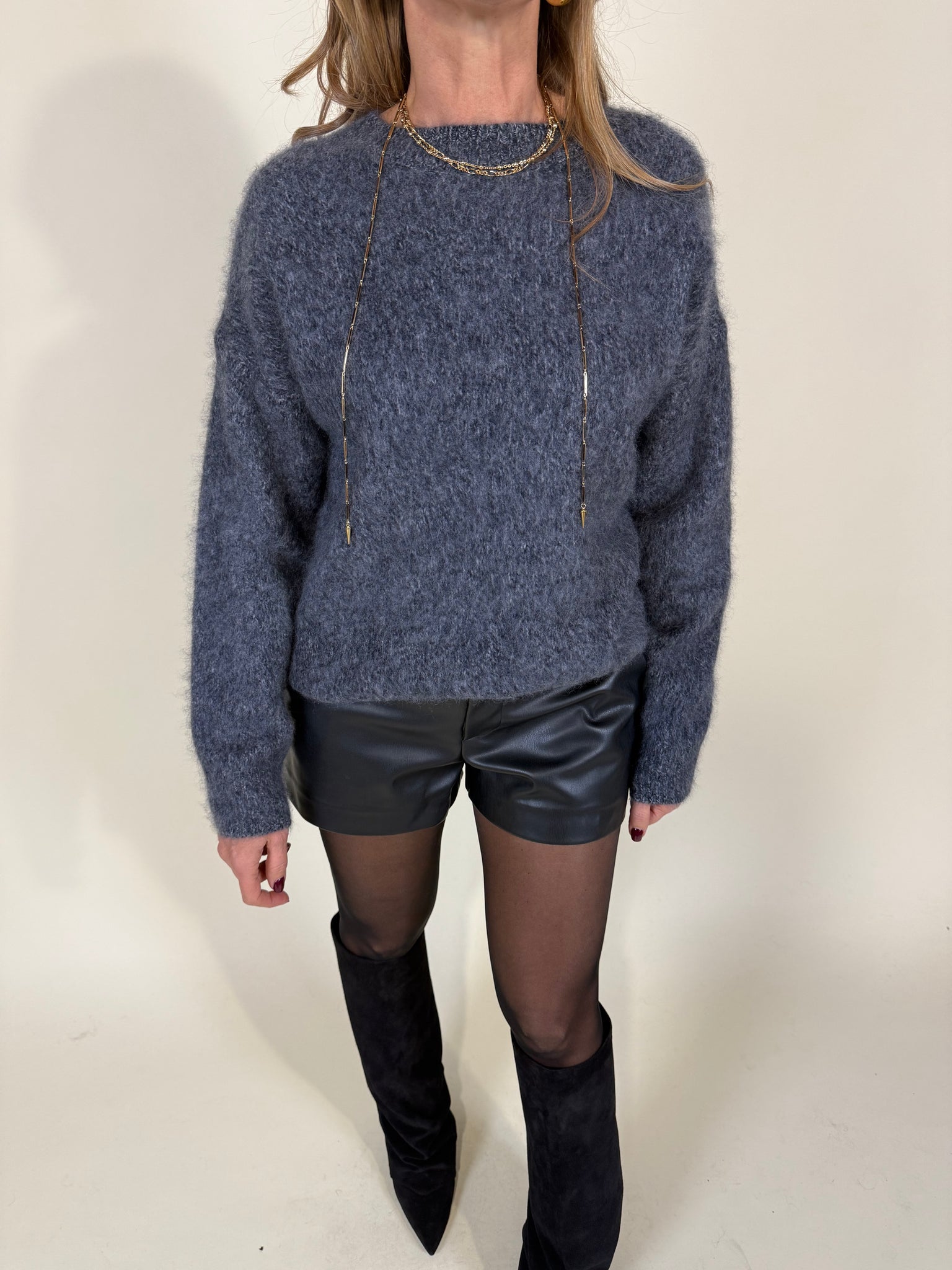 Maglione colorato modello oversize disponibile nelle varianti grigio melange, verdone, rosa, turchese e violetto. Modello con spalla morbida scesa. Modello girocollo.
