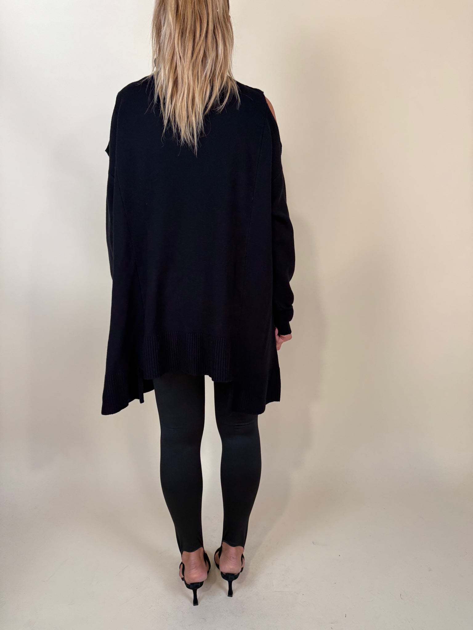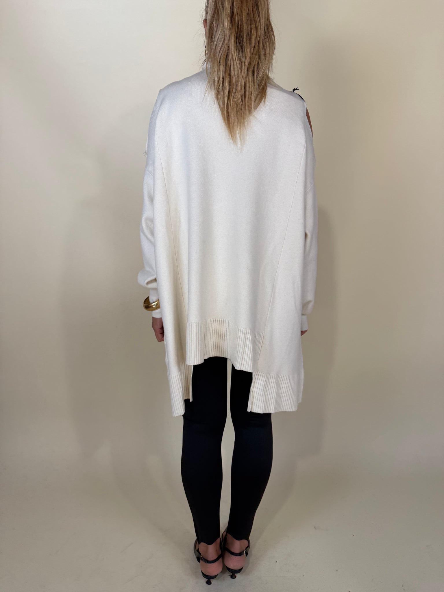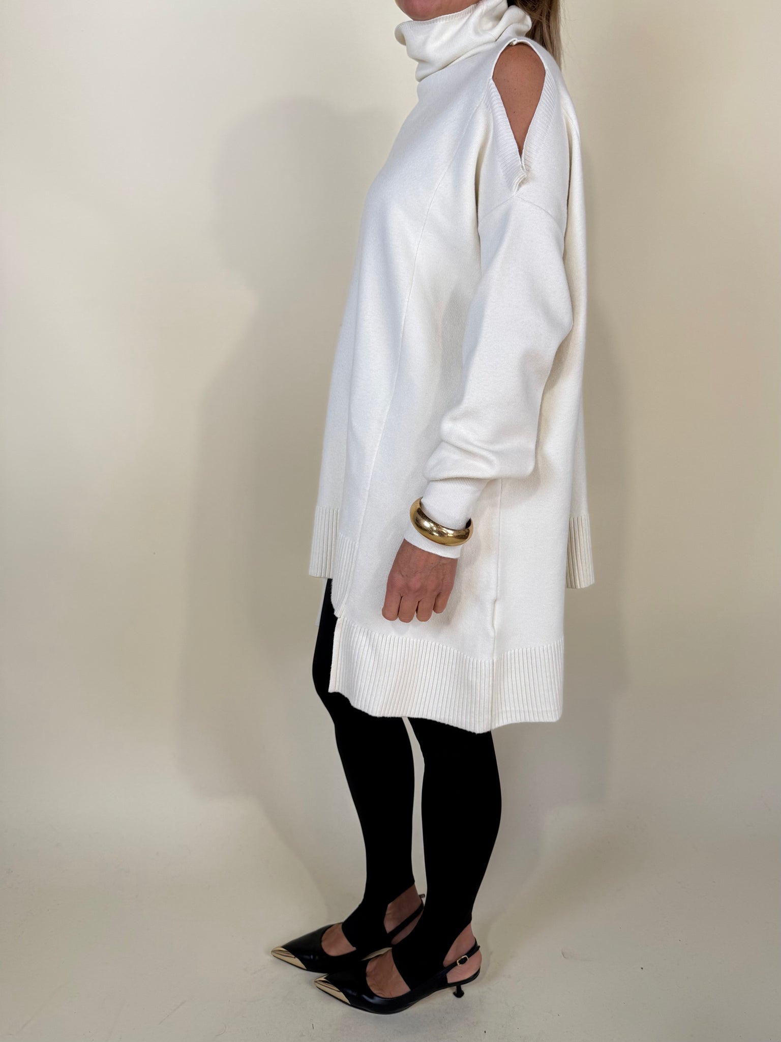 Maxi maglia disponibile nelle varianti colore nera e panna. Dettaglio collo morbido alto e cut sulle spalle. Manica lunga e fondo maglia asimmetrico. Fondo manica con polsino ad elastico.