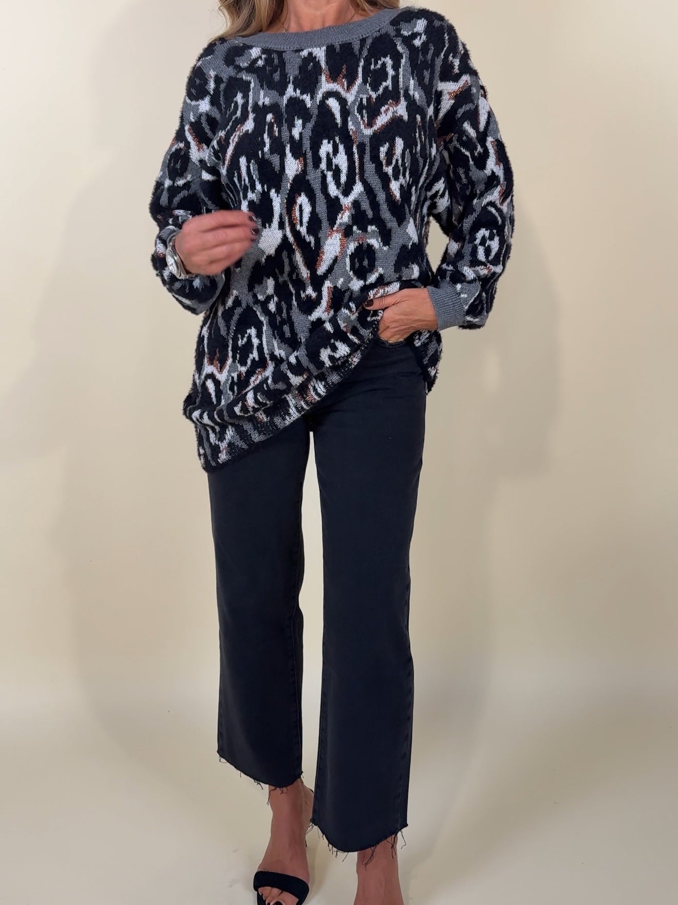 Maxi bull modello oversize disponibile nella variante in stampa animalier sui toni del camel, grigio e del nero. Dettaglio maxi scollo a V sul retro con profilo scollo e polso sui toni del grigio.