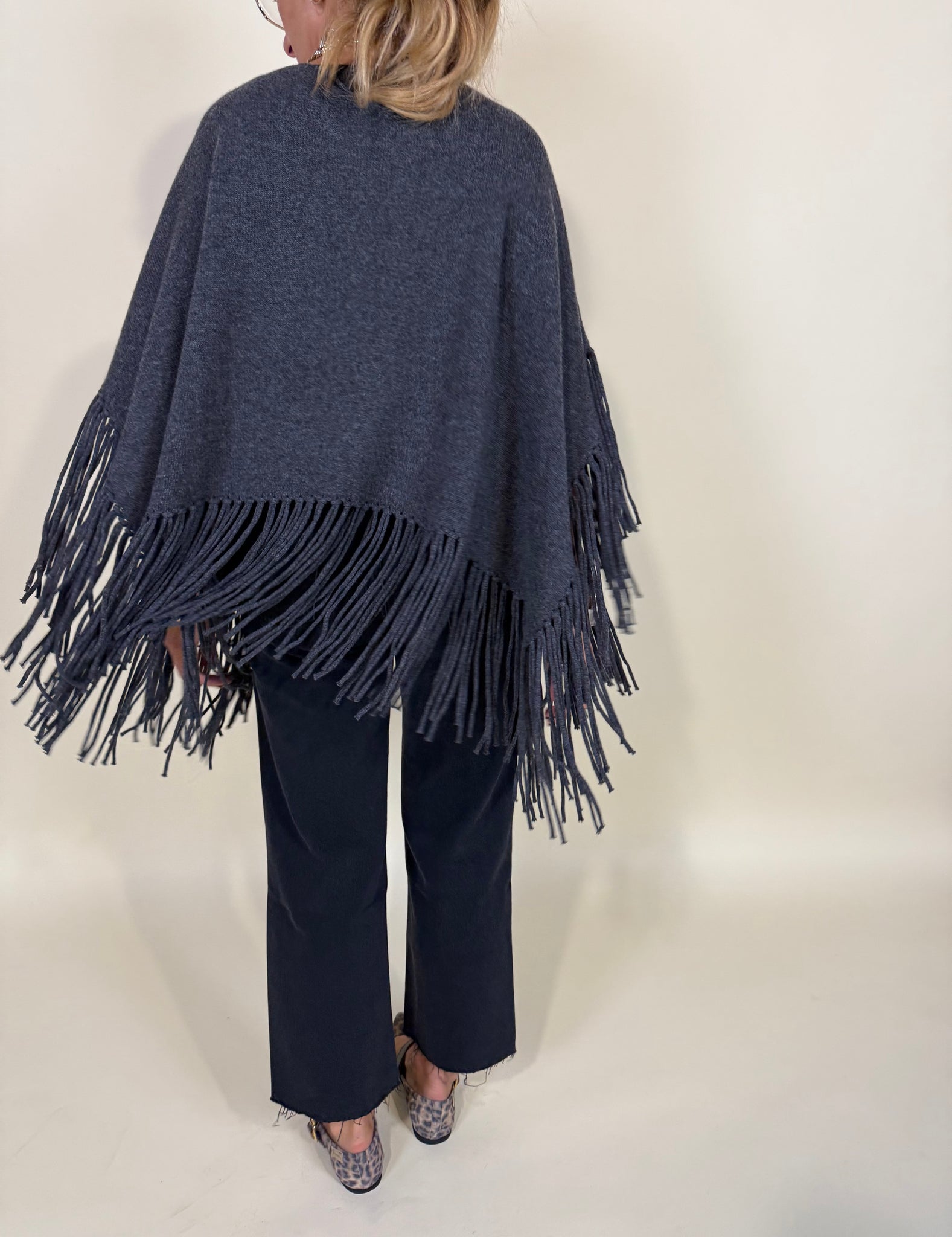 Poncho in 100% lana disponibile nelle varianti colore nero, cammello e grigio. Dettaglio scollo morbido a taglio vivo con frange tono su tono sul fondo cappa su tutta la lunghezza. No maniche.