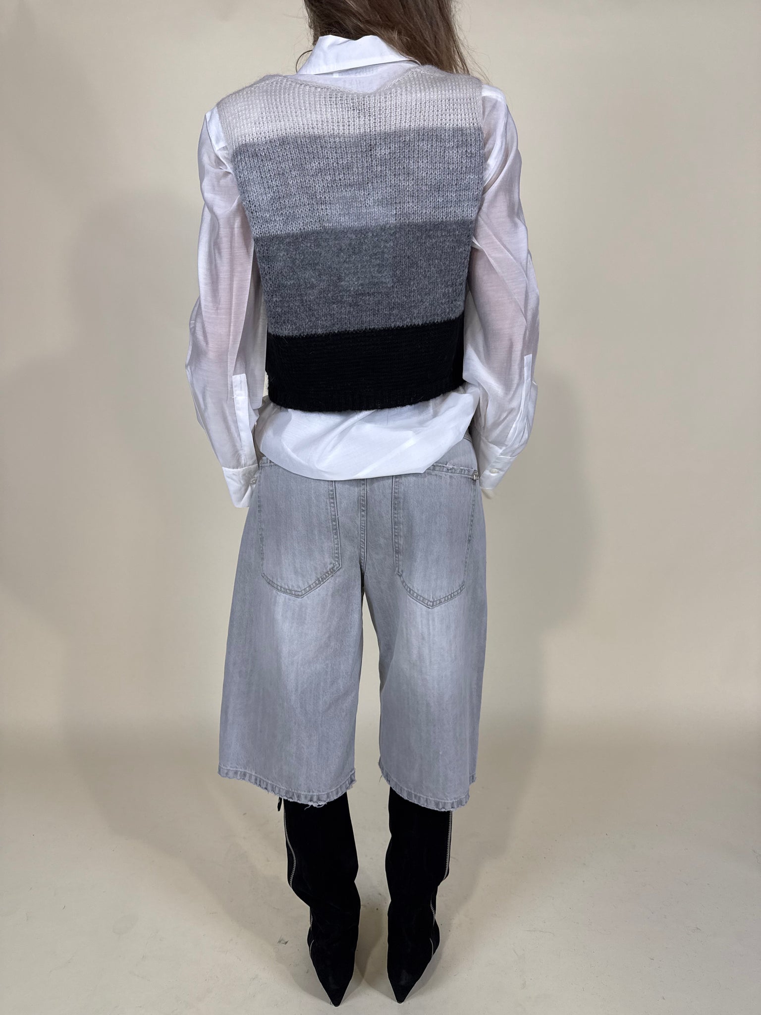 Top crop in maglia in misto mohair in stampa a righe sui toni del grigio e nero. Maglina sottila con scollo tono. Spallina spessa. Colori in ordine cromatico dal panna al nero.