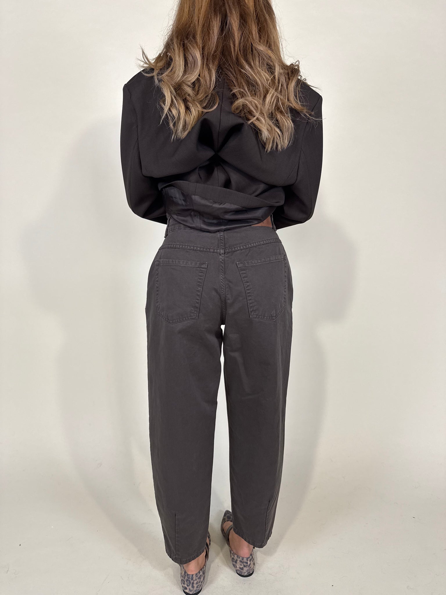 Pantalone modello gamba balloon disponibile nella variante colore unica moro in cotone. Modello gamba ampia e morbida. Modello cinque tasche con chiusura con zip centrale e bottone unico.
