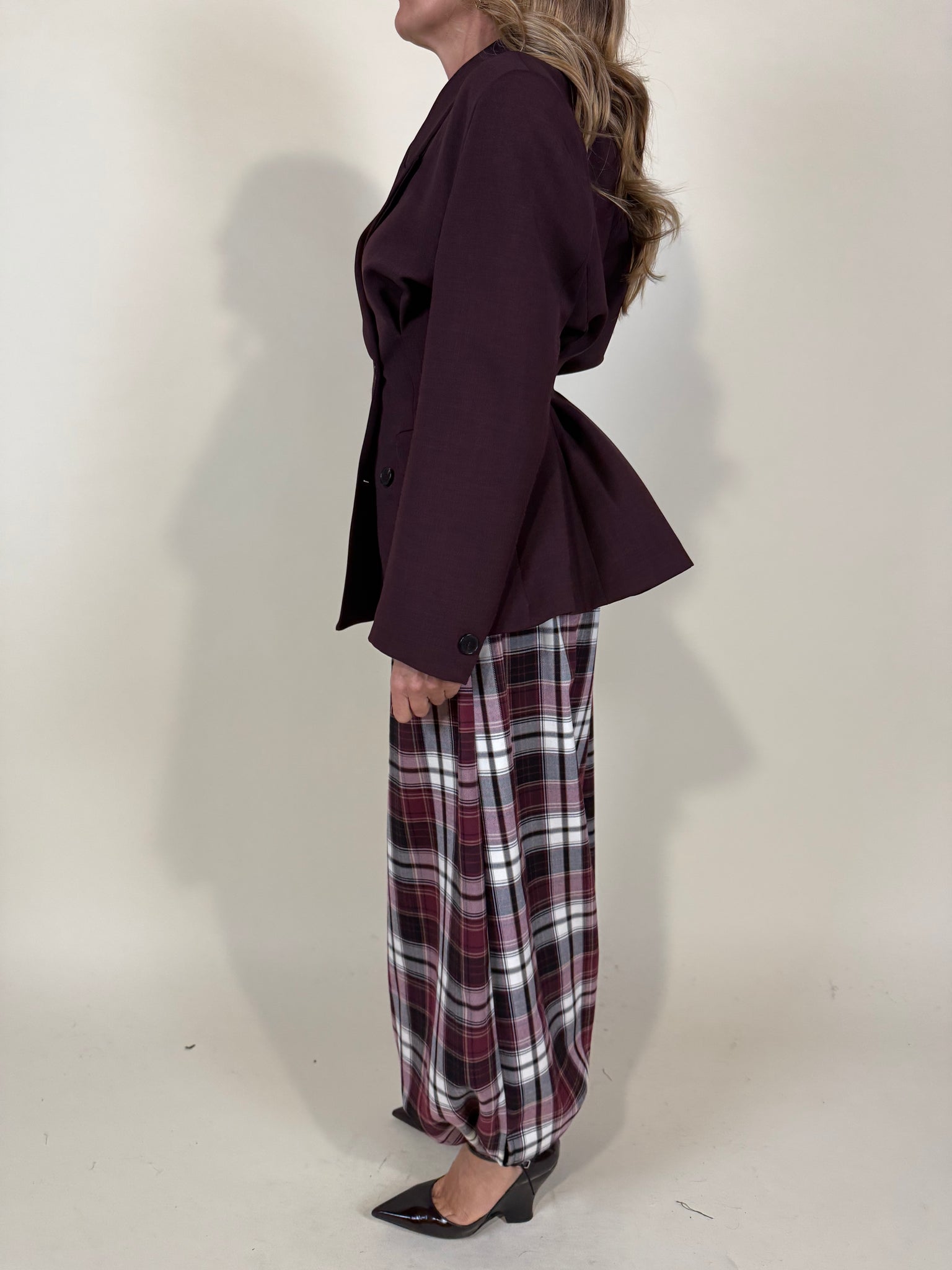 Pantalone modello cargo ballon disponibile in trama check sui toni del rosso e del nero. Modello con elastico in vita.