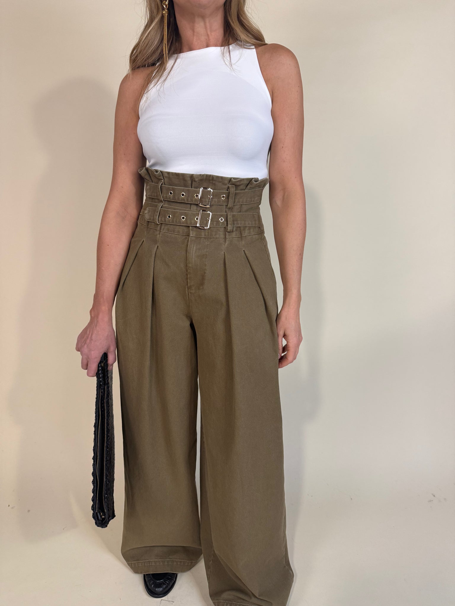 Pantalone modello in cotone gamba ampia e morbida disponibile nella variante colore verde olio. Dettaglio vita alta e maxi fibbie con profilo dorato. Retro liscio con taschine a ricamo taglio classico. Chiusura con zip centrale.