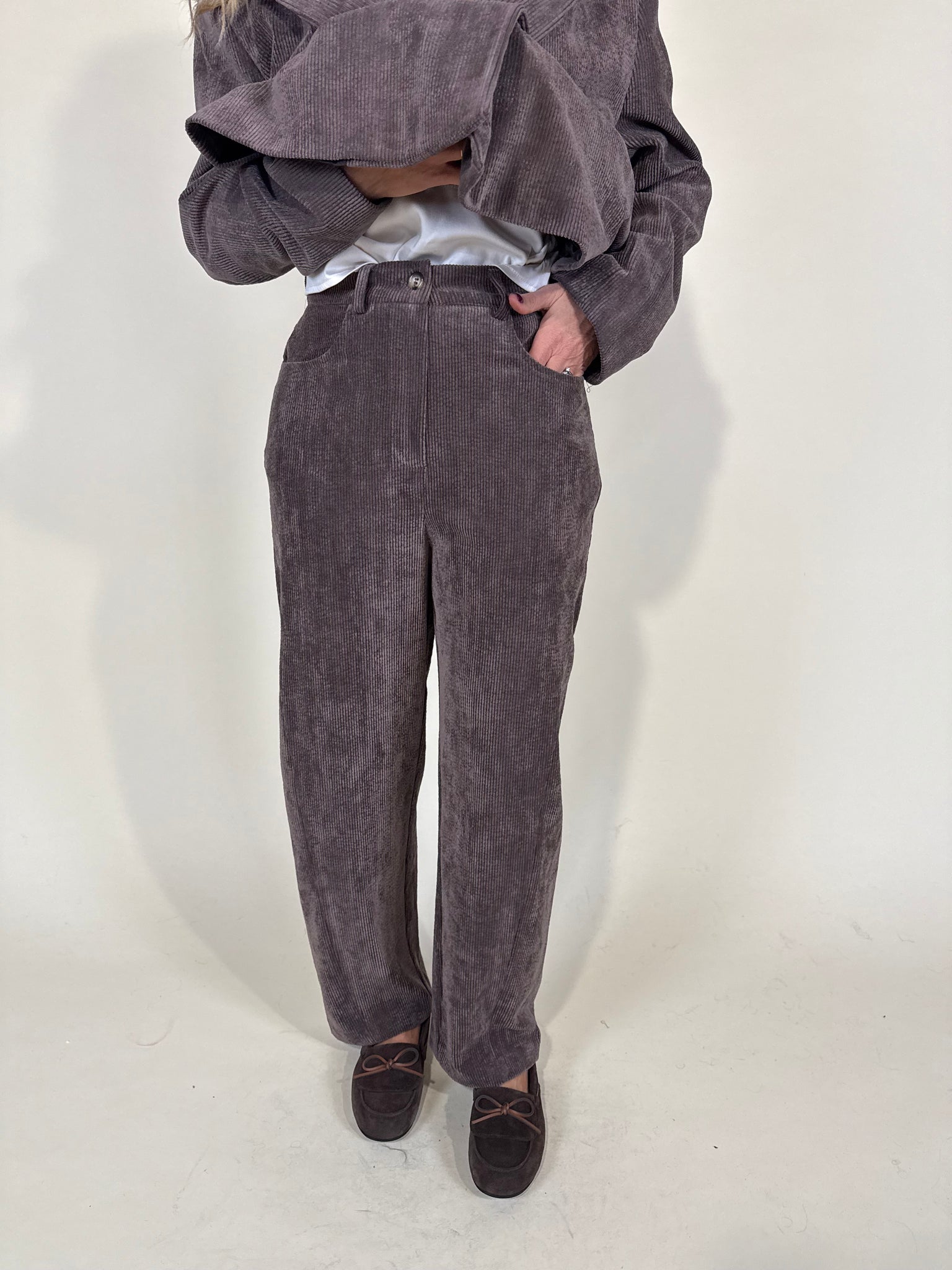 Pantalone morbido in velluto a micro costina nella variante colore unica moro. Modello gamba scivolata e tasche laterali. Modello con cintura annessa a passanti in ecopelle rigida moro con fibbia dorata.