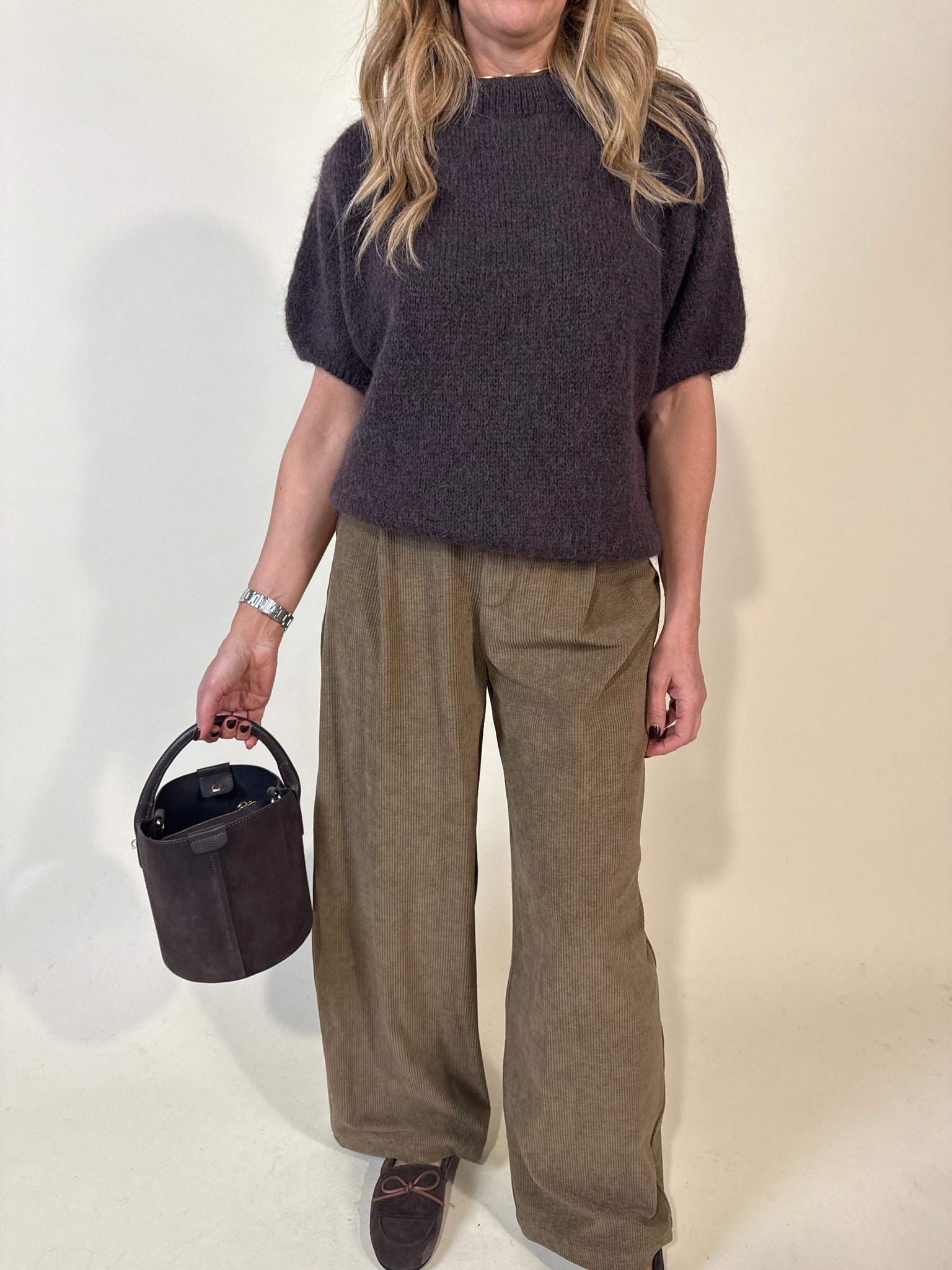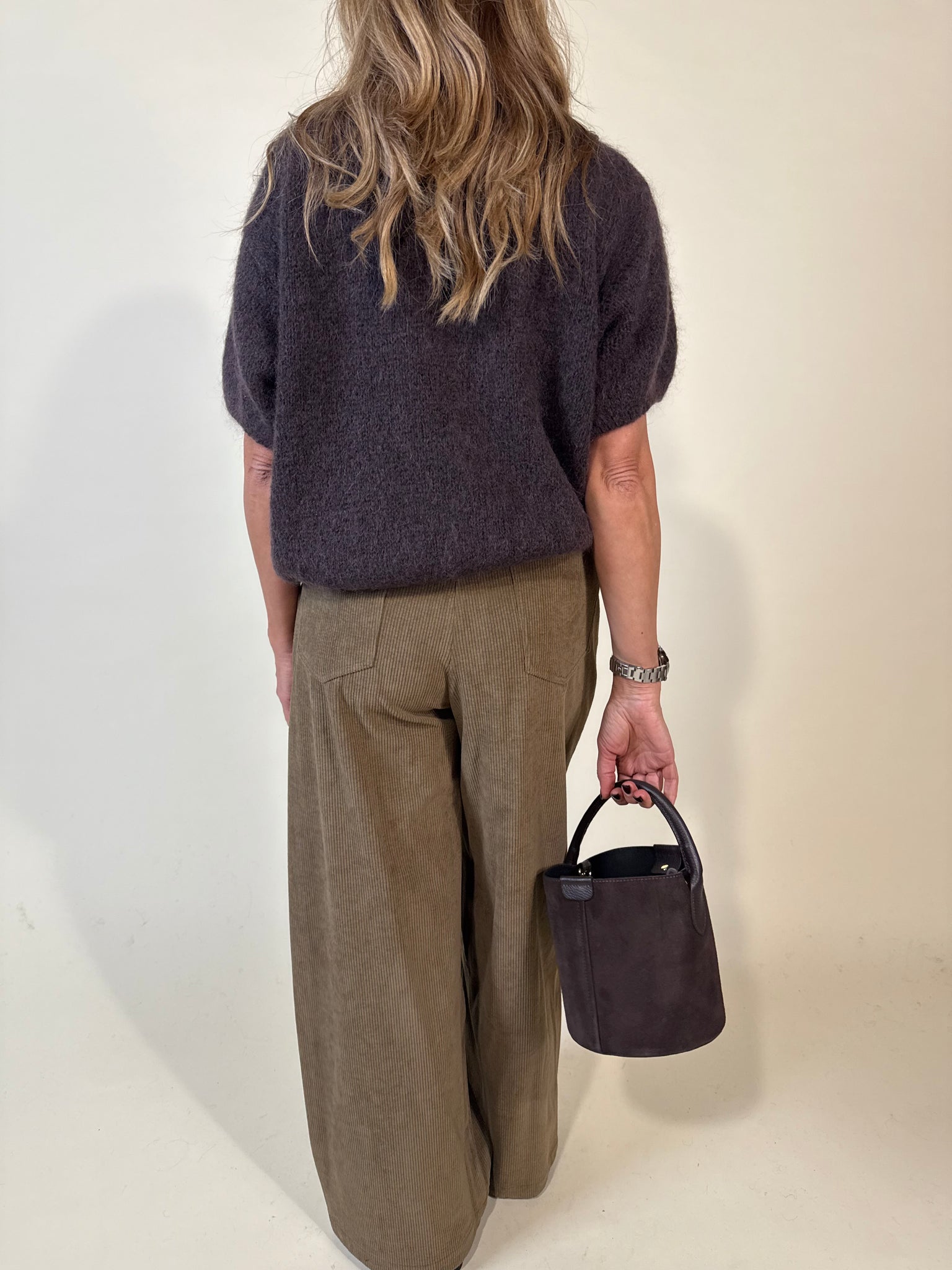 Pantalone gamba ampia nella variante colore verde oliva con tessuto a micro costina. Dettaglio pence sulla lunghezza gamba. Chiusura con bottone unico centrale e zip.
