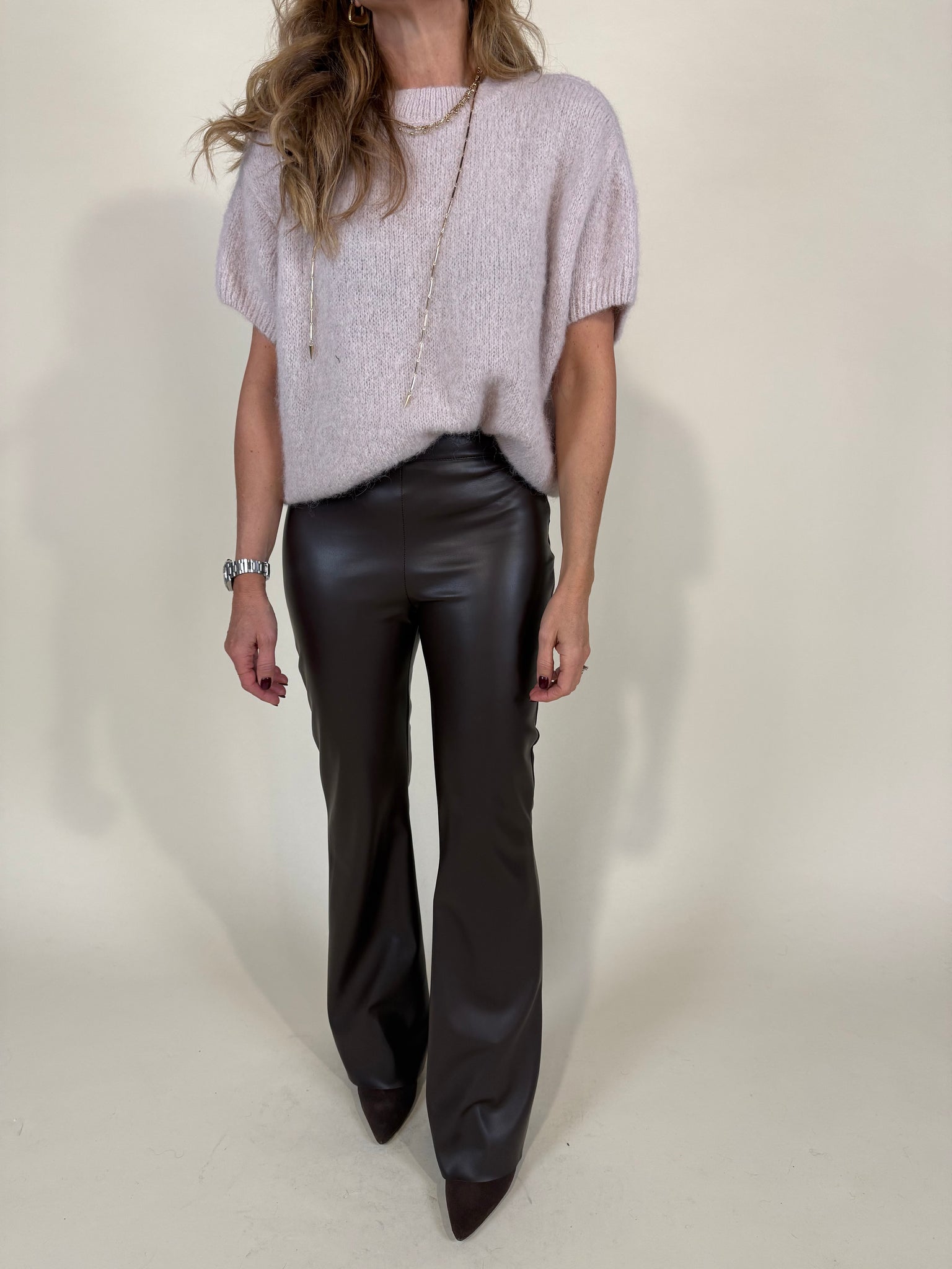 Pantalone in ecopelle modello zampetta disponibile nelle varianti colore moro, vino e nero. Modello liscio senza tasche e chiusura con zip tono su tono laterale. Modello gamba asciutta con fondo a zampetta leggera.