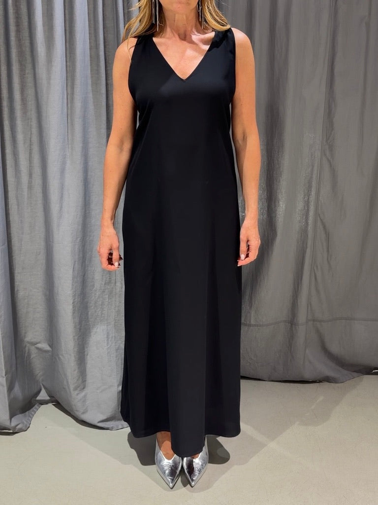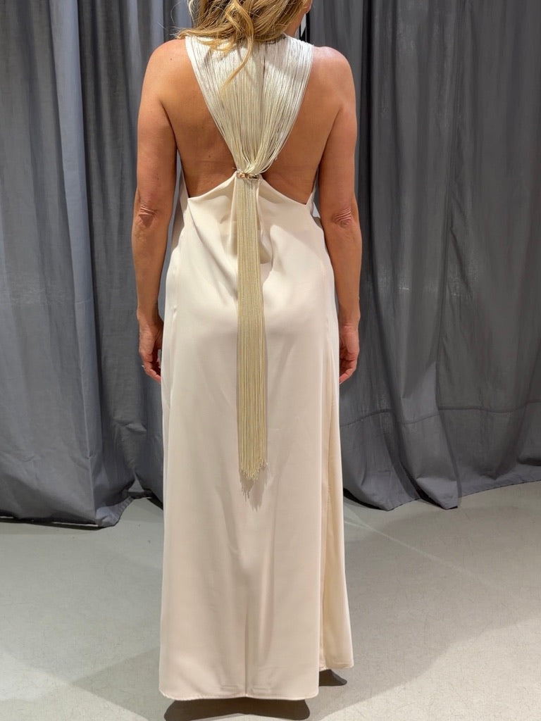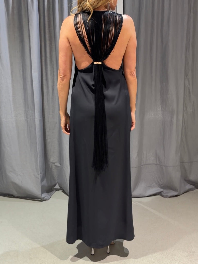 Abito lungo sartoriale disponibile nelle varianti colore nero e avorio. Modello smanicato con maxi dettaglio sulla schiena drappo a frangia tono su tono con gioiello e strascico. Modello coprente morbido. Scollo leggero a V frontale.