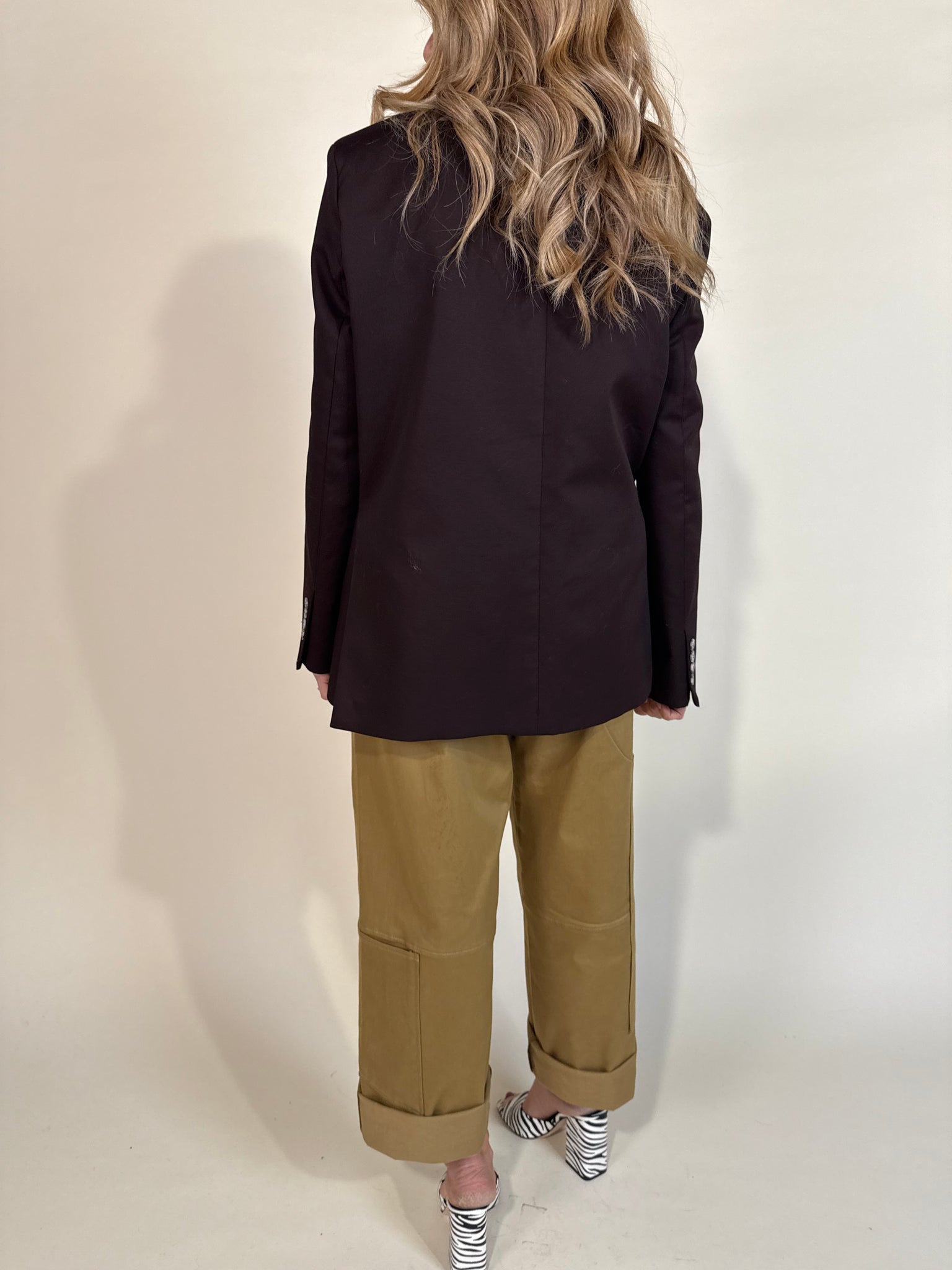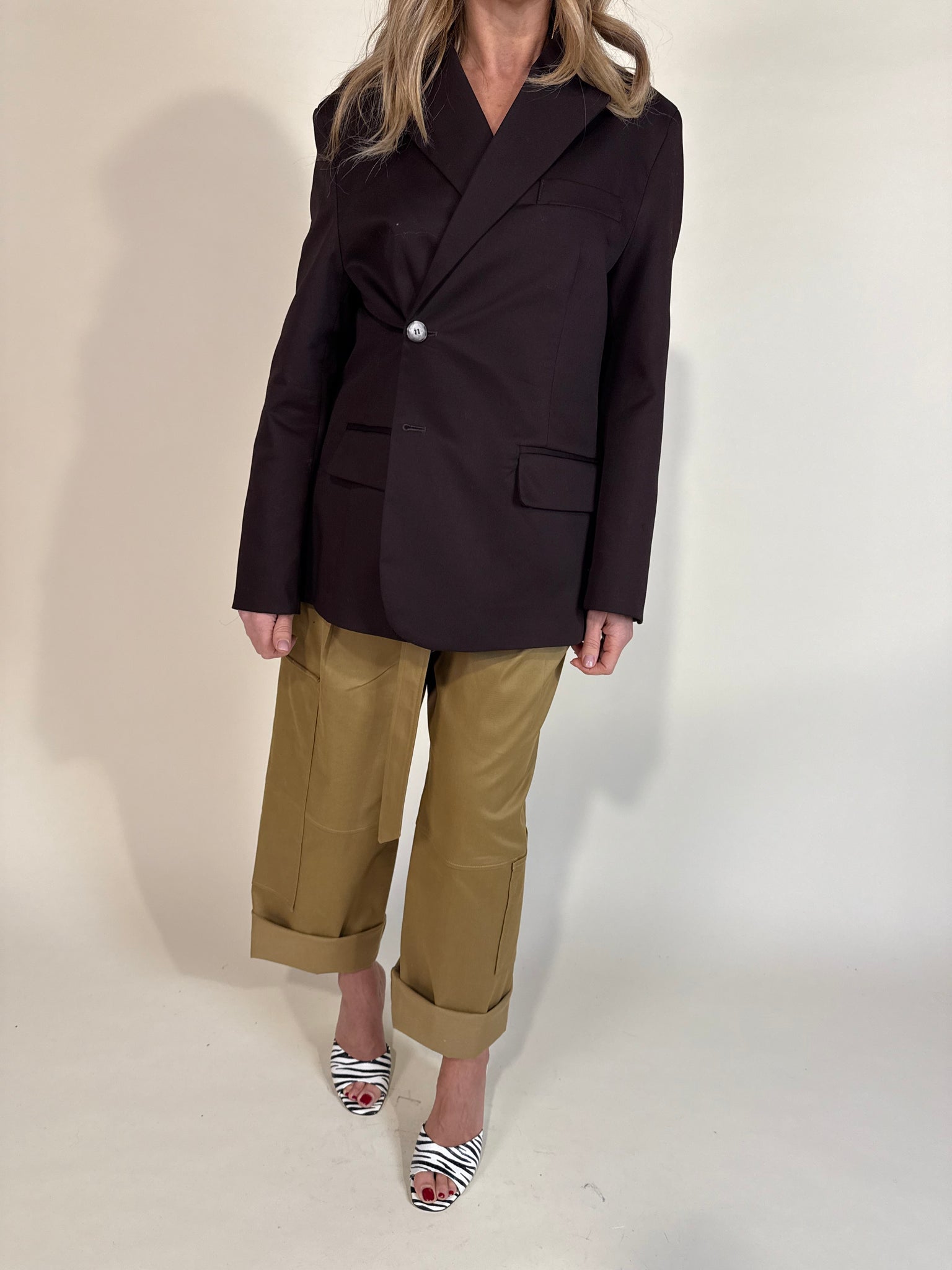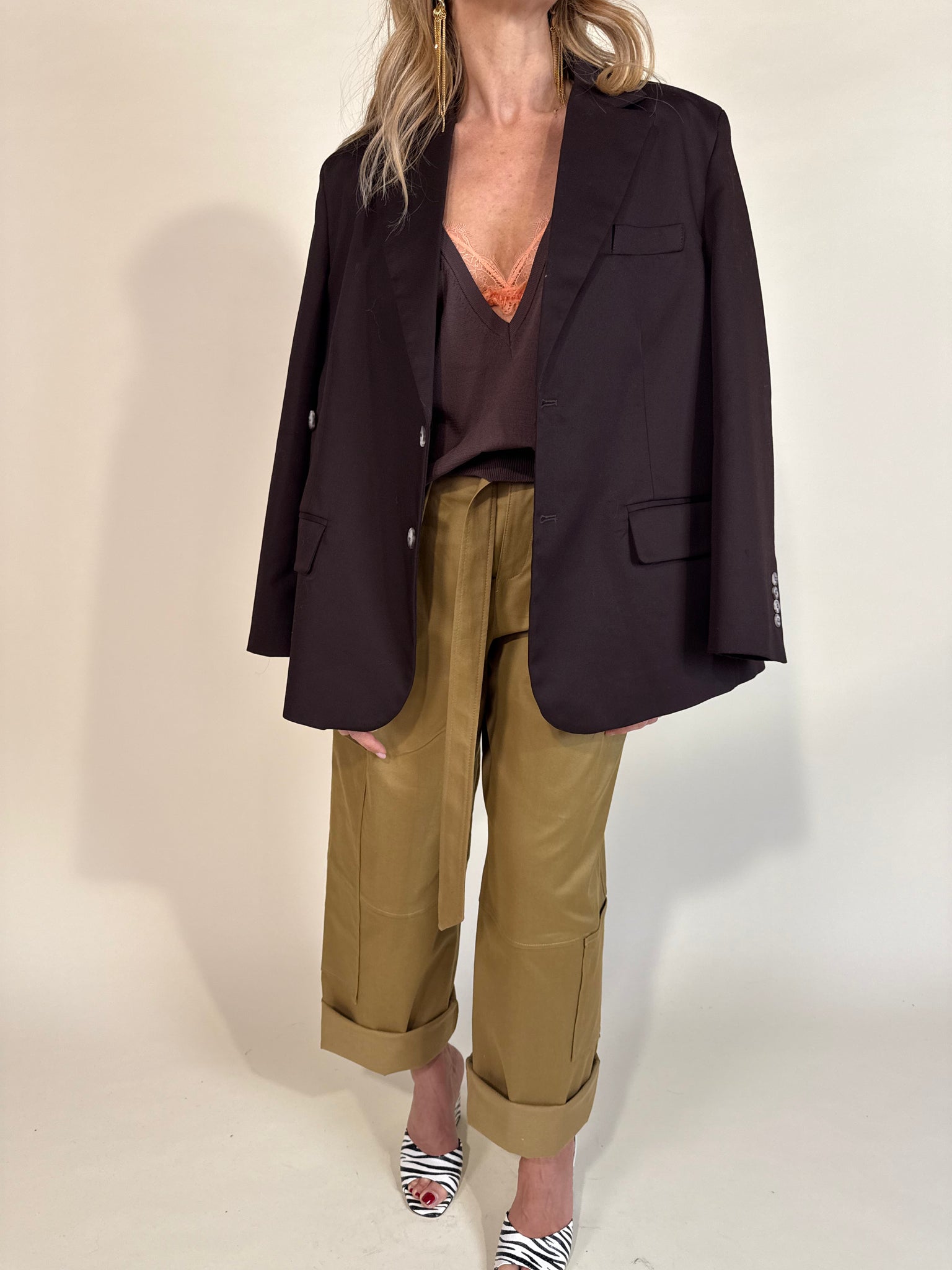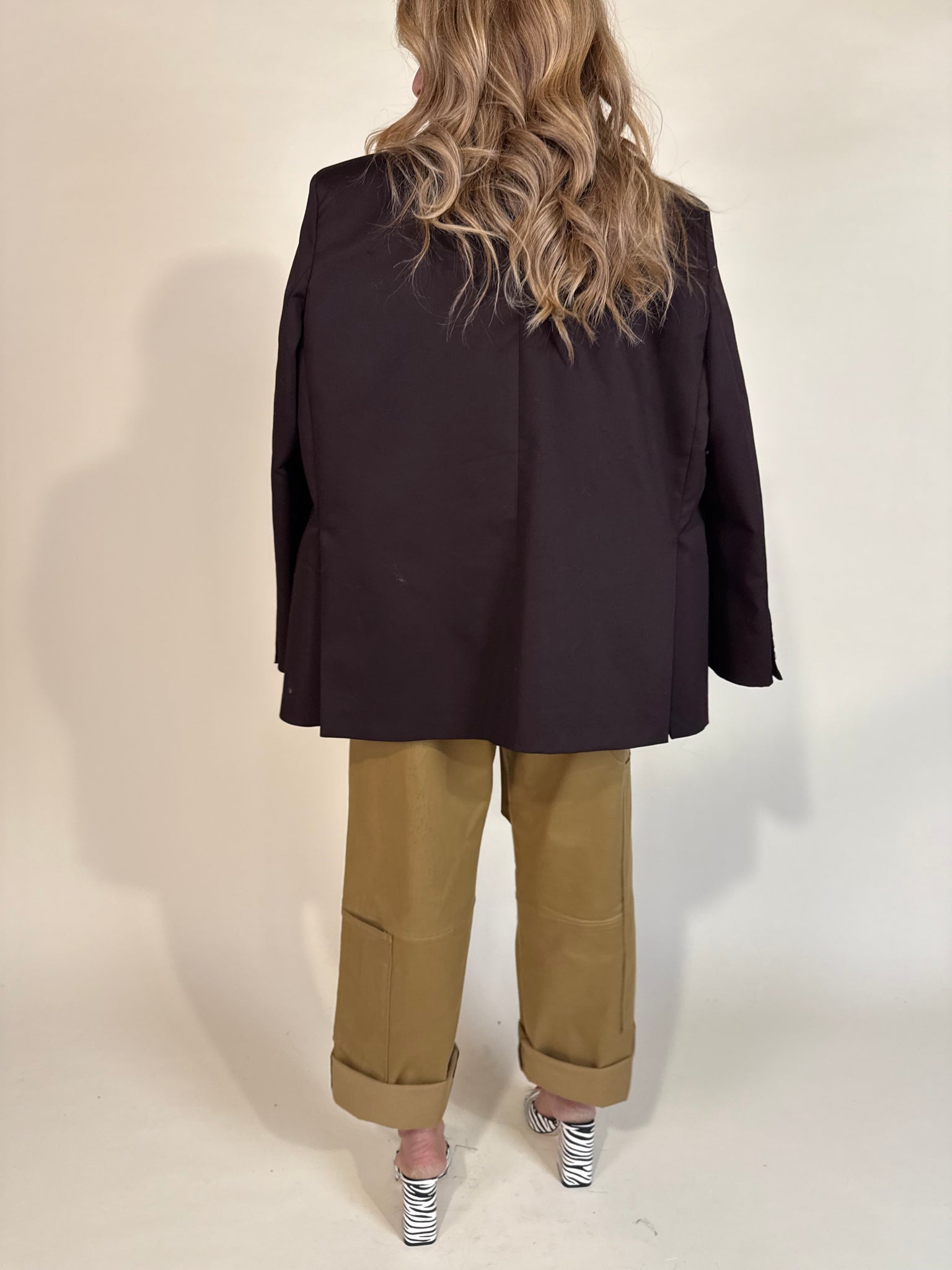 Blazer modello oversize disponibile nella variante colore moro e camel. Modello in cotone con doppia chiusura a bottoni a contrasto e chiusura laterale. Modello con rever ampi e taschine classiche applicate frontali. Fodera interna tono su tono.