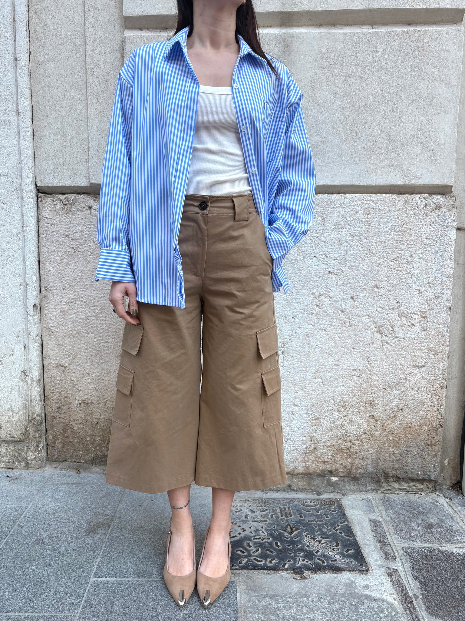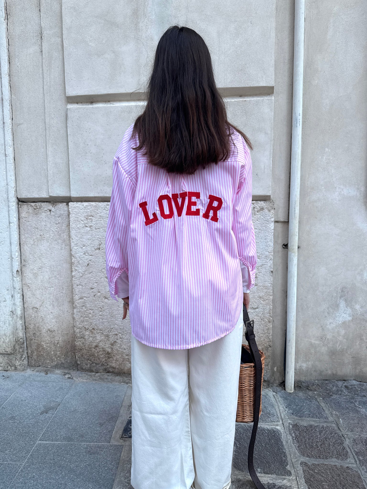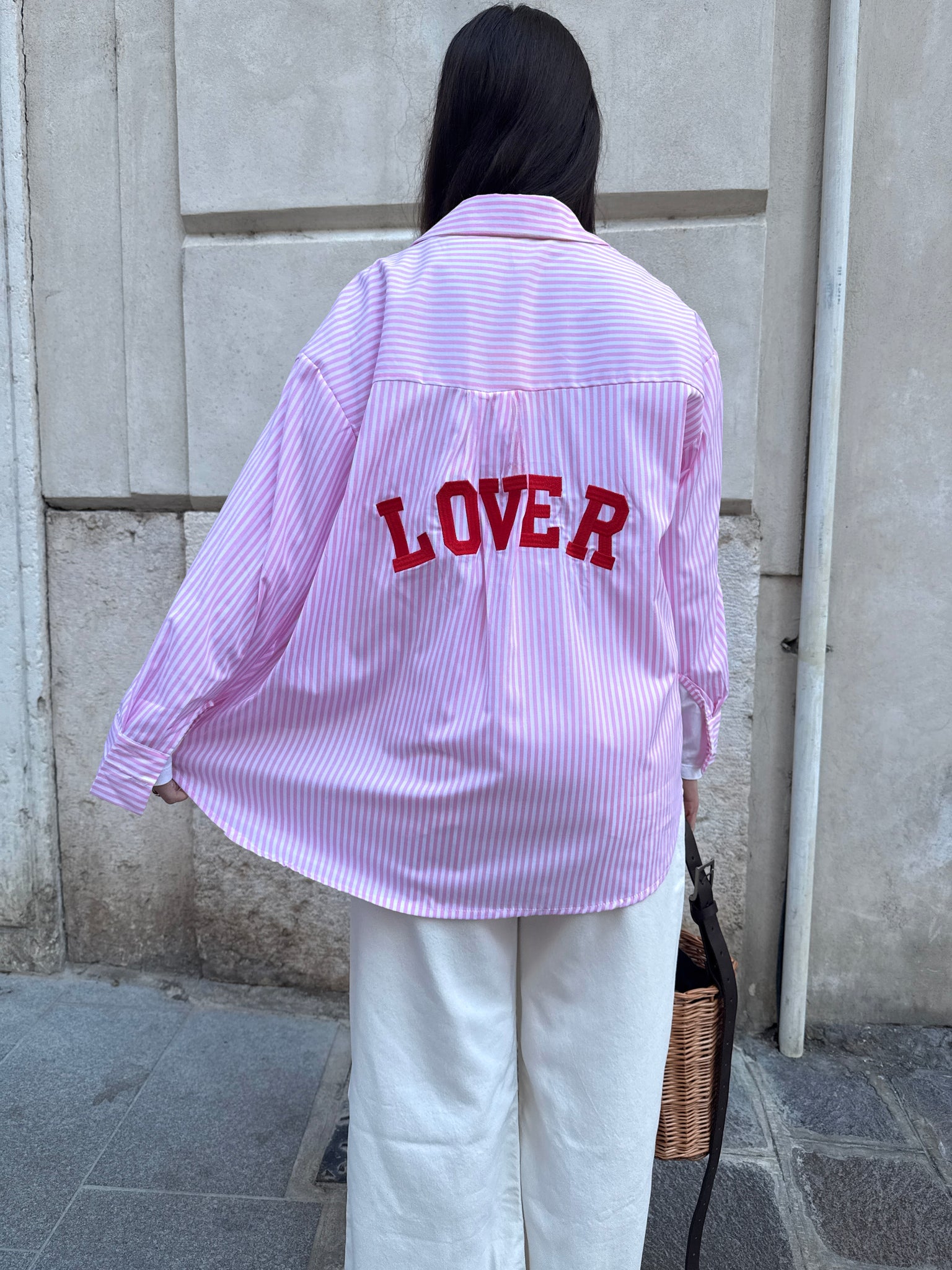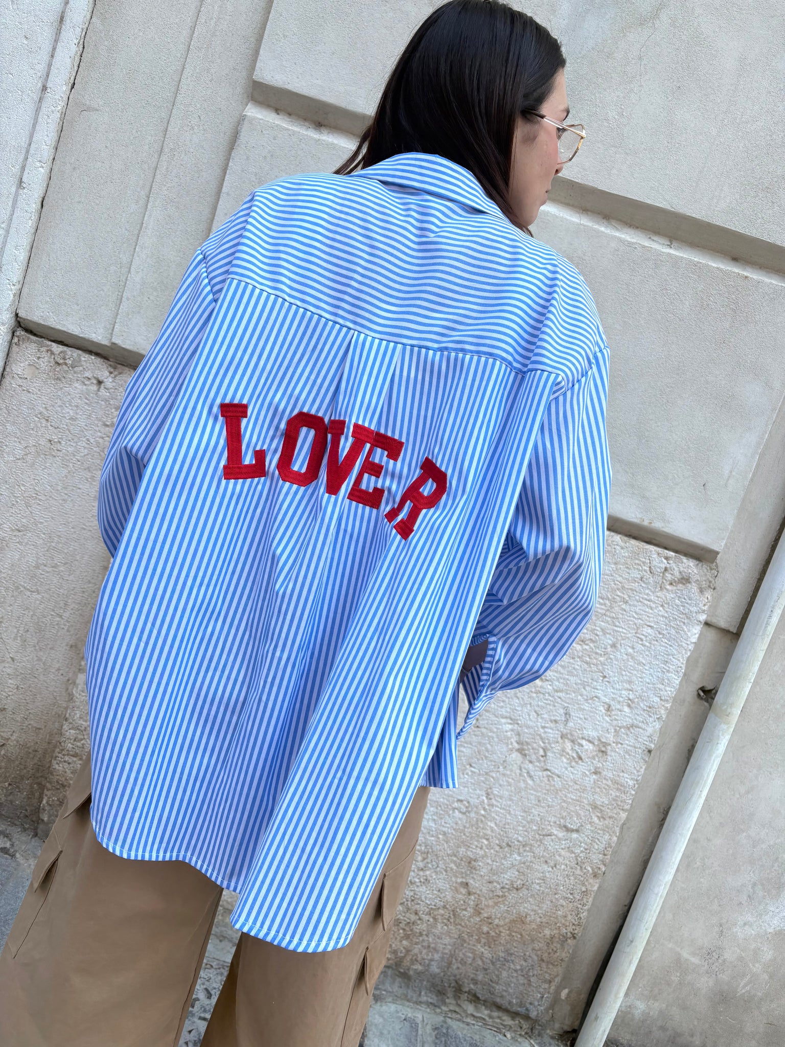 Camicia modello oversize in misto cotone disponibile nella stampa fantasia trama a righe con riga azzurra oppure riga rosa. Chiusura bottoni frontali con colletto e dettaglio ricamo sul retro a contrasto LOVER.