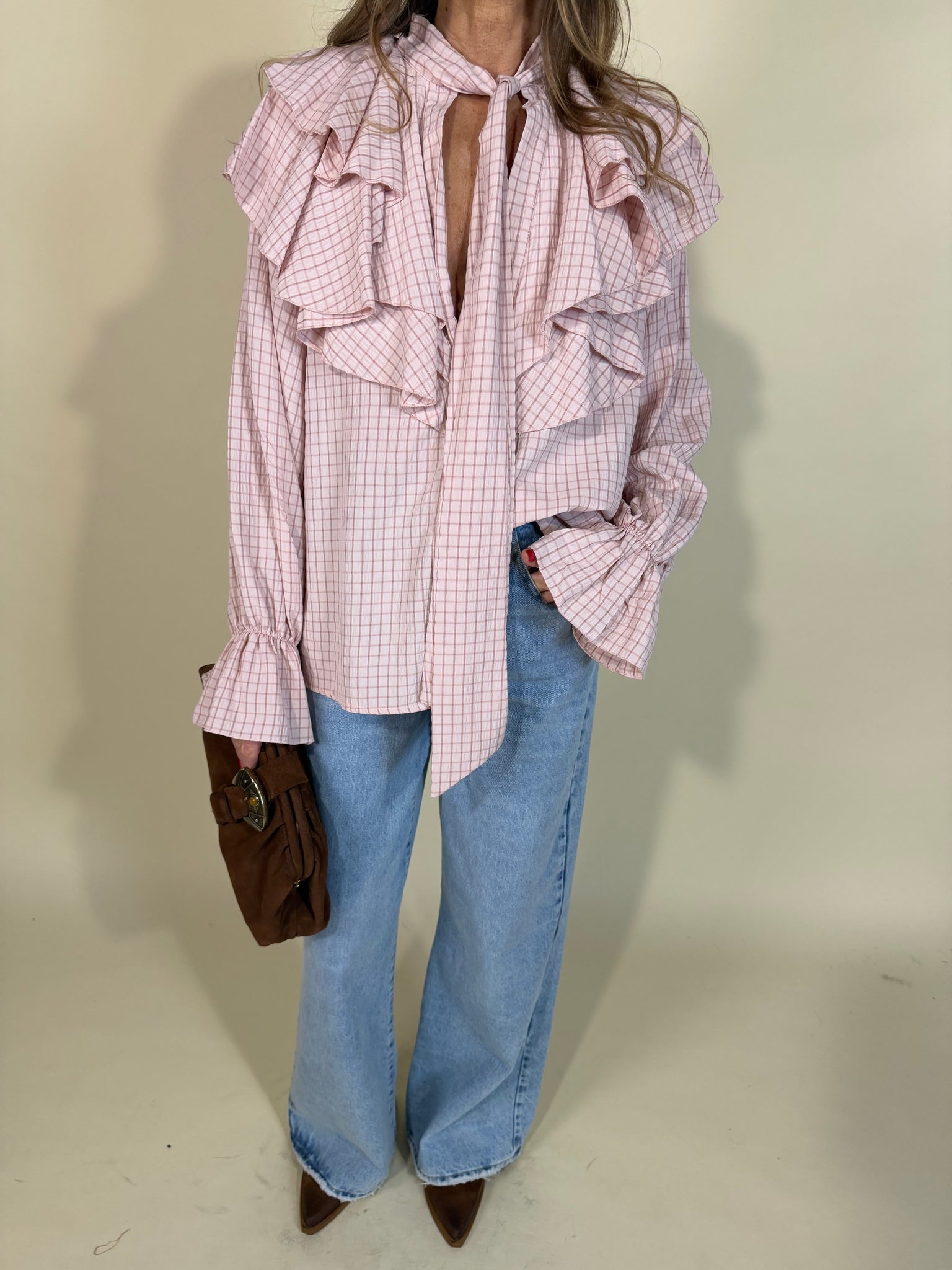Camicia modello morbido oversize disponibile nella variante colore unica rosa pastello con trama a quadri tono su tono. Modello con con fiocco a laccetti e volant frontali e sulla schiena. Chiusura con bottoncini tono su tono frontali. Manica lunga con con fondo a clessidra e polso ad elastico.